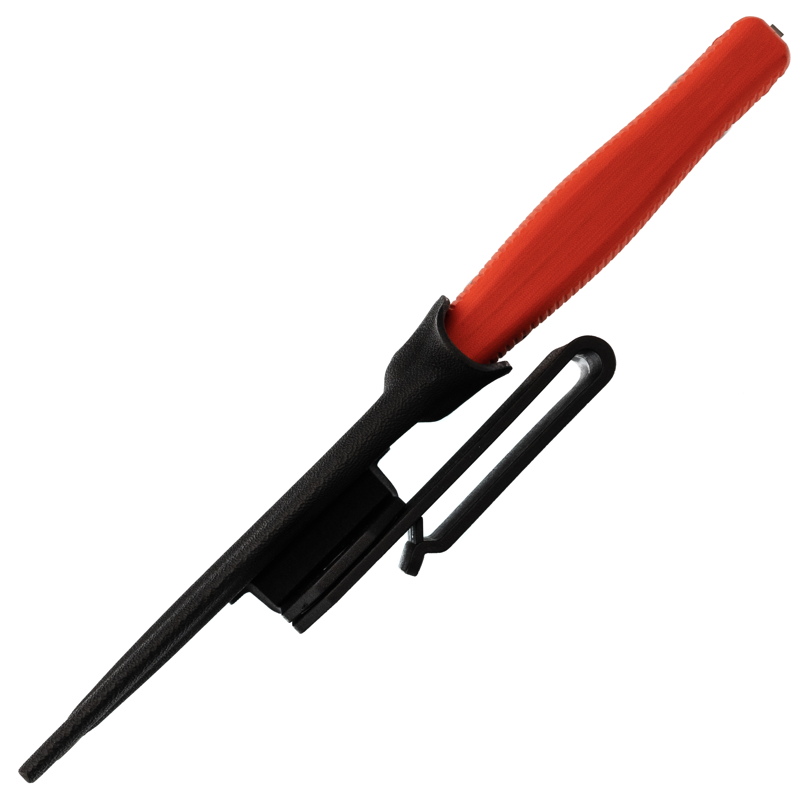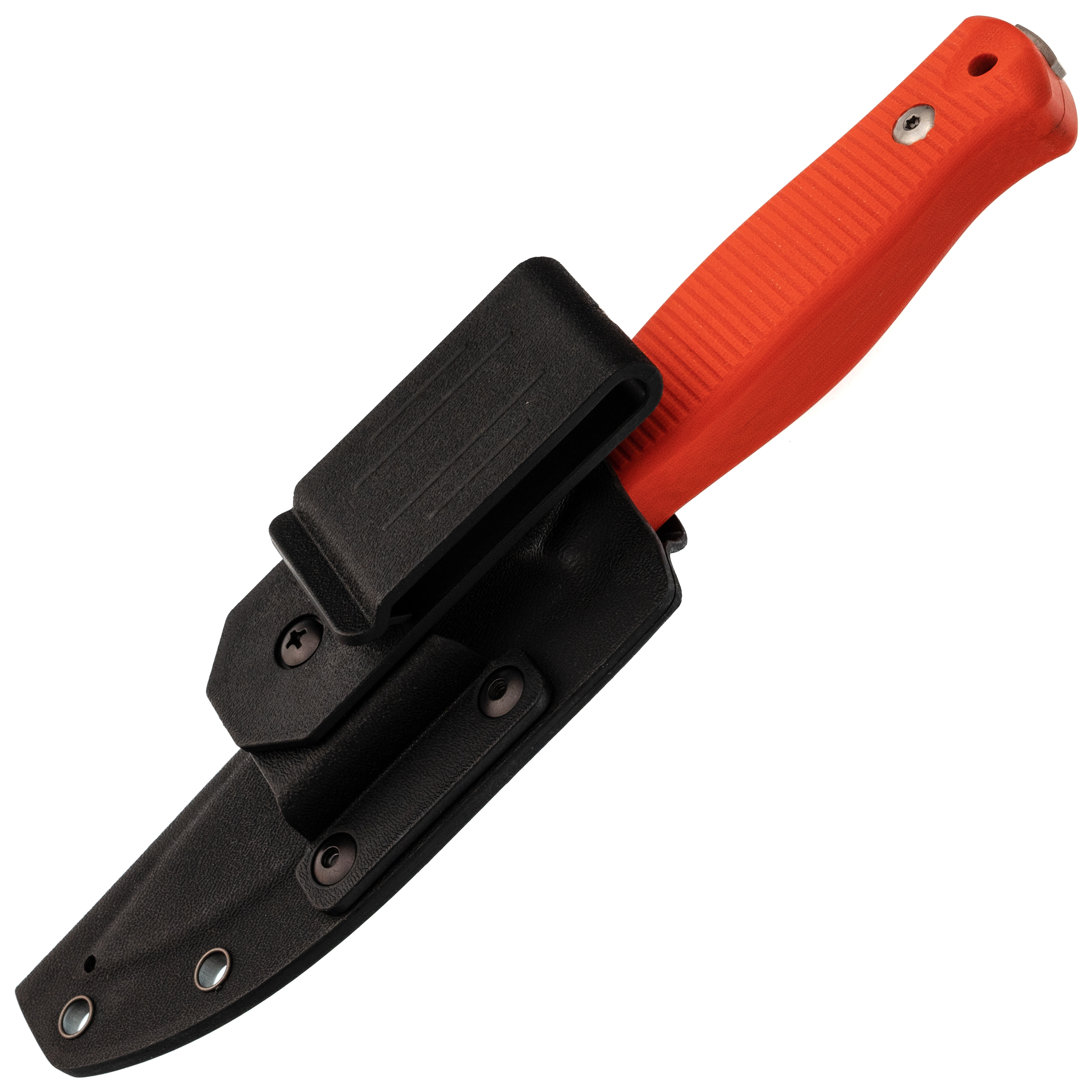 Ножны из Кайдекса, легкие и жесткие. Конструкция типа тако держит нож за счет трения, защелки не нужны. В комплекте сразу два типа крепления: обычная клипса для вертикального ношения и Tek-Lok для горизонтального. Плюс есть отверстия под стяжки или шнурки - можно приспособить под любую систему крепления на рюкзак или разгрузку.