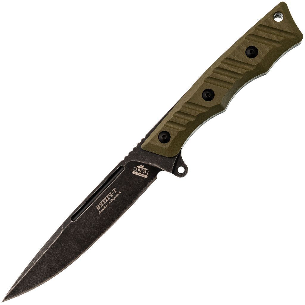 Вятич Т - это полноразмерный фиксированный нож, который сочетает в себе функциональность и универсальность. Он станет надежным инструментом как для туристов и любителей активного отдыха, так и для тех, кто предпочитает тактические задачи.Клинок изготовлен из высококачественной стали D2, обеспечивающей отличную остроту и высокую прочность. Эта сталь известна своей способностью долго сохранять заточку, что делает нож эффективным в различных условиях. Чтобы предотвратить коррозию, клинок покрыт черным покрытием, что также придает ему привлекательный внешний вид. Геометрия клинка позволяет эффективно выполнять различные задачи: от точного резания до строгания и даже батонинга.Рукоять Вятича Т выполнена из металла с накладками из стеклотекстолита G10 - материала, известного своей прочностью и устойчивостью к воздействию окружающей среды. Такое сочетание обеспечивает надежный и комфортный хват. Форма рукояти с подпальцевым упором позволяет уверенно удерживать нож даже при длительном использовании.Ножны, изготовленные из пластика, являются еще одним преимуществом этого ножа. Они удобны в ношении и могут быть подвешены на ремень или разгрузочный жилет, что делает нож всегда готовым к использованию в любой ситуации. Такое универсальное крепление подойдет как для повседневного ношения, так и для экстремальных условий.
