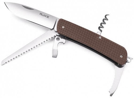 Нож (длинное лезвие, пила по дереву, инструмент для закручивания проволоки, открывалка для бутылок, большая отвертка 6,5 мм, инструмент для оголения провода, стропорез, малая отвертка 3 мм, карманная клипса, штопор, стеклобой, кольцо для ключей/темляка, пинцет)
