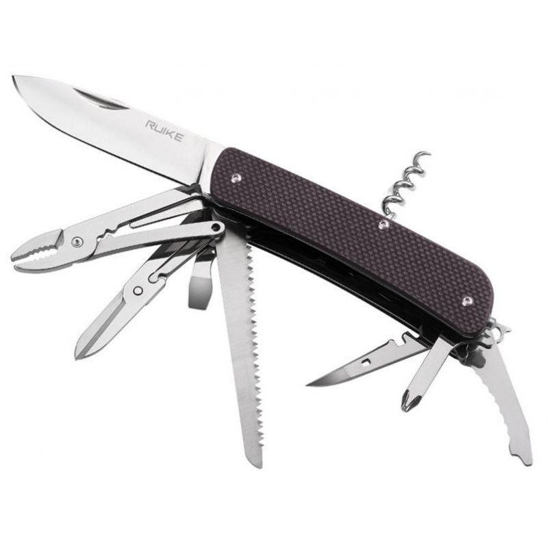 Нож (длинное лезвие, плоскогубцы, кусачки для проволоки, плоскогубцы для лески, ножницы, инструмент для закручивания проволоки, открывалка для бутылок, большая отвертка 6,5 мм, инструмент для оголения провода, пила по дереву, скальпель, шило, инструмент для работы с проводом, ключ для велосипедных спиц, отверстие для продевания нити, отвертка Philips, стропорез, малая отвертка 3 мм, карманная клипса, штопор, стеклобой, кольцо для ключей/ темляка, пинцет)
