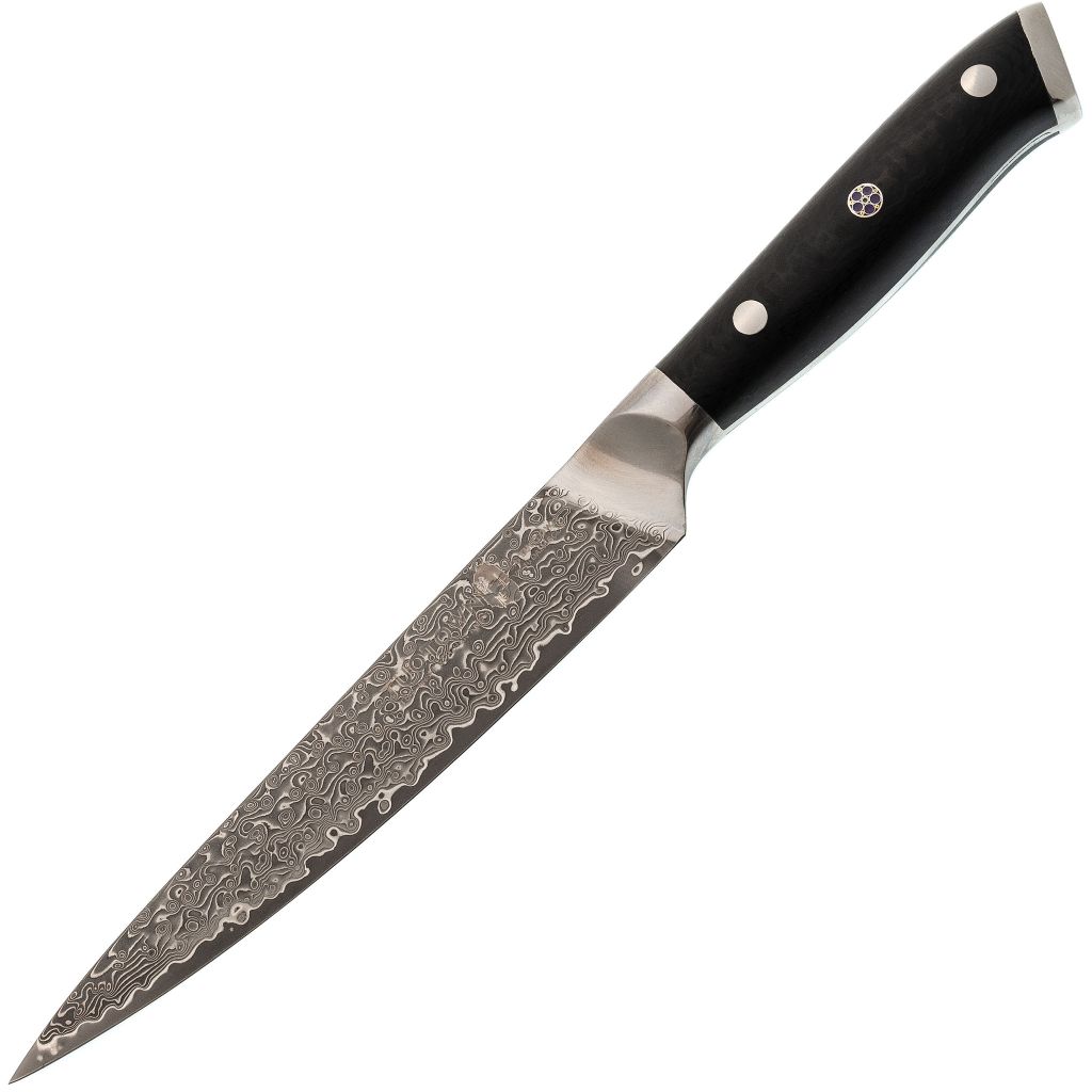 TuoTown Универсальный - это кухонный нож, который справится с любым заданием. Его размер и универсальность позволяют легко нарезать как крупные ингредиенты, так и мелкие овощи. Клинок из премиальной стали VG-10 гарантирует остроту и долговечность, а также защищает от коррозии.Отличительная особенность этого ножа - его геометрия: высокие прямые спуски и тонкий обух обеспечивают невероятную резкость. Такая конструкция идеальна для точной работы, хотя и не предназначена для очень грубых задач.Рукоять из G10 стеклотекстолита - прочная и водостойкая, не впитывает запахи, что очень практично на кухне. Ее эргономичный дизайн обеспечивает комфортное и надежное удержание.Этот нож - настоящий помощник на кухне, сочетающий в себе функциональность, долговечность и привлекательный внешний вид. Он станет надежным инструментом для любого, кто любит готовить.