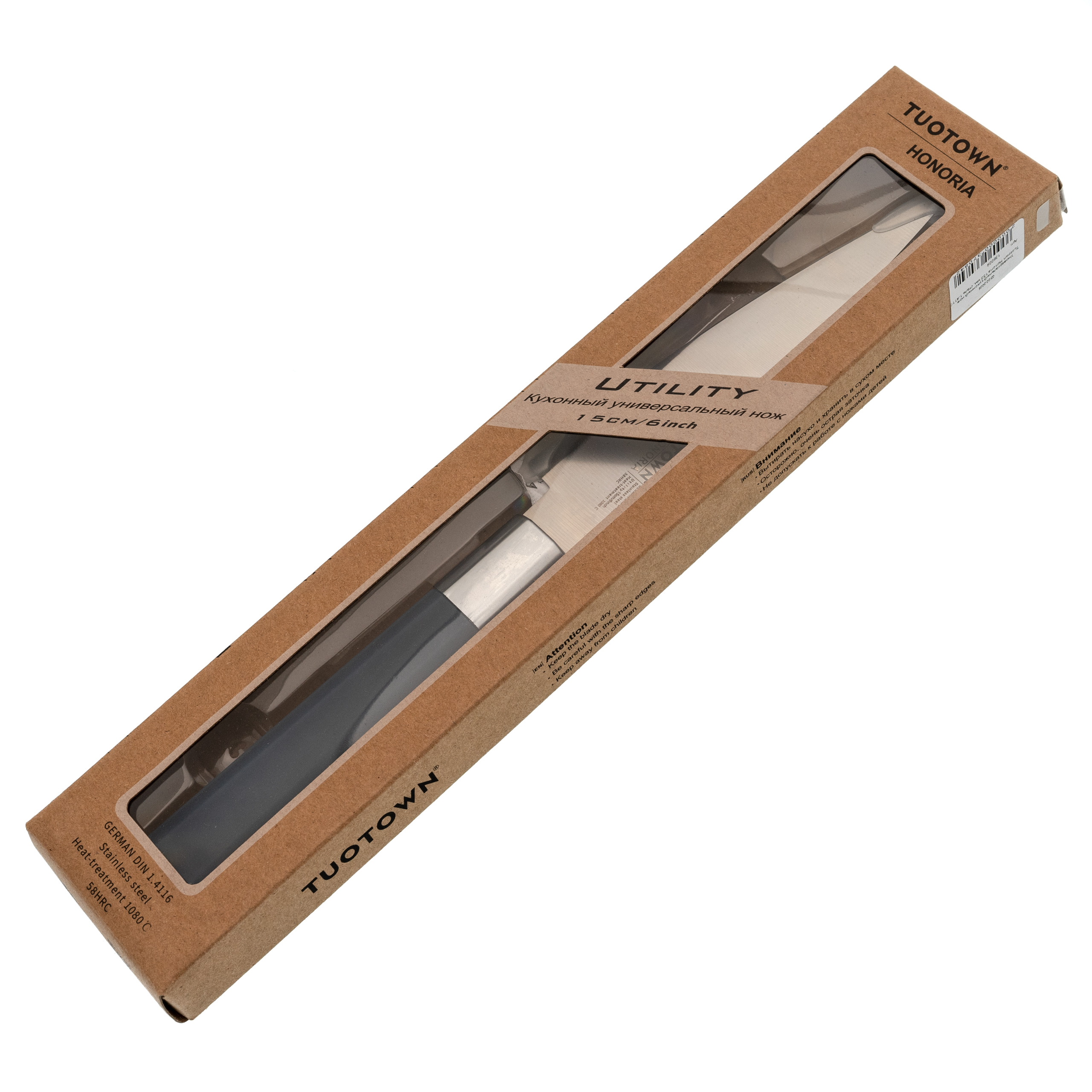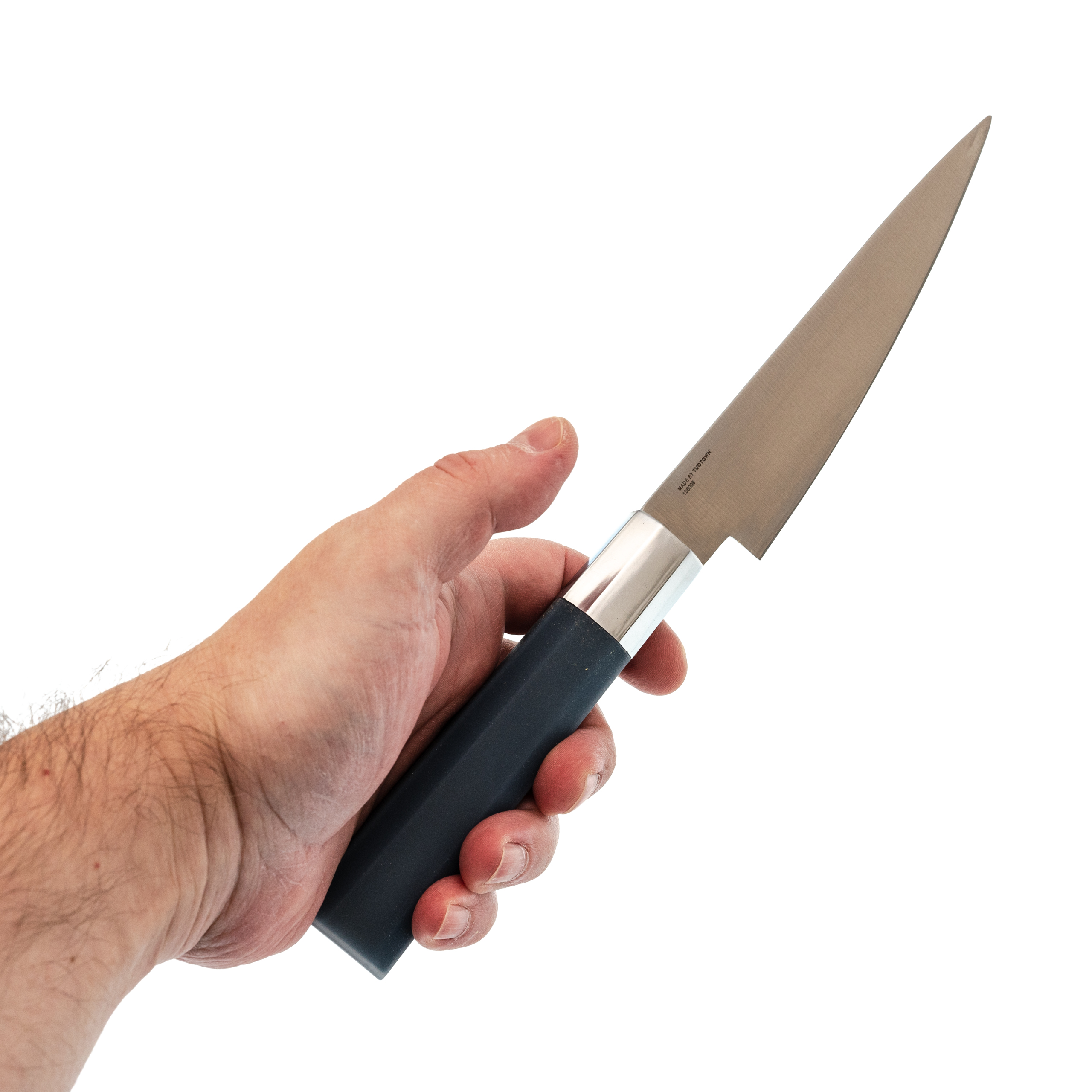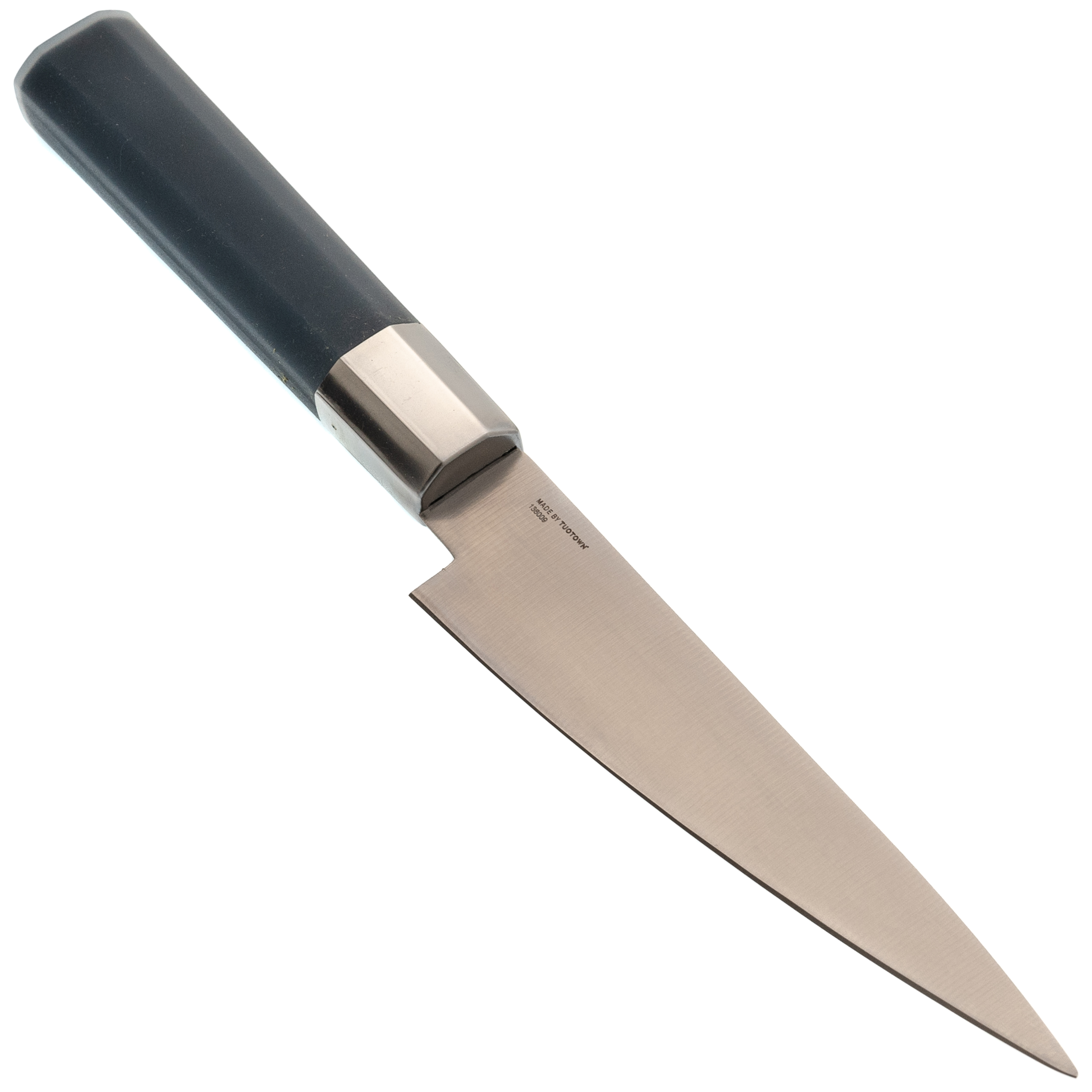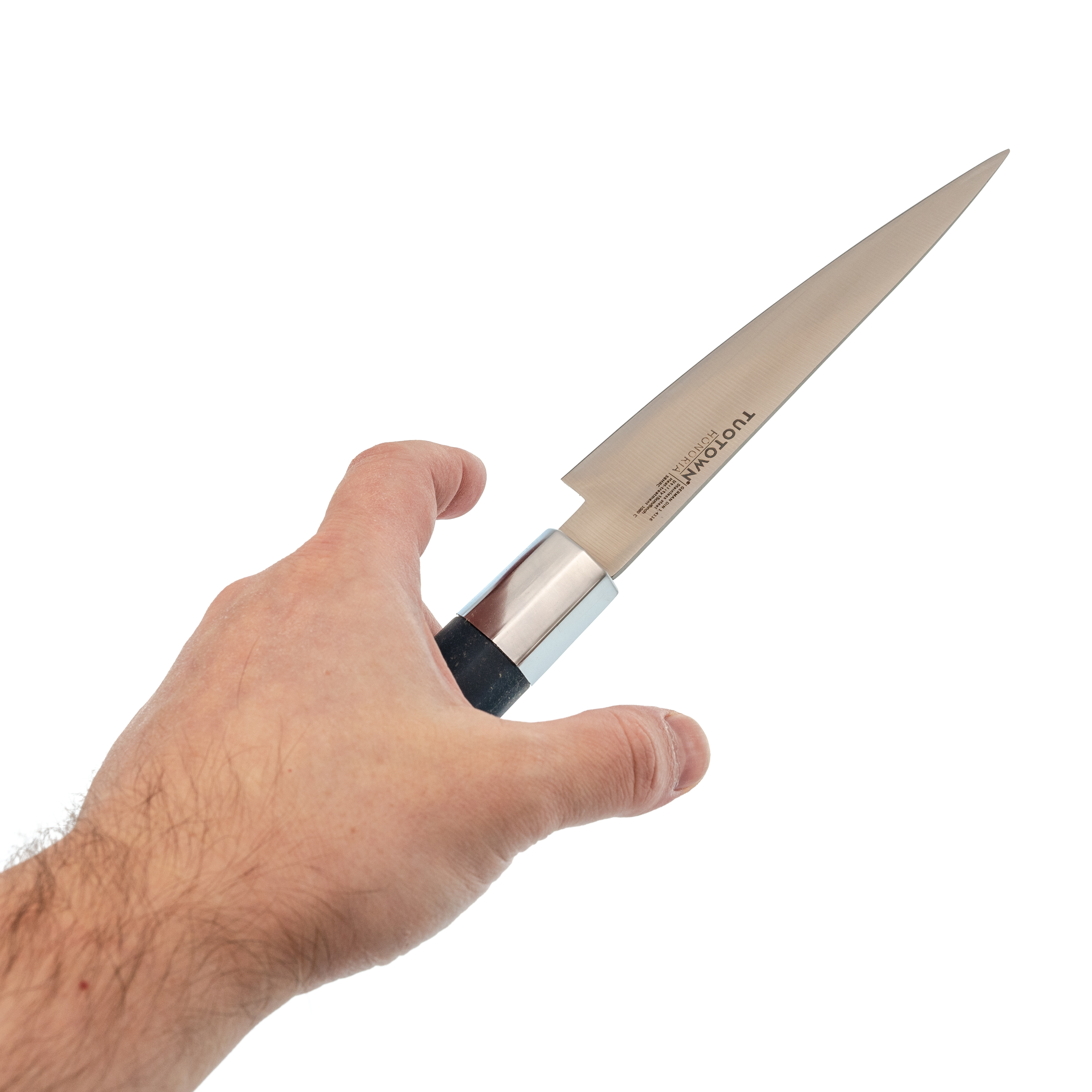 Тонкий клинок с прямыми спусками от обуха даёт чистый, контролируемый рез. Нож не раскалывает продукт, а аккуратно его разрезает. Длины хватает для большинства кухонных сценариев, без ощущения громоздкости.