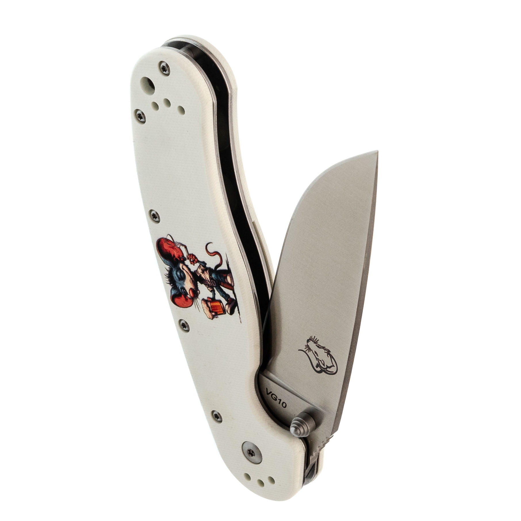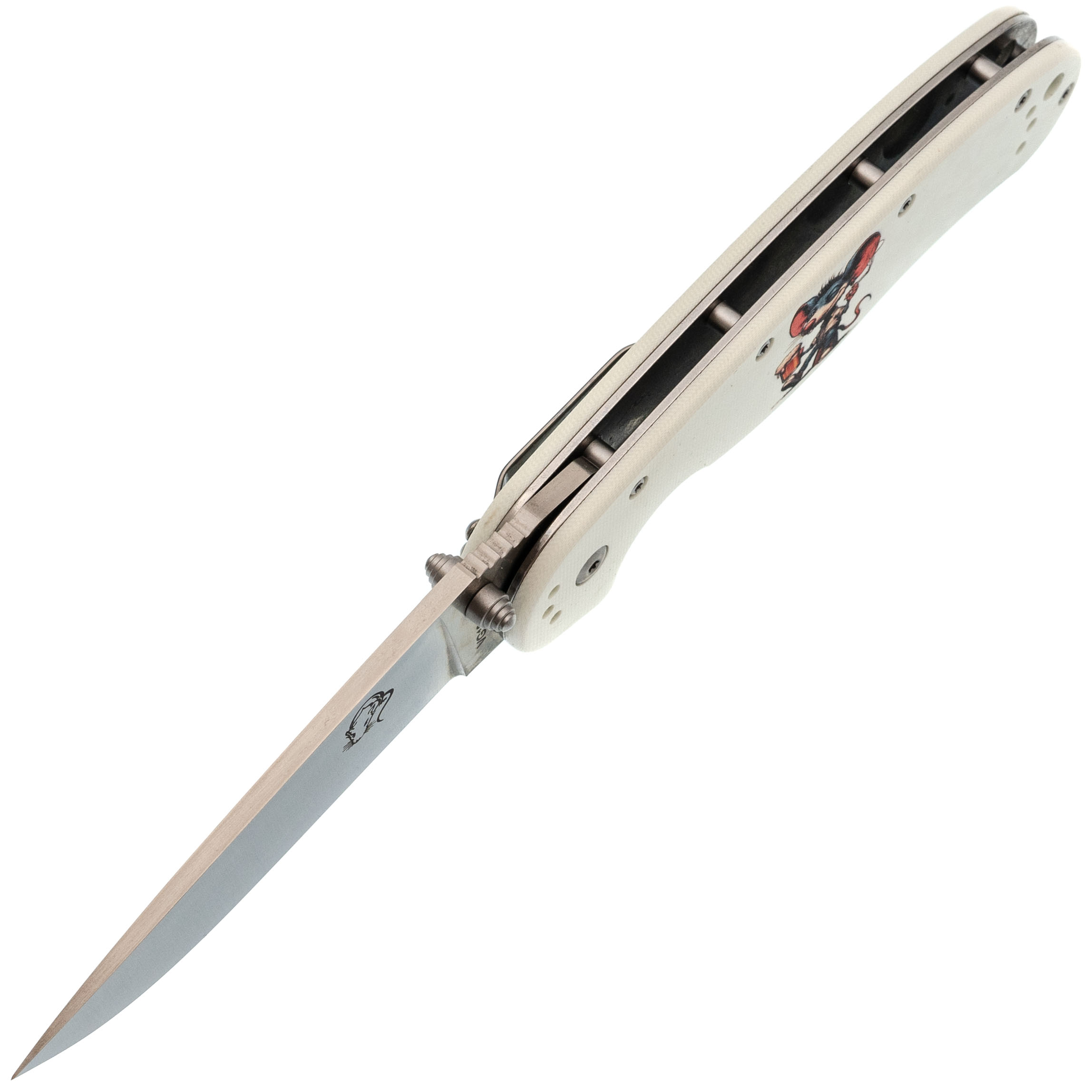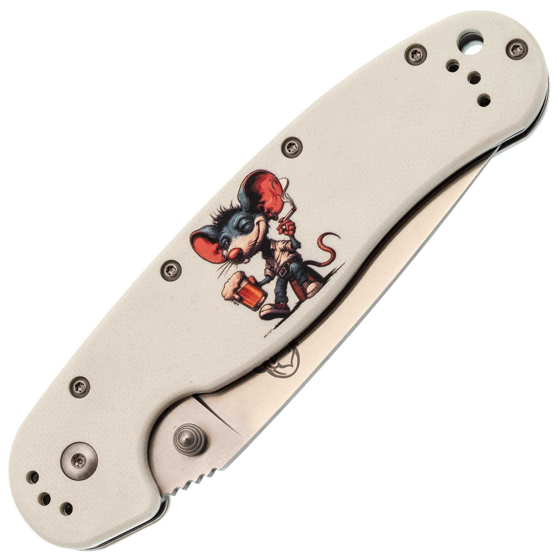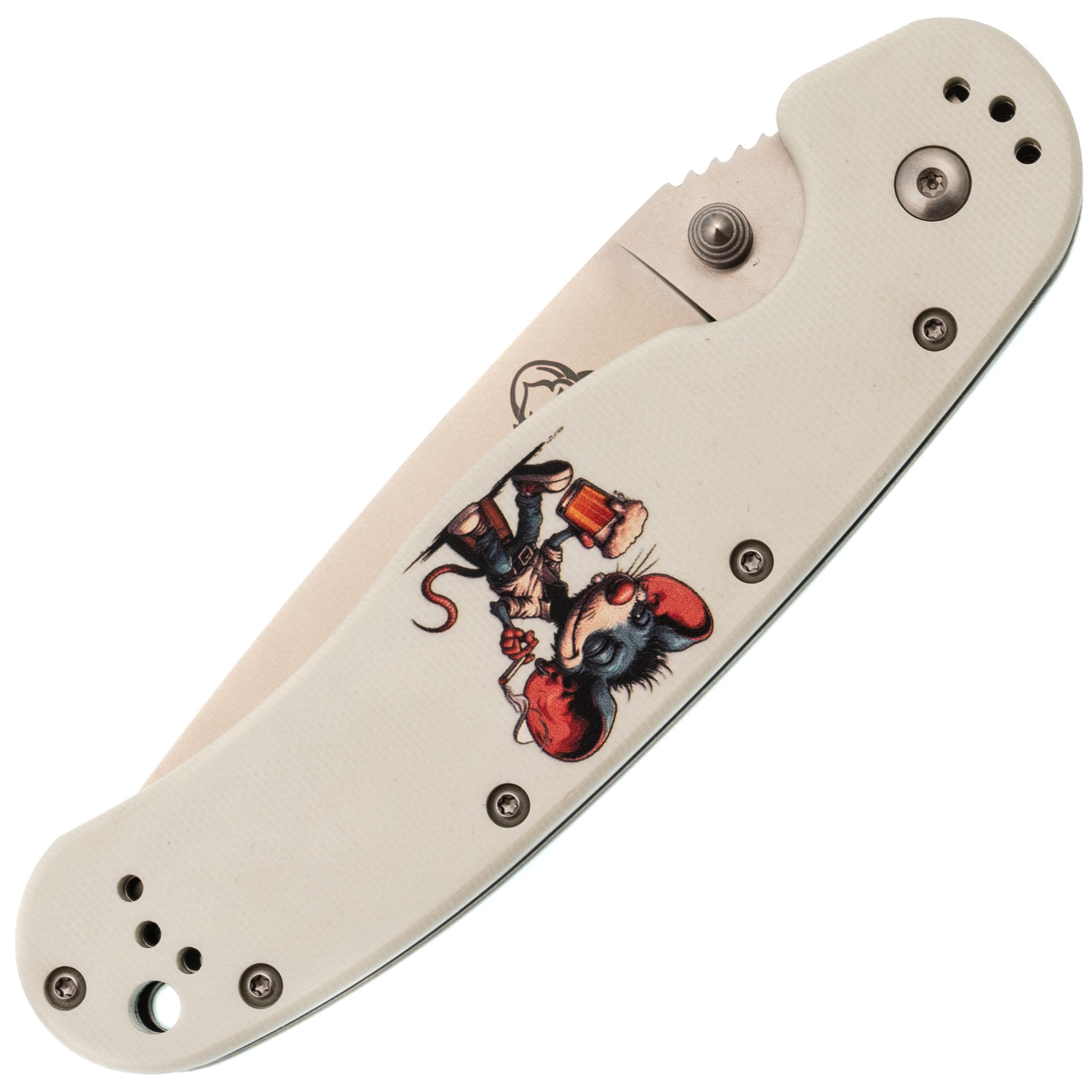 Форма рукояти удобная, с хорошим упором. На накладках - рисунок с крысой, радостно распивающей алкогольный напиток. Деталь неожиданная, но выполнена аккуратно и не мешает хвату. Клипса переставляемая, четыре варианта установки.