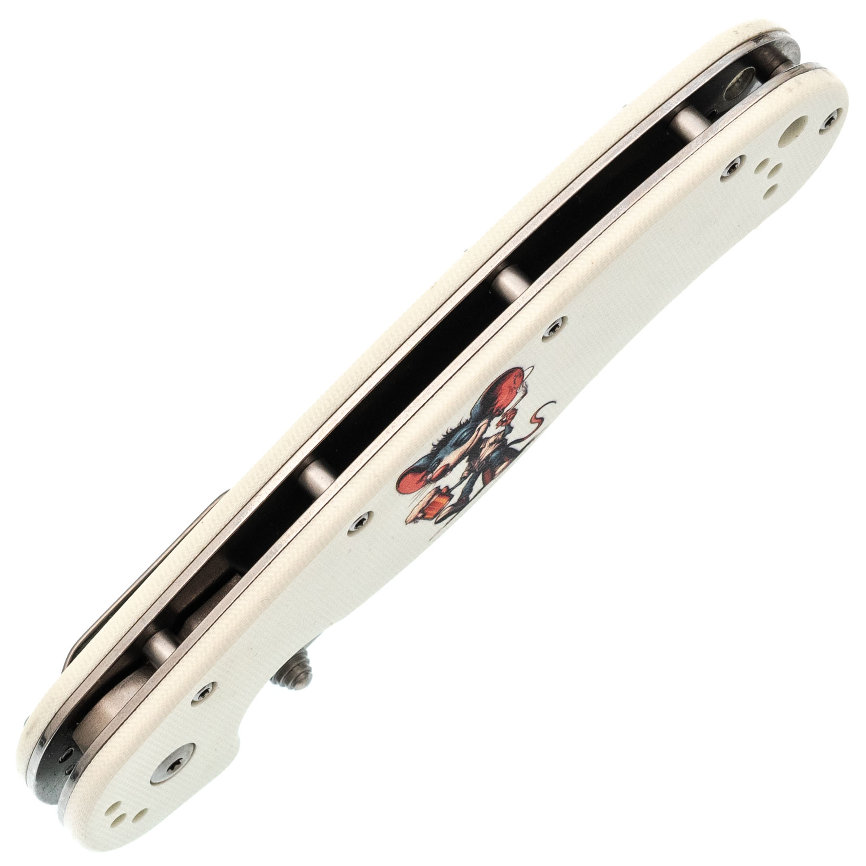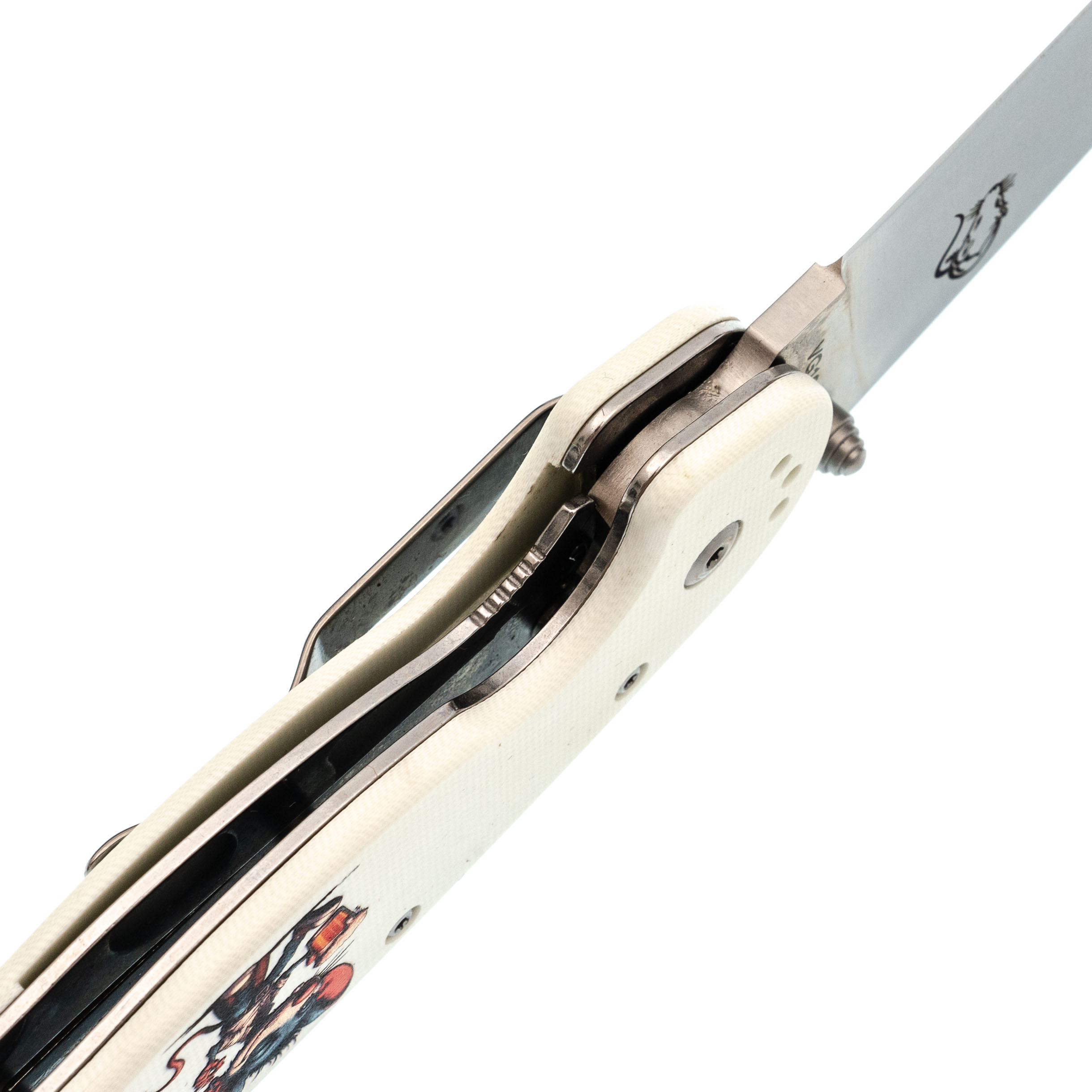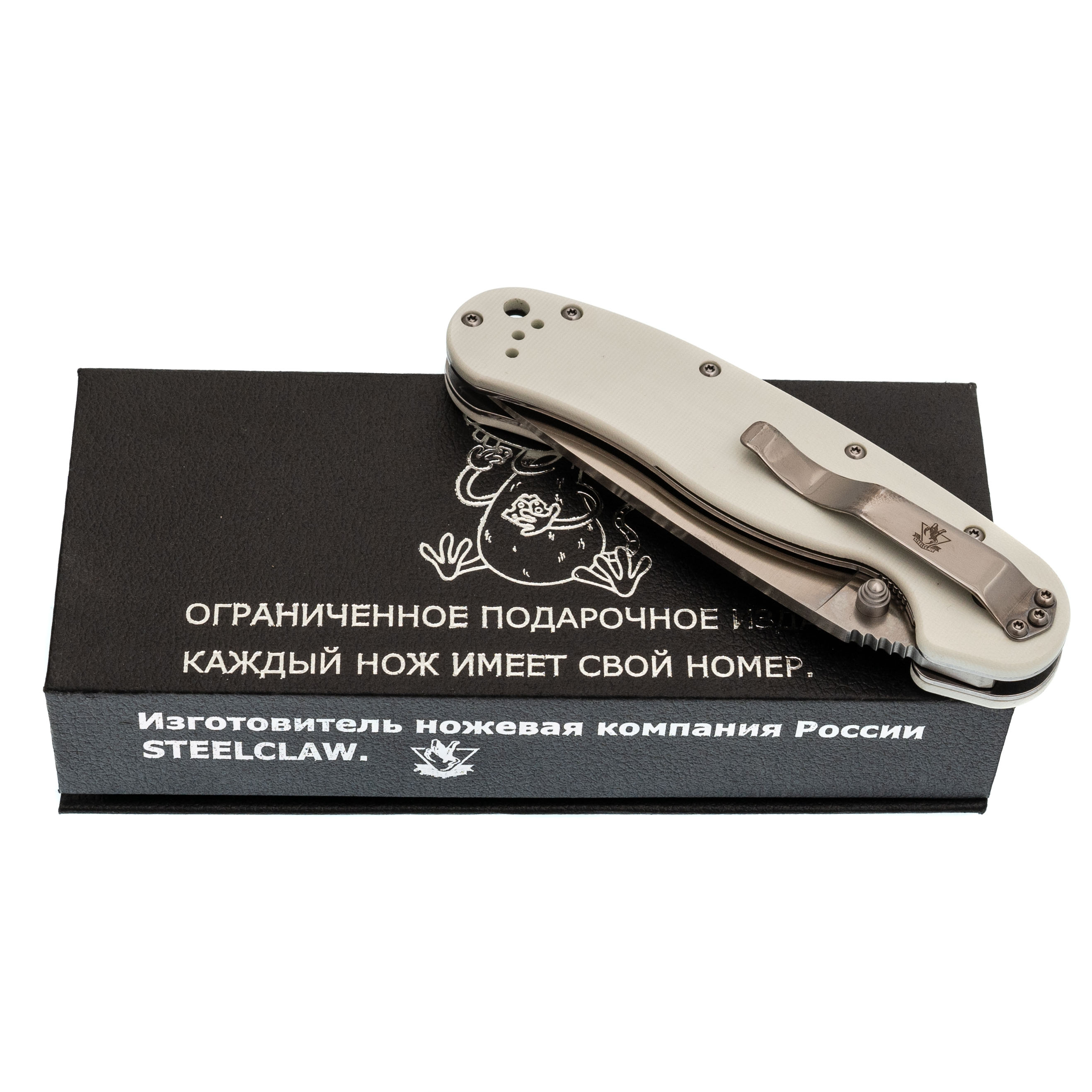 Форма рукояти удобная, с хорошим упором. На накладках - рисунок с крысой, радостно распивающей алкогольный напиток. Деталь неожиданная, но выполнена аккуратно и не мешает хвату. Клипса переставляемая, четыре варианта установки.
