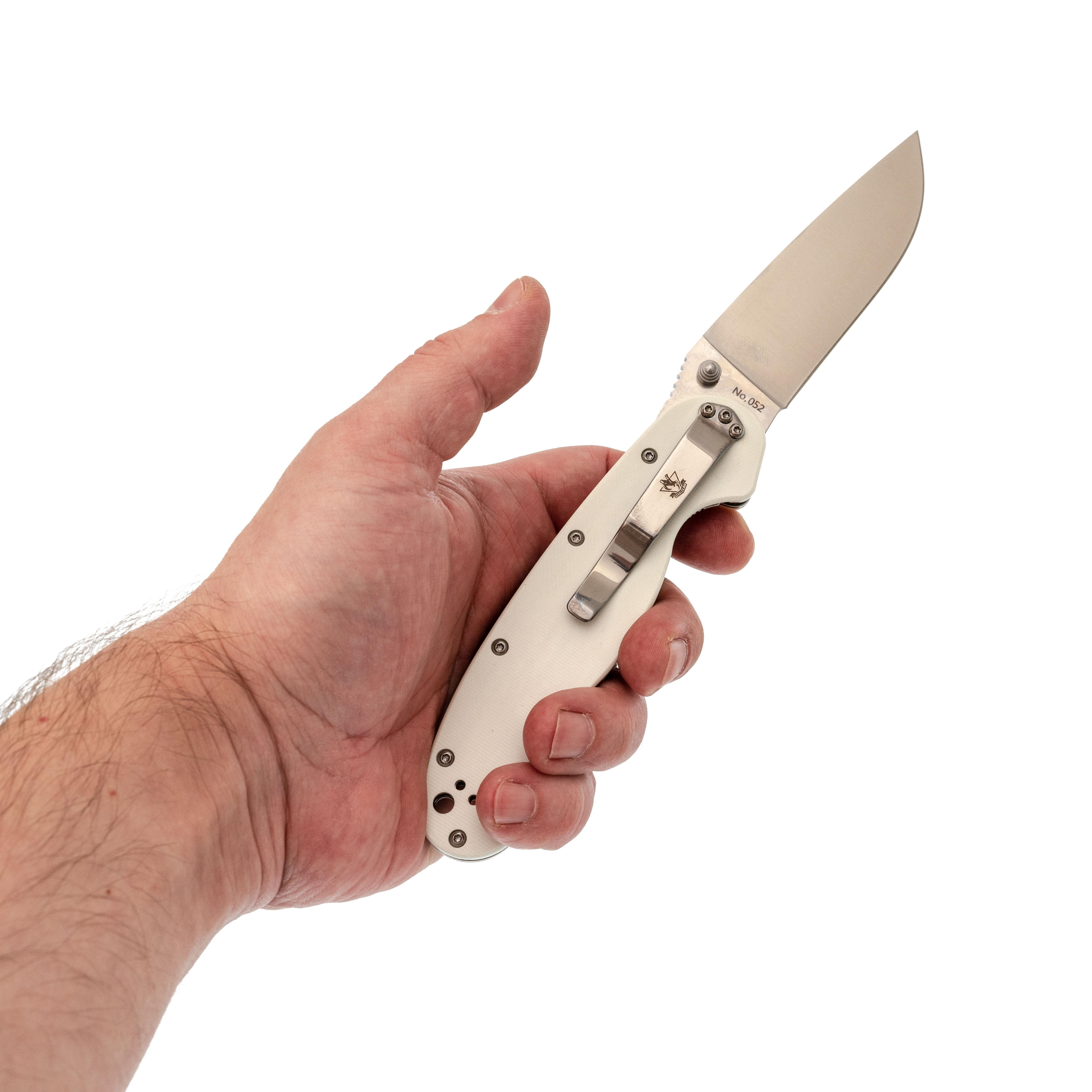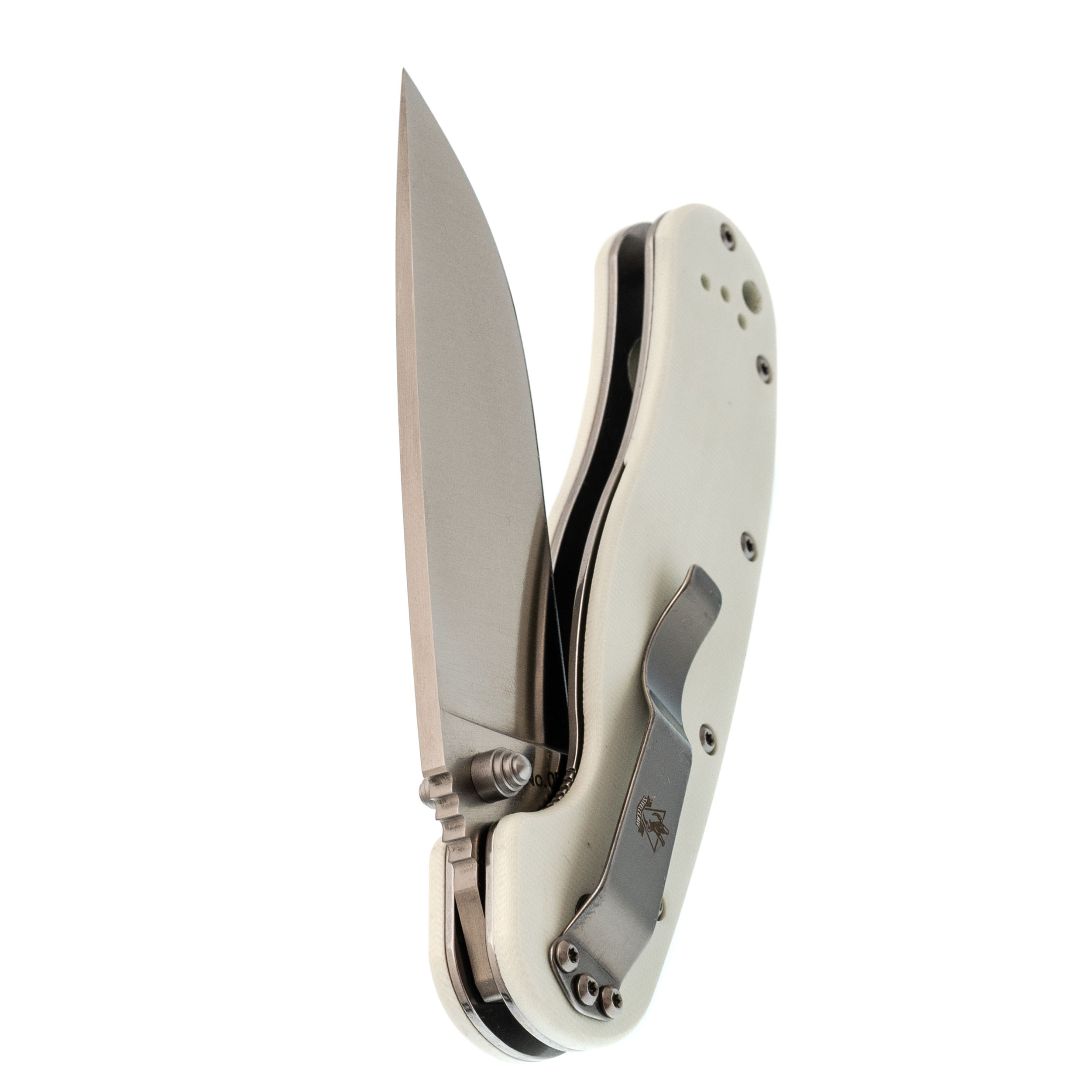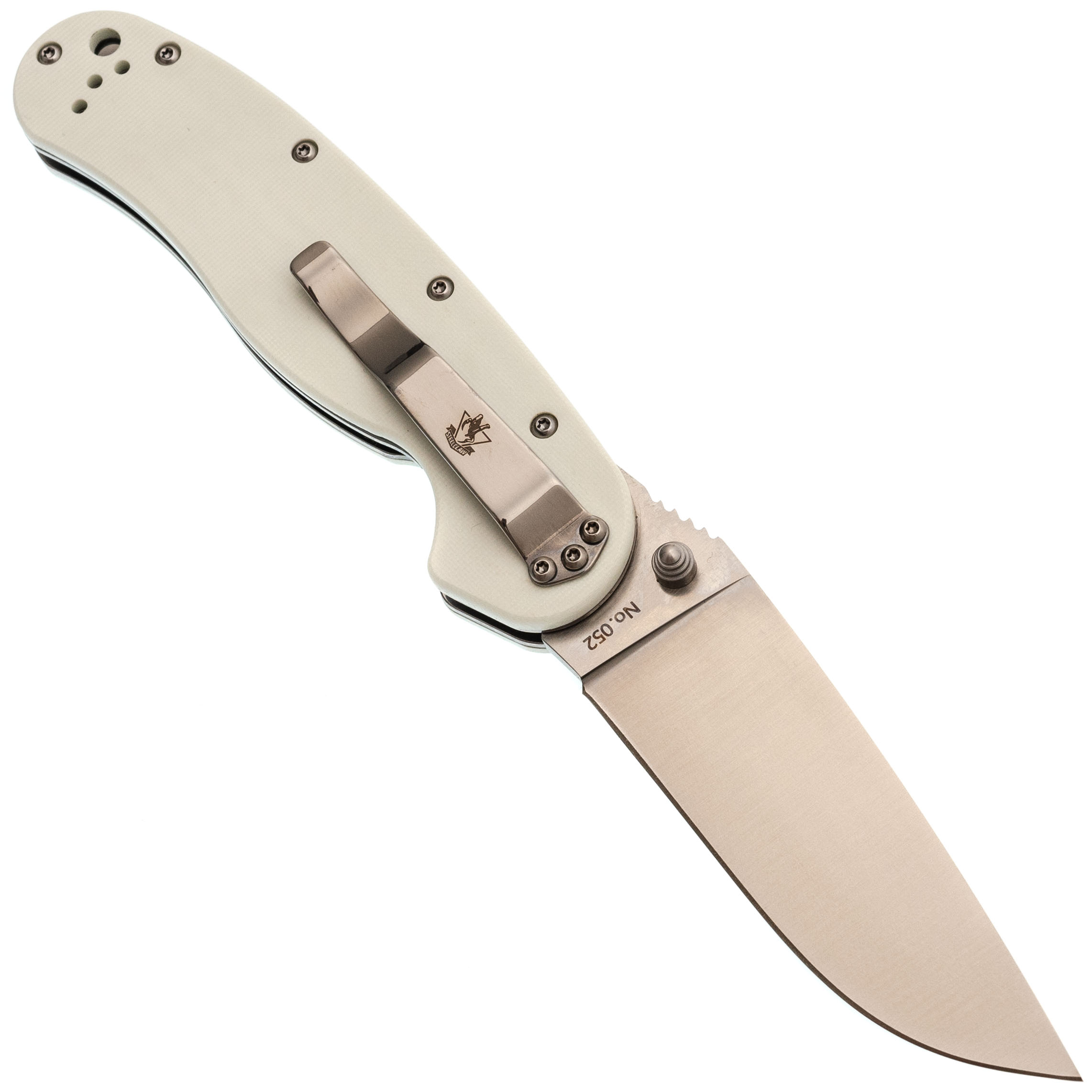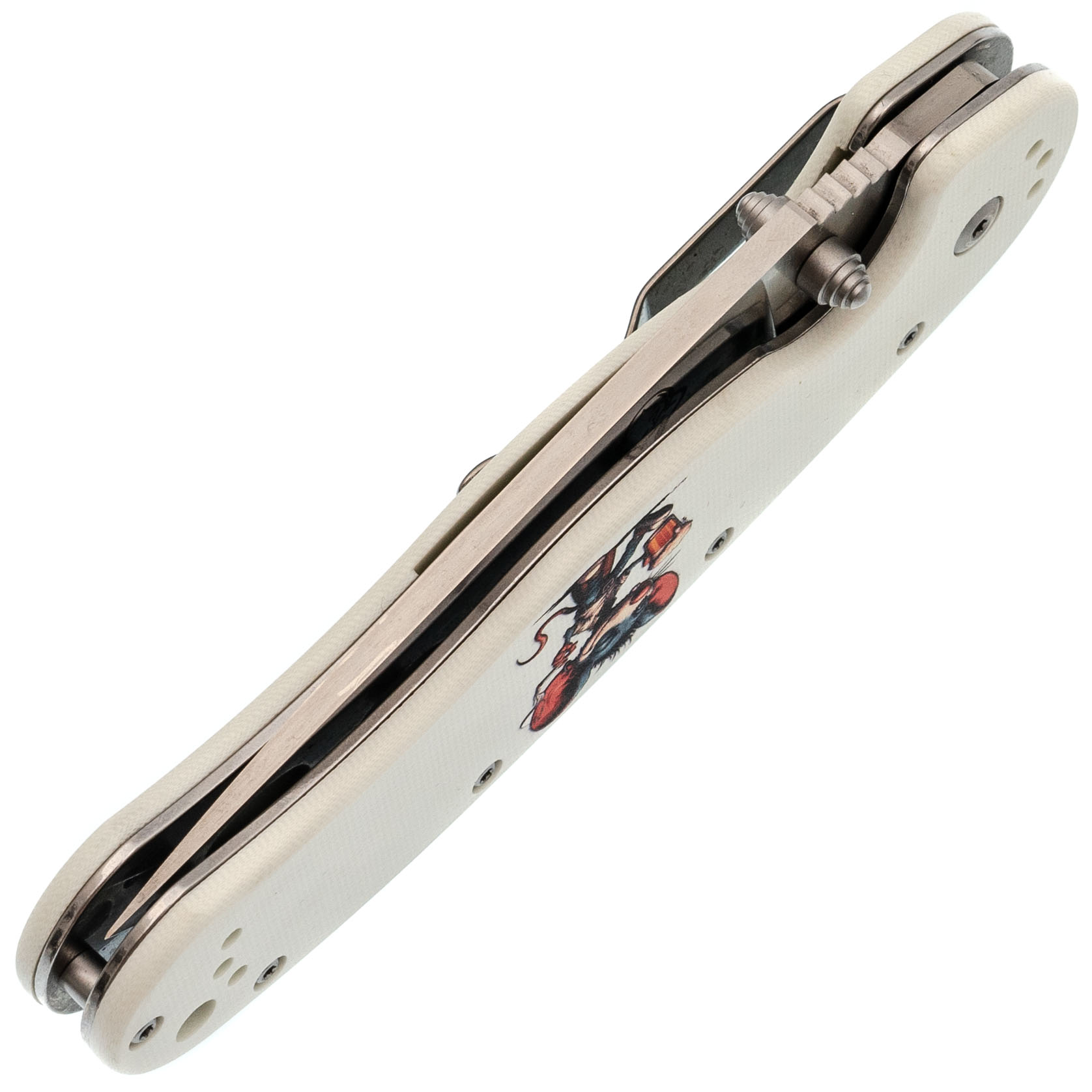 Форма рукояти удобная, с хорошим упором. На накладках - рисунок с крысой, радостно распивающей алкогольный напиток. Деталь неожиданная, но выполнена аккуратно и не мешает хвату. Клипса переставляемая, четыре варианта установки.