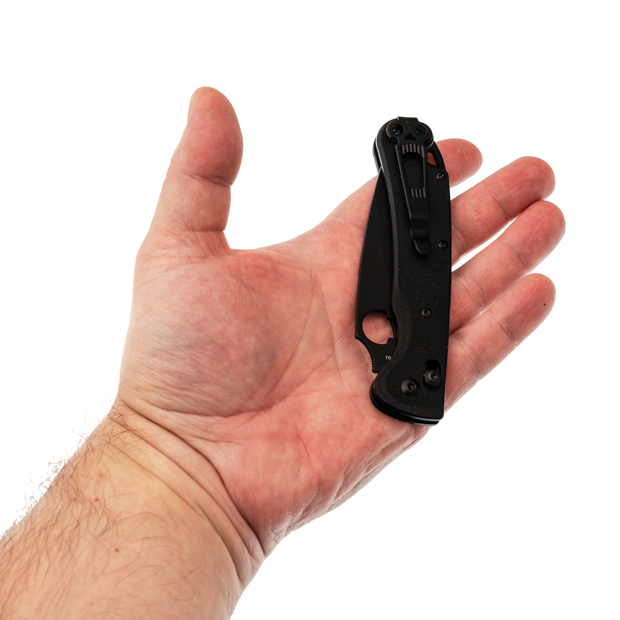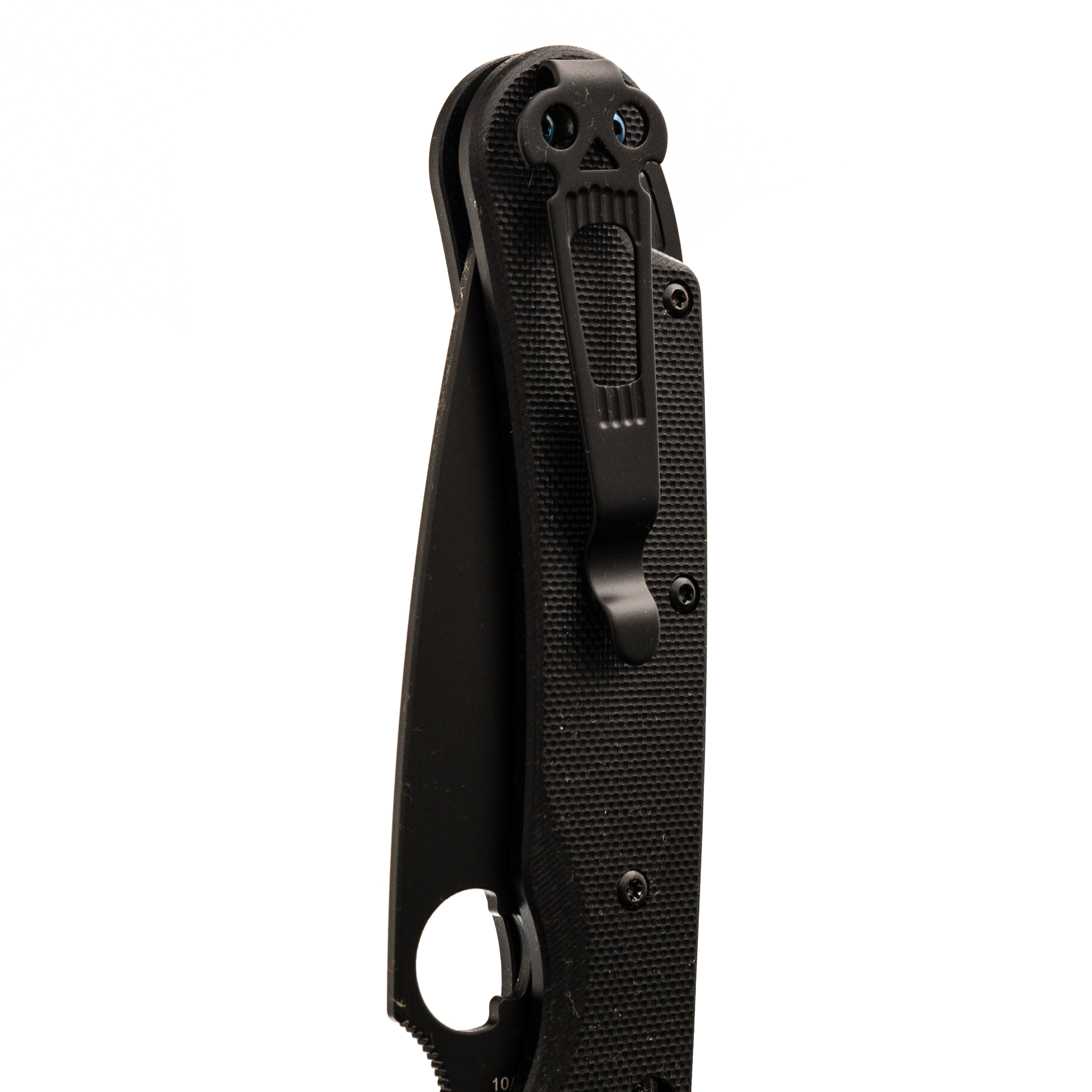 Рукоять уверенно фиксируется в руке, не давит и не утомляет. Клипса с фирменным черепом держит нож стабильно и не мешает при работе.