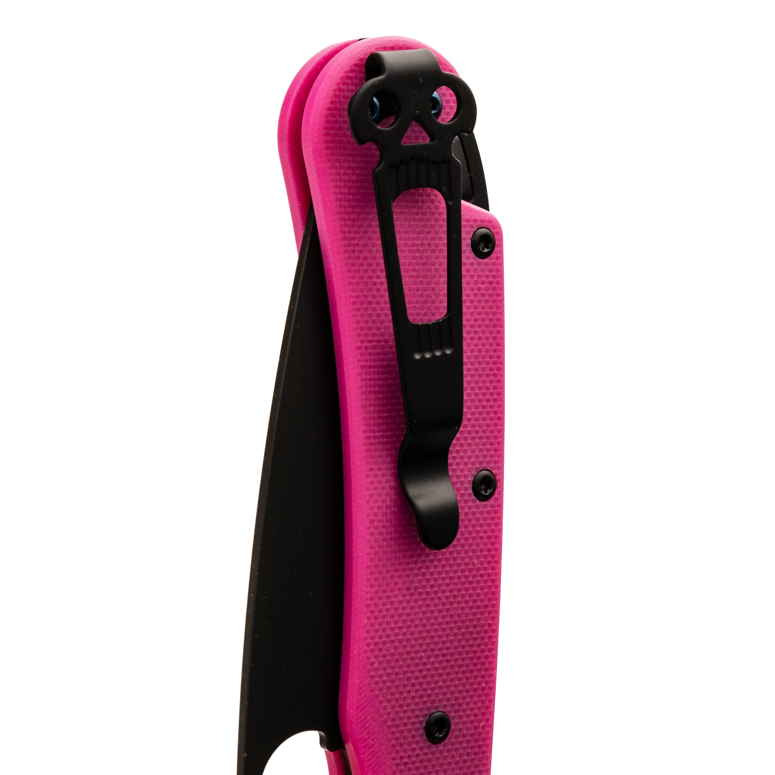 Подпальцевая выемка помогает удерживать нож даже при силовой работе. Клипса с черепом держит его на месте.