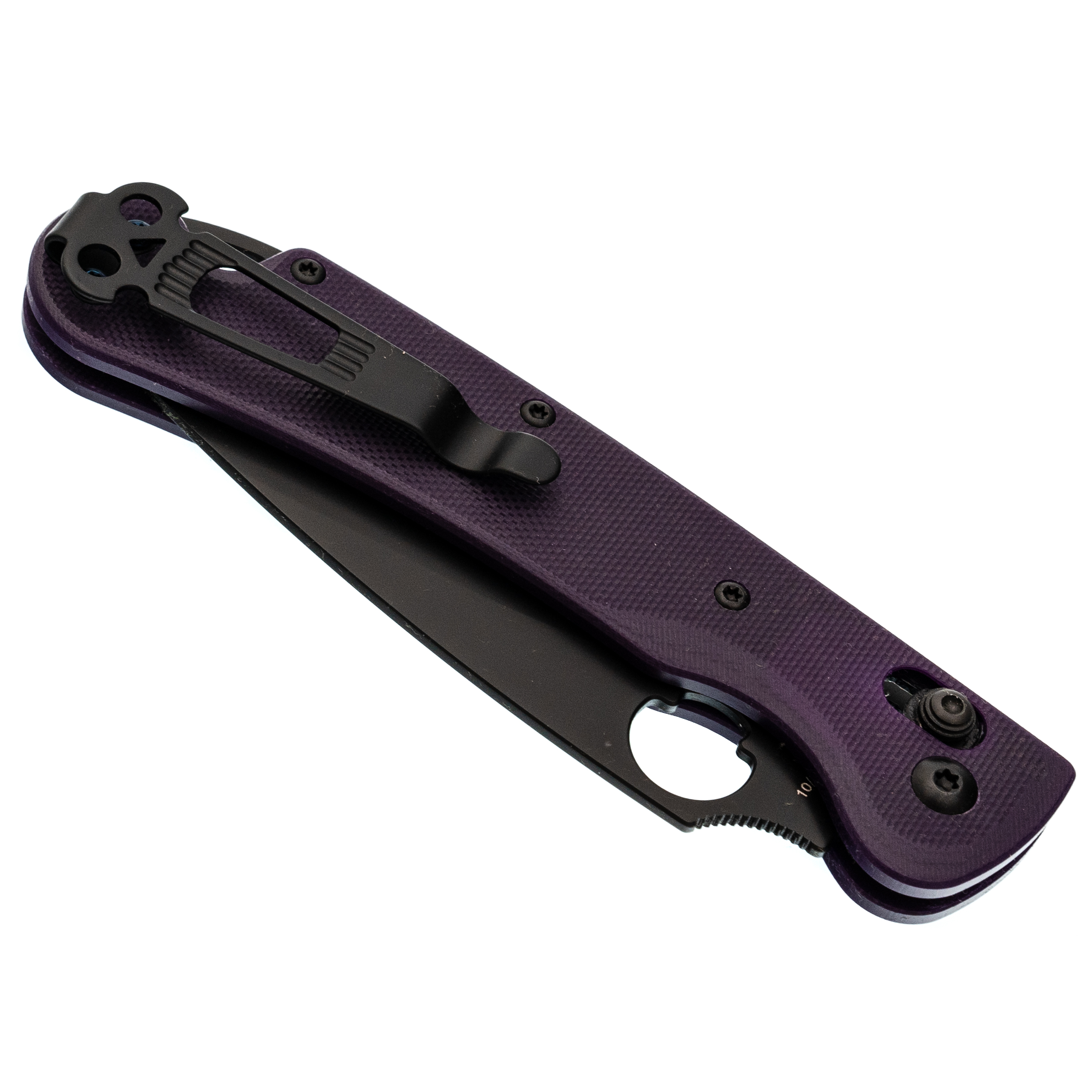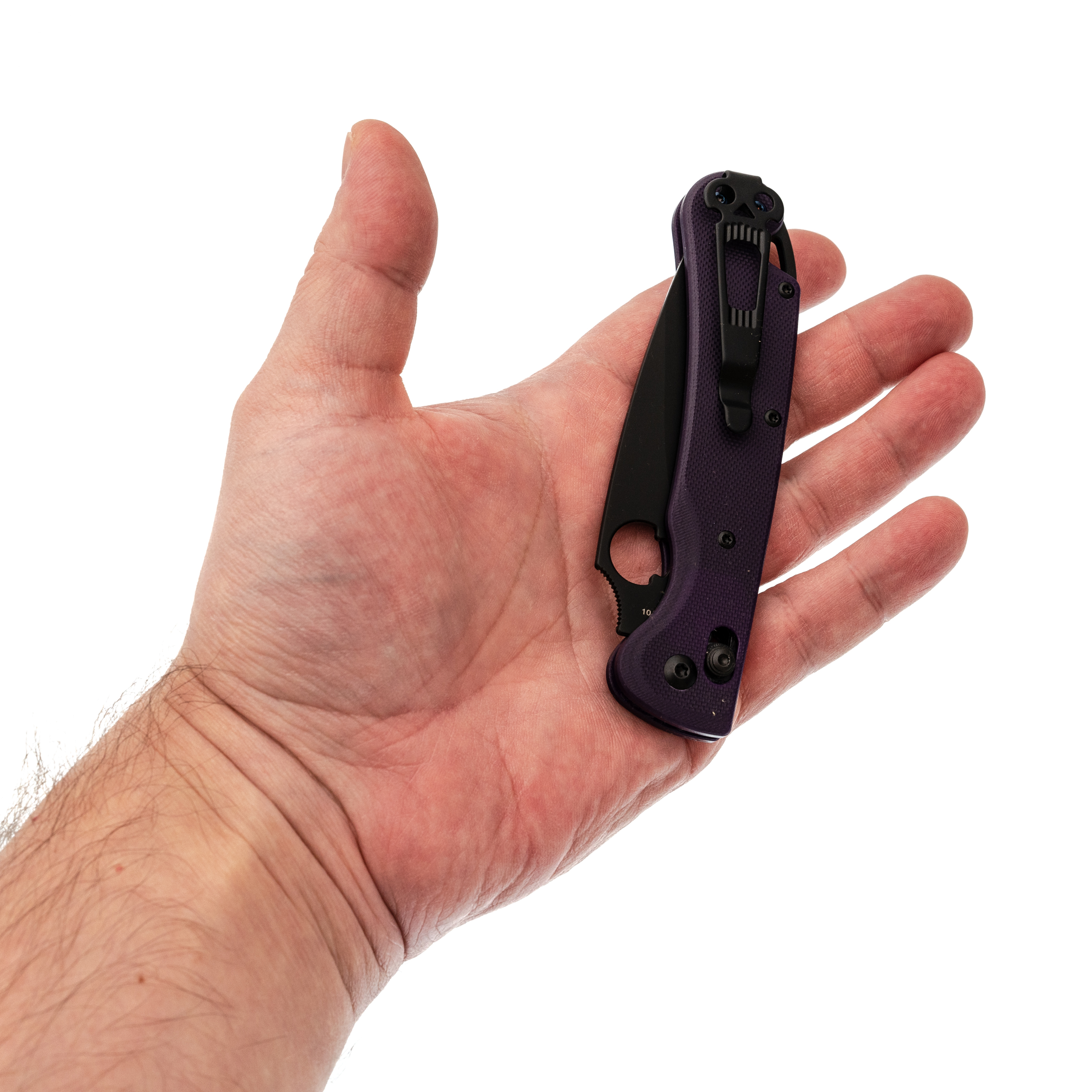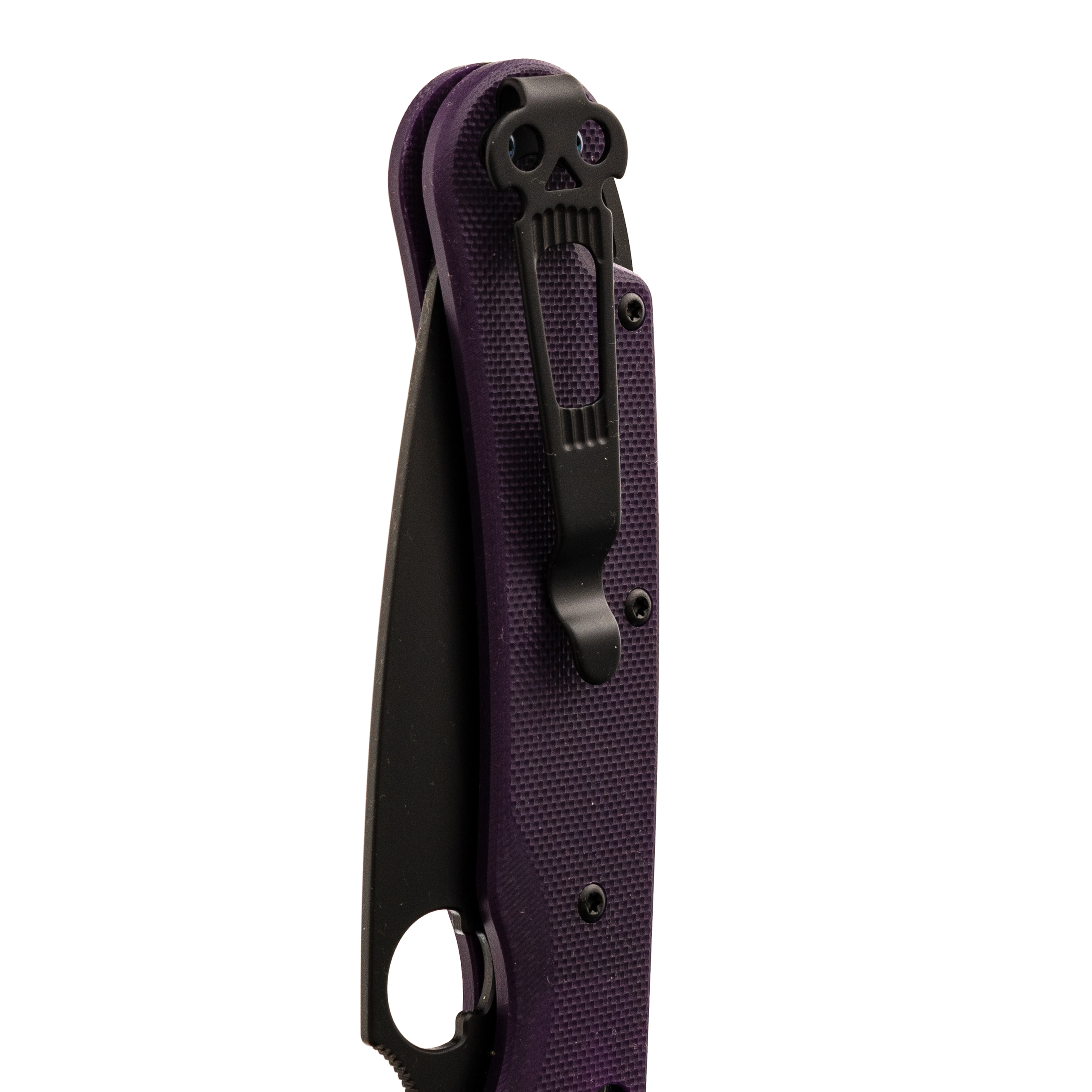 Изогнутая форма рукояти помогает ножу естественно лечь в ладонь, а подпальцевая выемка улучшает контроль. Клипса с фирменным черепом надёжно удерживает нож в кармане и не мешает при работе. Темлячное отверстие в бекспейсере остаётся полезной деталью для тех, кто привык дополнять нож аксессуарами.