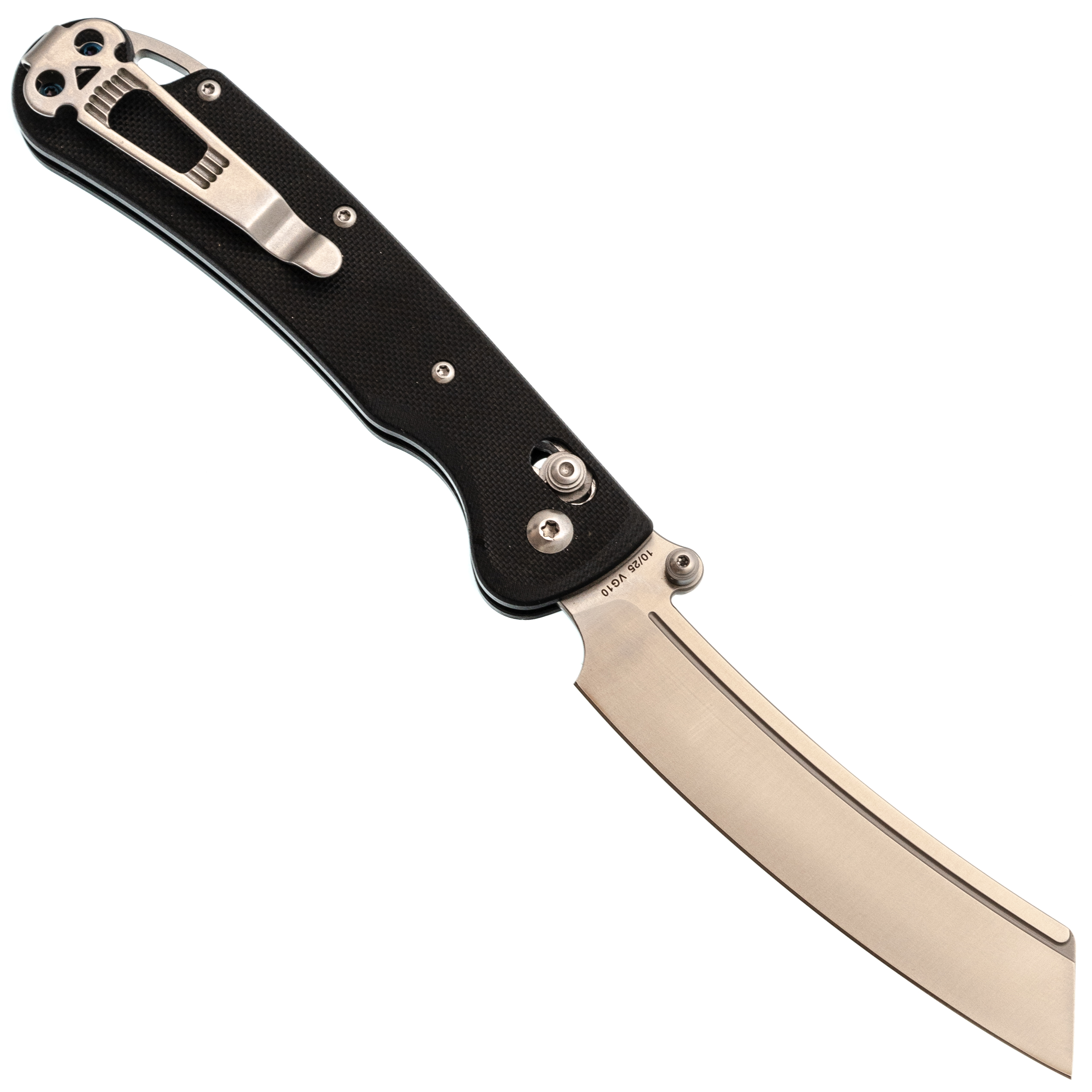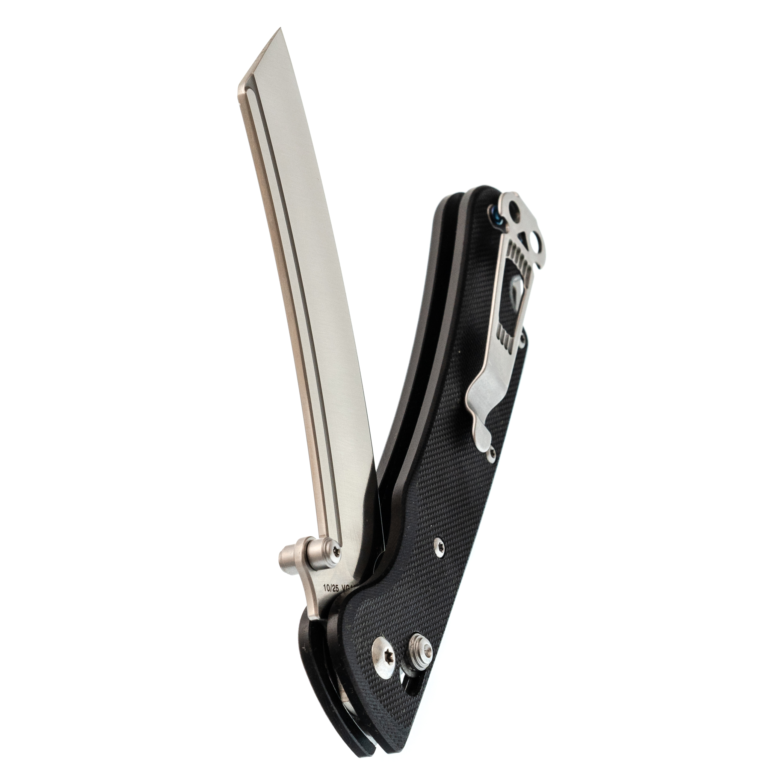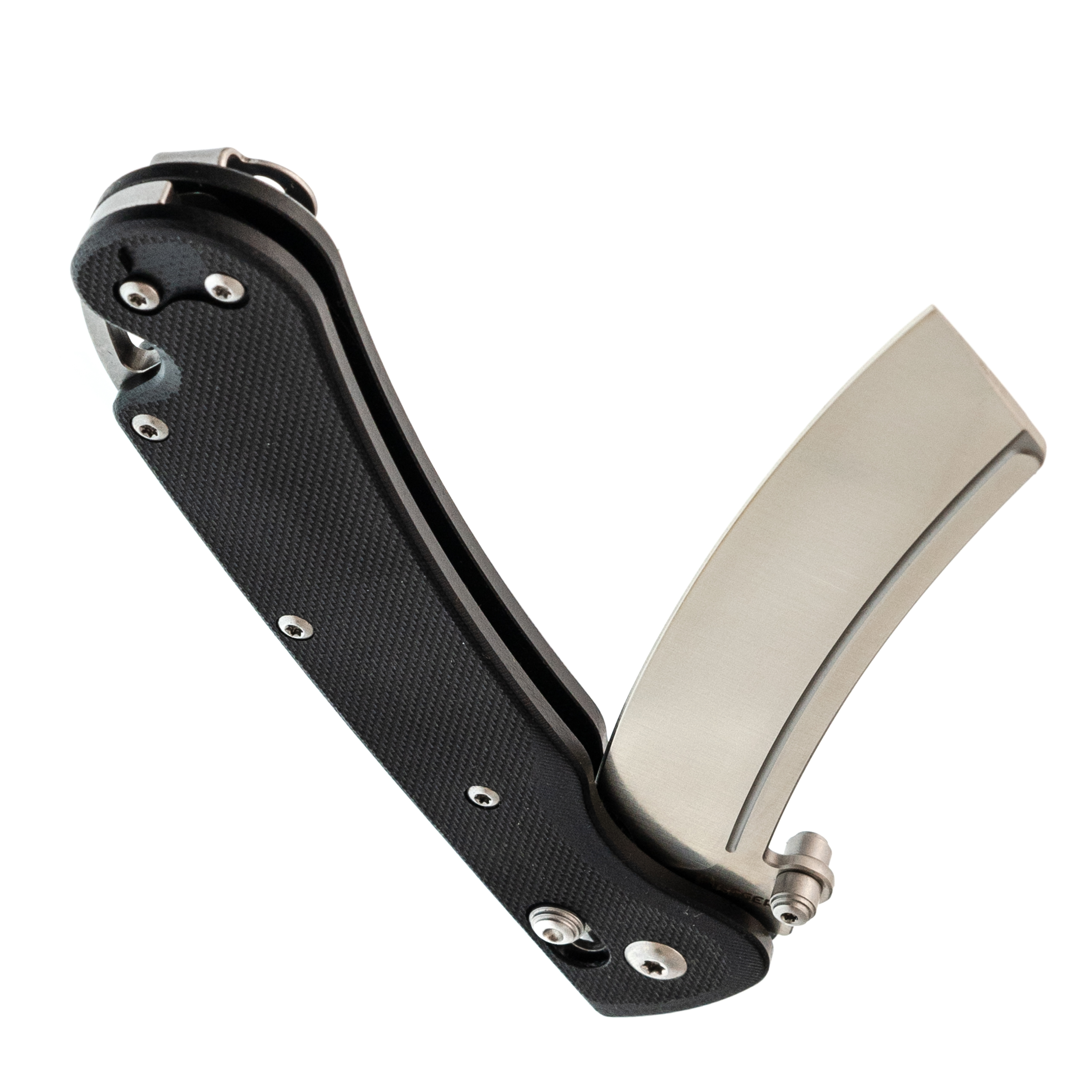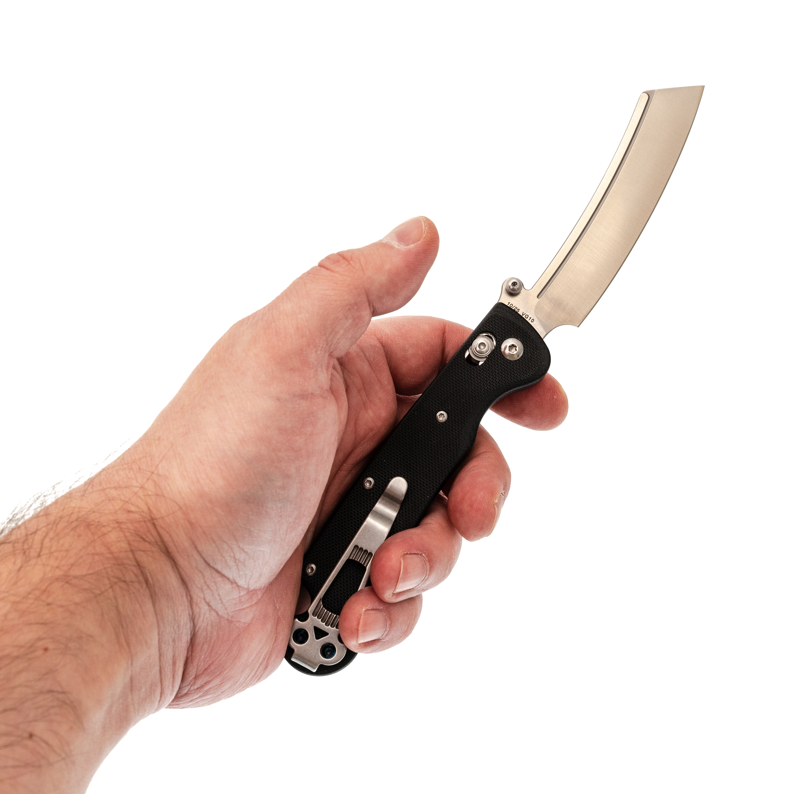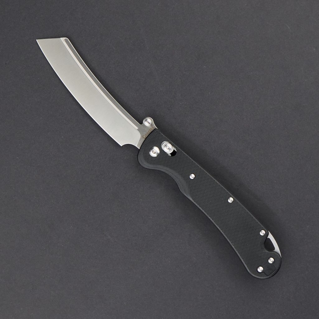 Форма клинка - баланс между Cleaver и Reverse Tanto. Он уверенно идёт в протяжном резе и при этом даёт аккуратный, рабочий кончик для точных действий. Тонкий обух и прямые спуски помогают резать и строгать без лишних усилий. Открытие возможно как за шпеньки, так и инерционно.