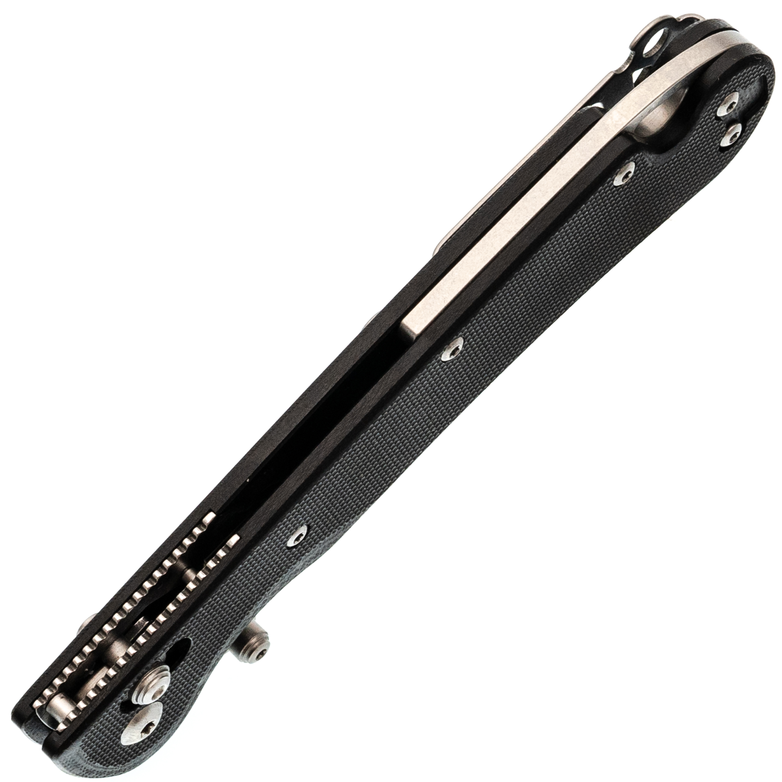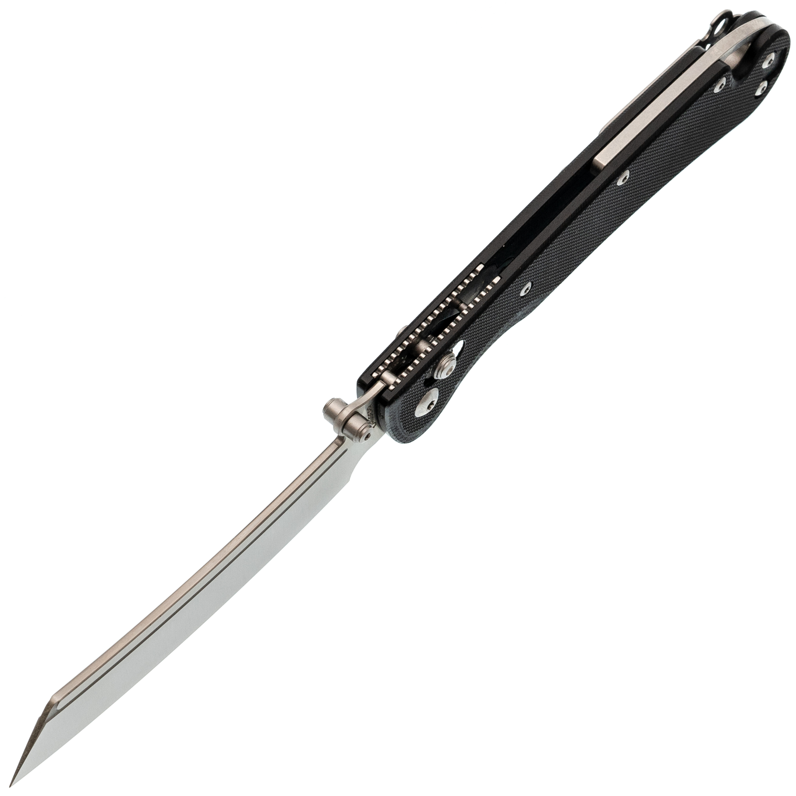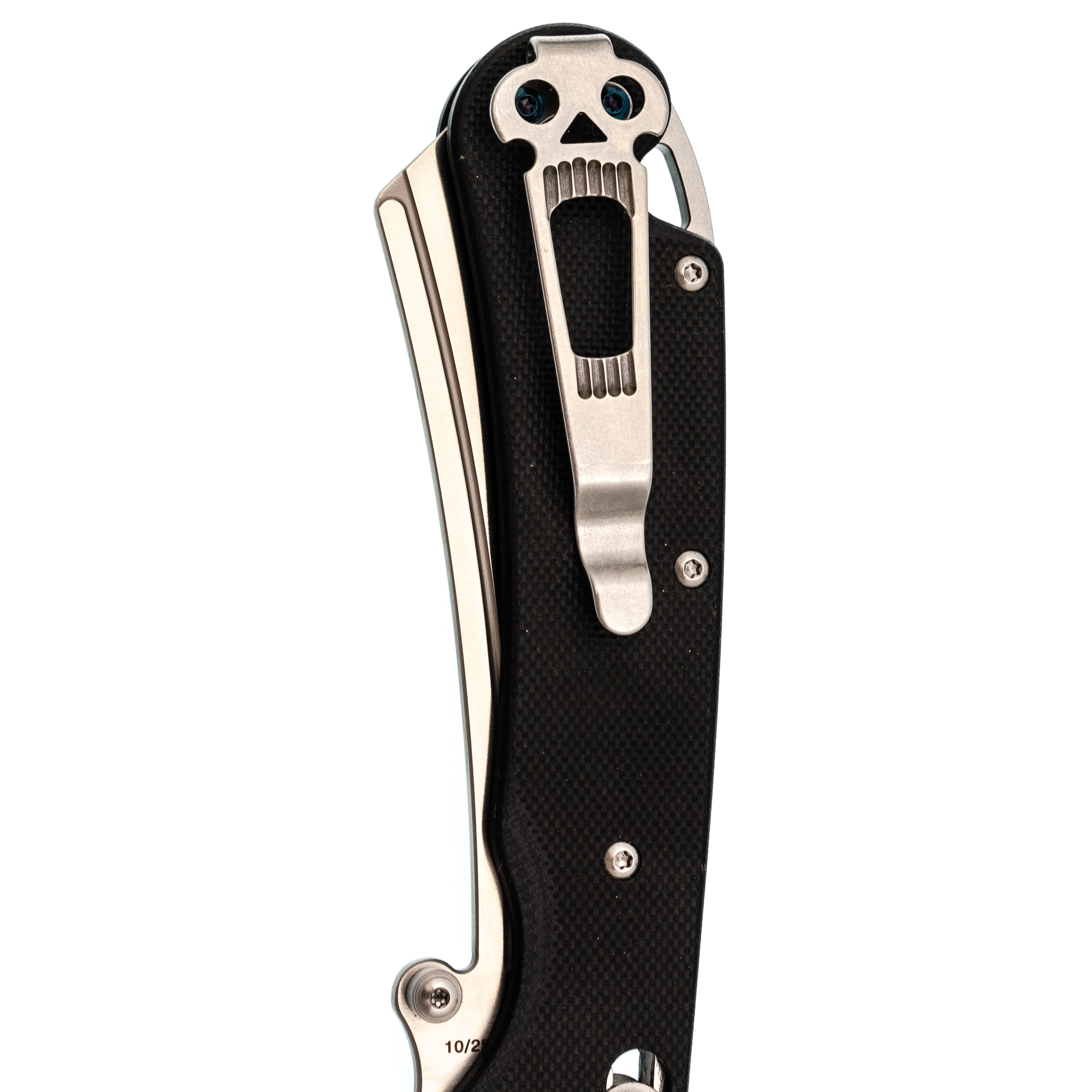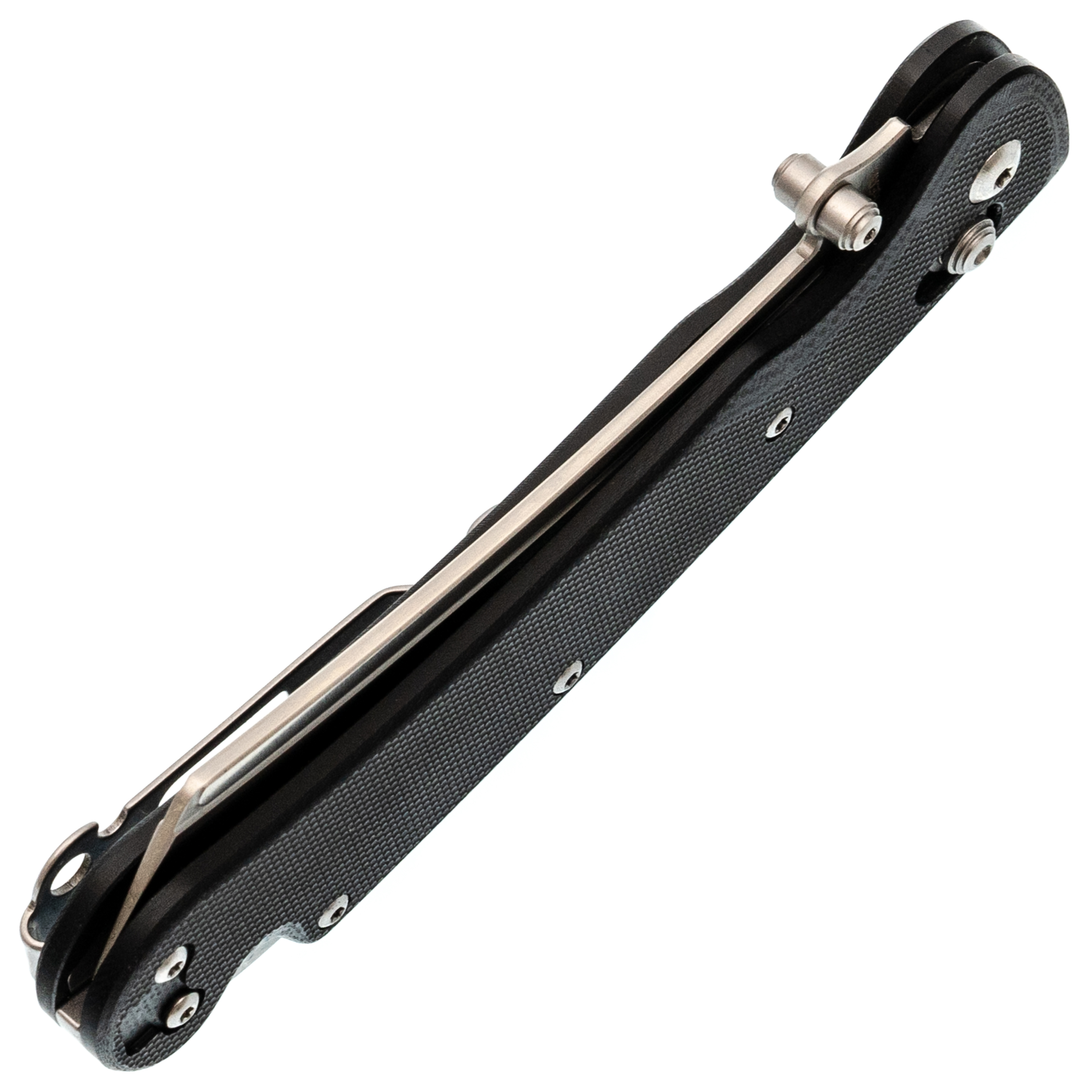 Форма клинка - баланс между Cleaver и Reverse Tanto. Он уверенно идёт в протяжном резе и при этом даёт аккуратный, рабочий кончик для точных действий. Тонкий обух и прямые спуски помогают резать и строгать без лишних усилий. Открытие возможно как за шпеньки, так и инерционно.