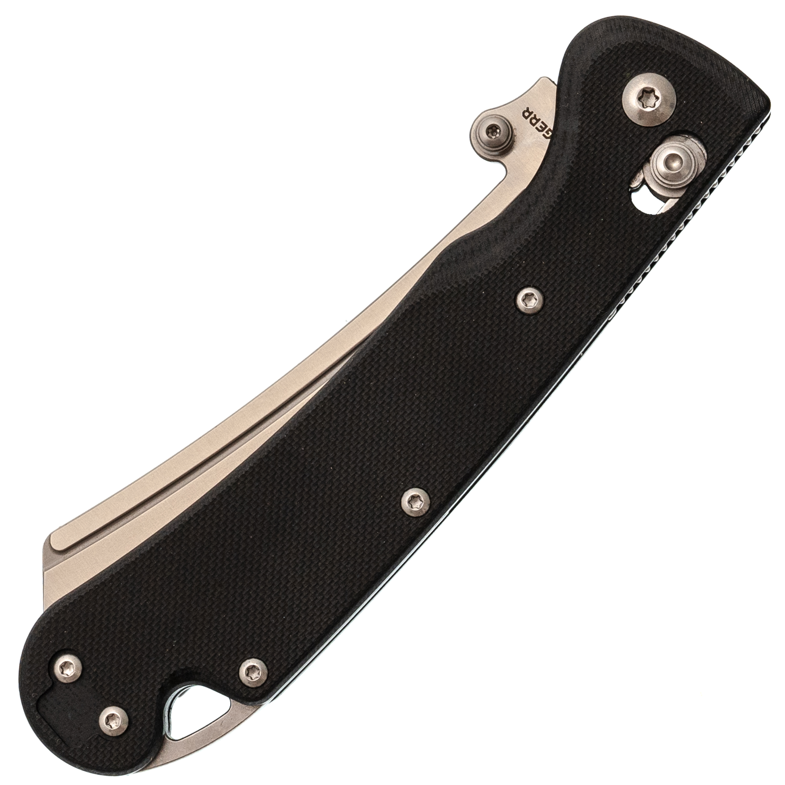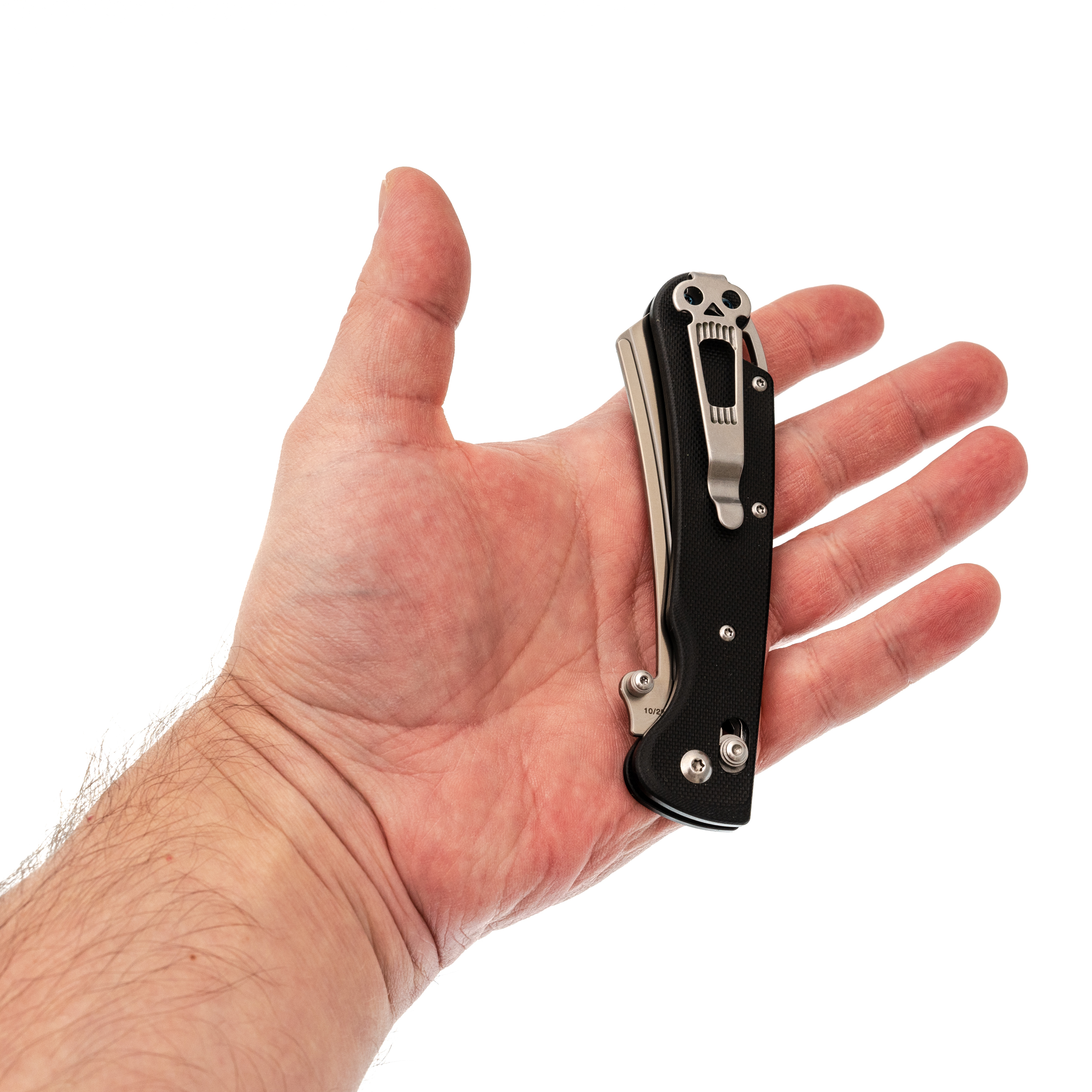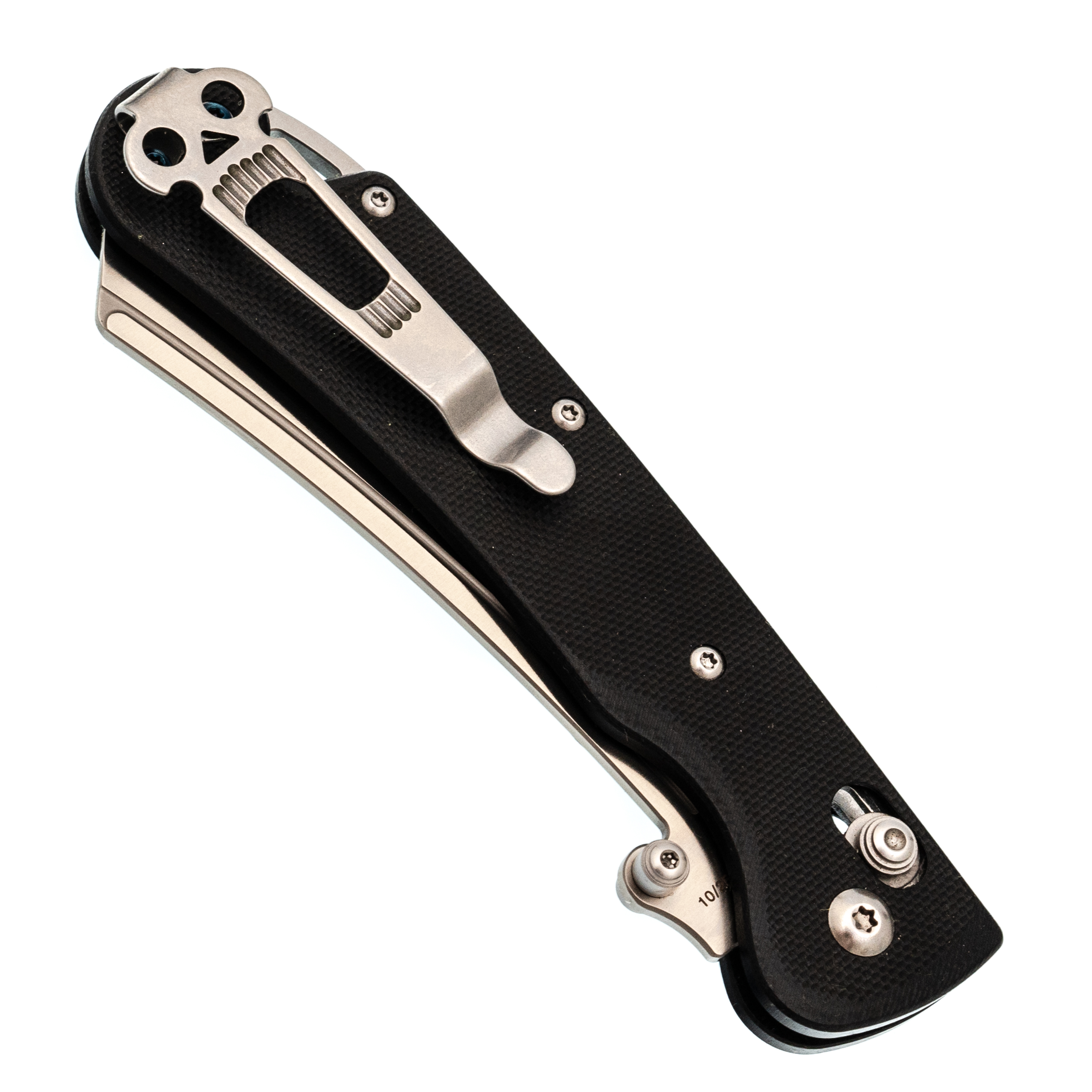 Рукоять изогнутая, с подпальцевой выемкой - ладонь ложится естественно, без поиска удобного положения. Текстура G10 цепкая, но не грубая. В бекспейсере предусмотрено темлячное отверстие для тех, кто любит дополнительную страховку.