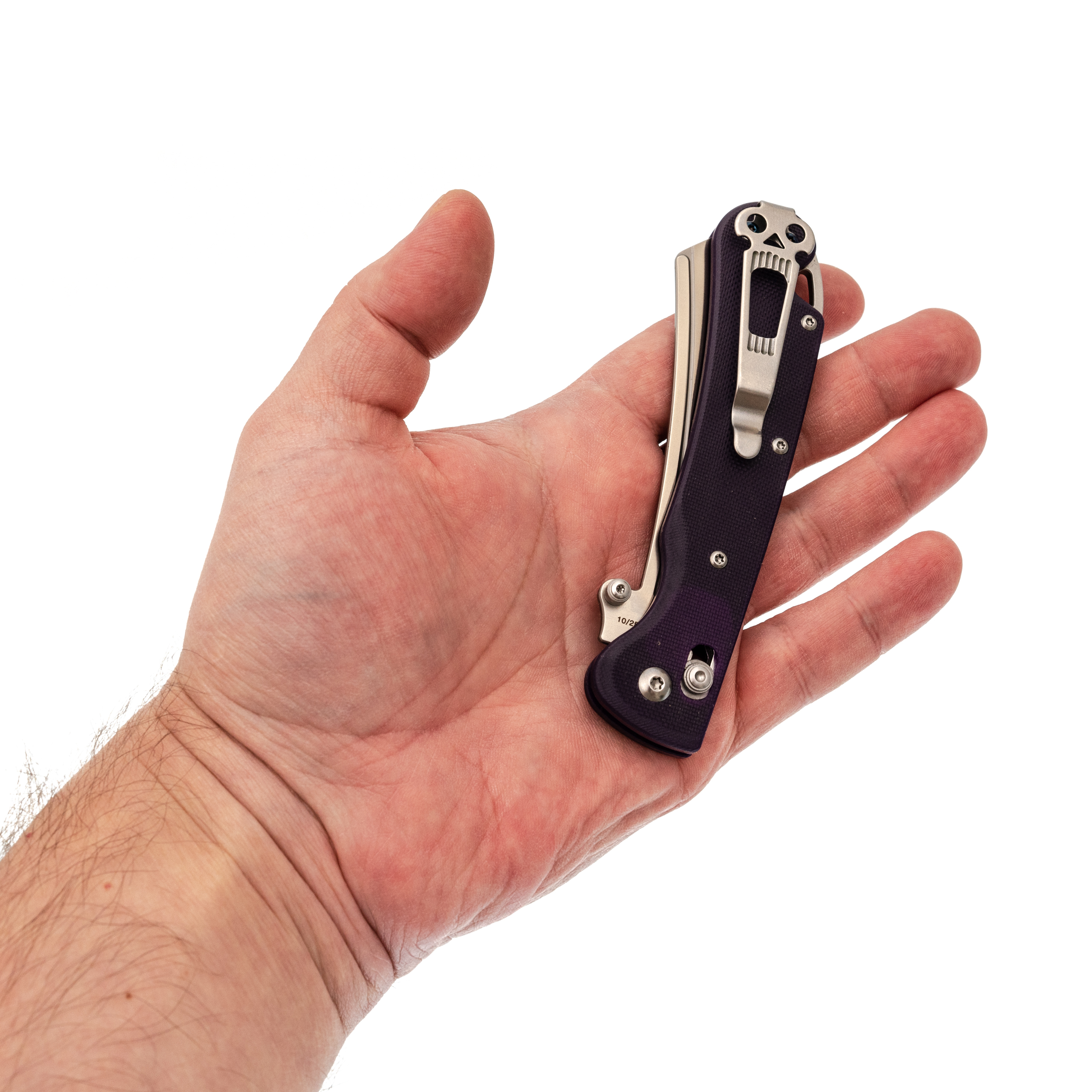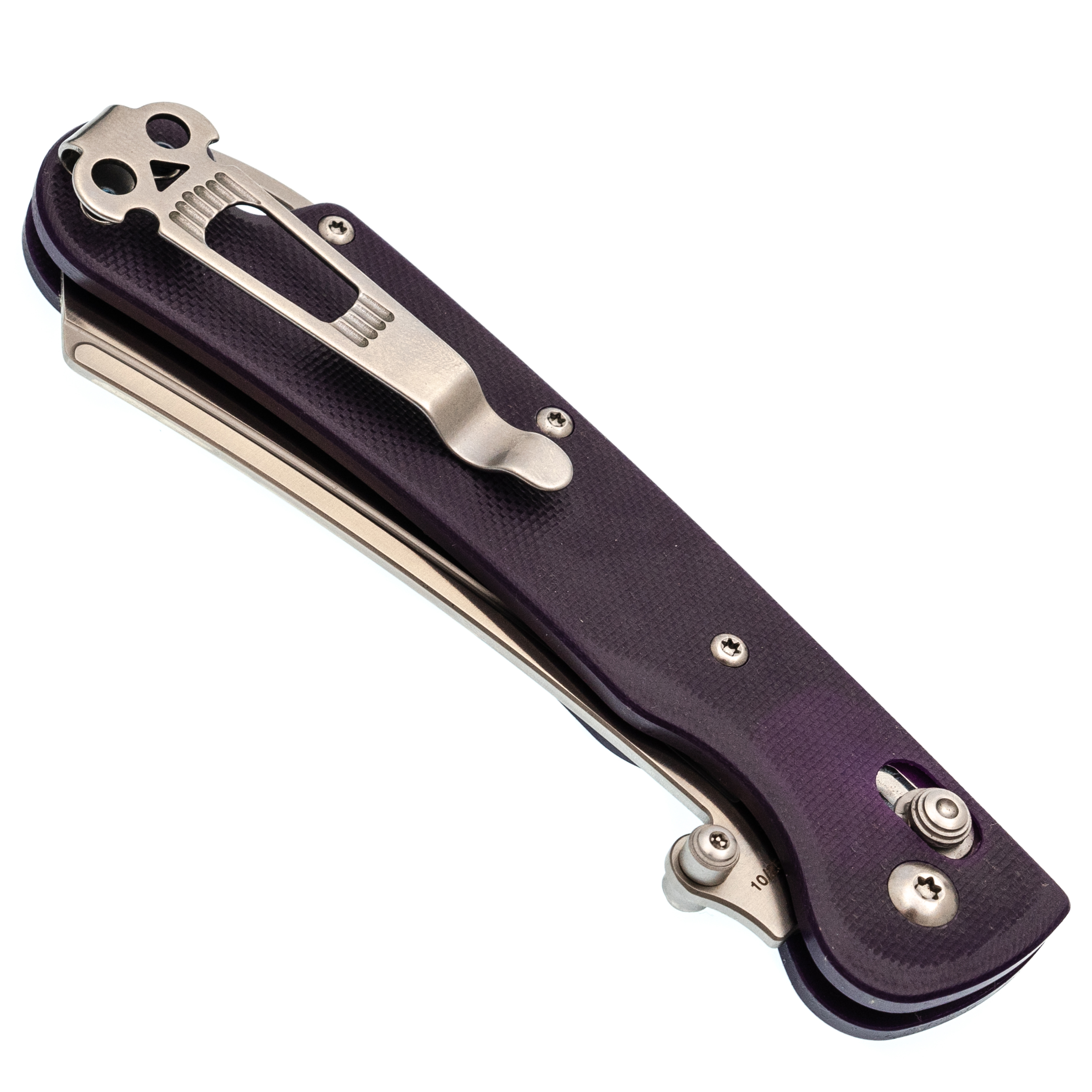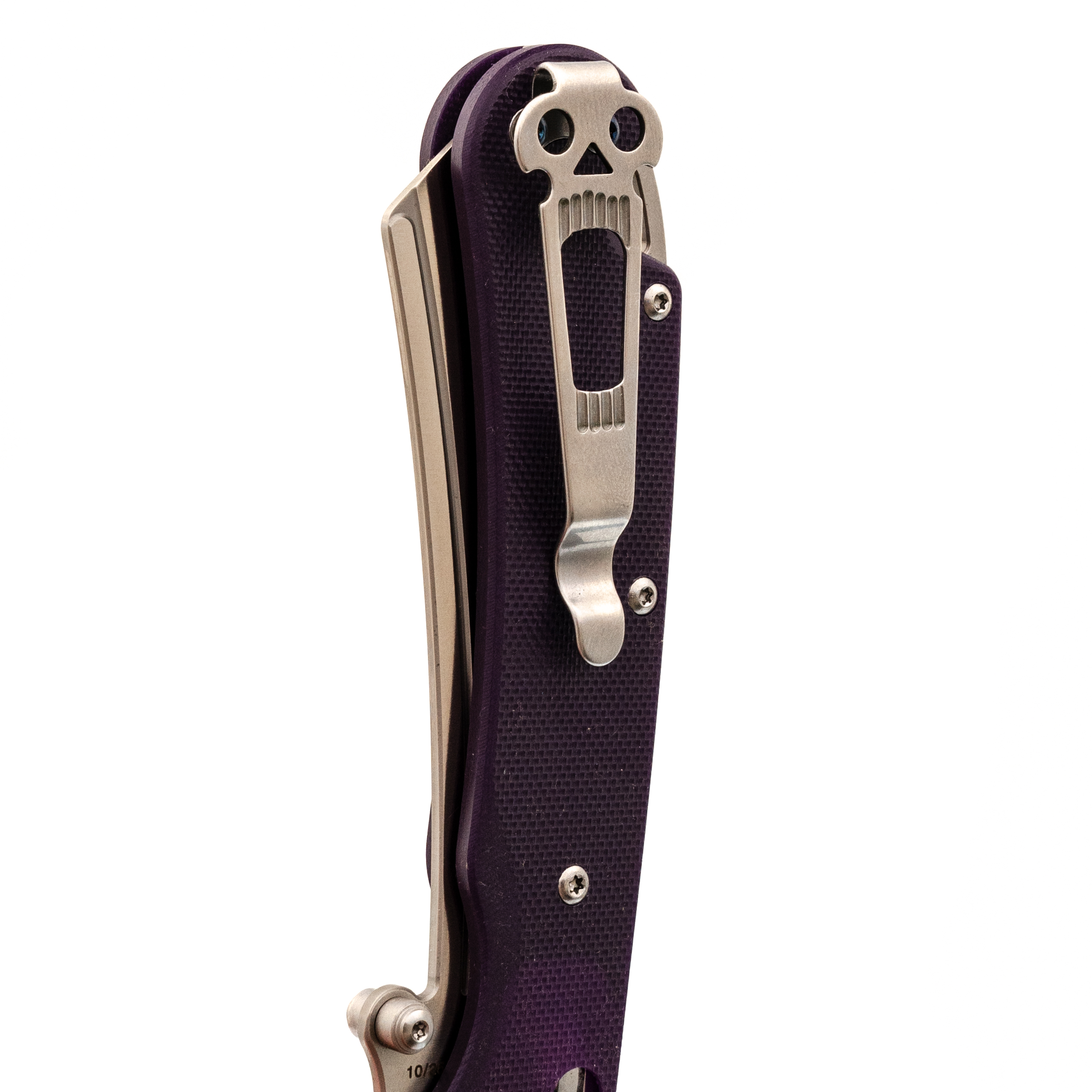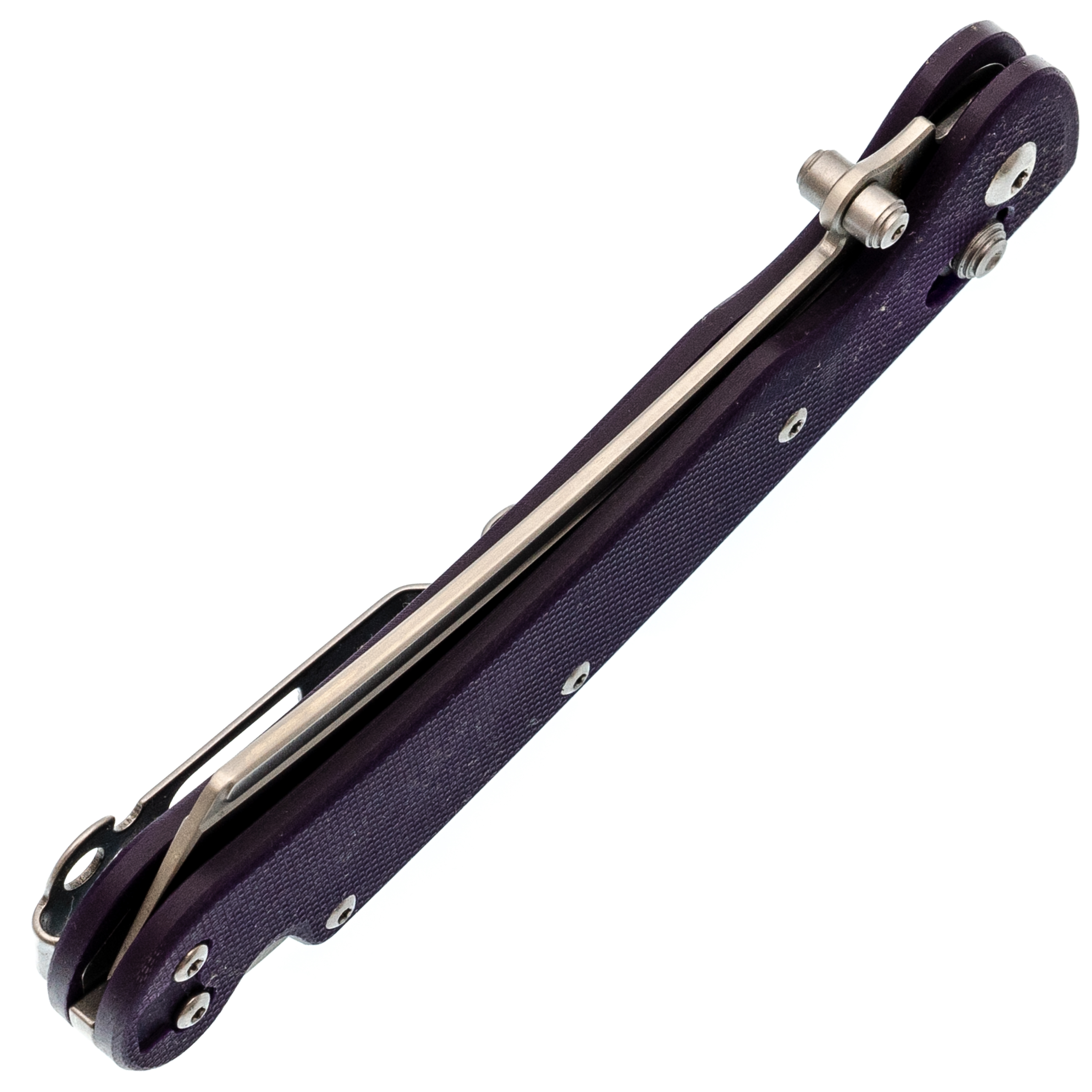 Рукоять из G10 выполнена в редком, изящном фиолетовом цвете, который выделяет Begemot среди других моделей. Изогнутая форма и подпальцевая выемка делают хват уверенным и комфортным. В бекспейсере предусмотрено темлячное отверстие для дополнительного удобства.