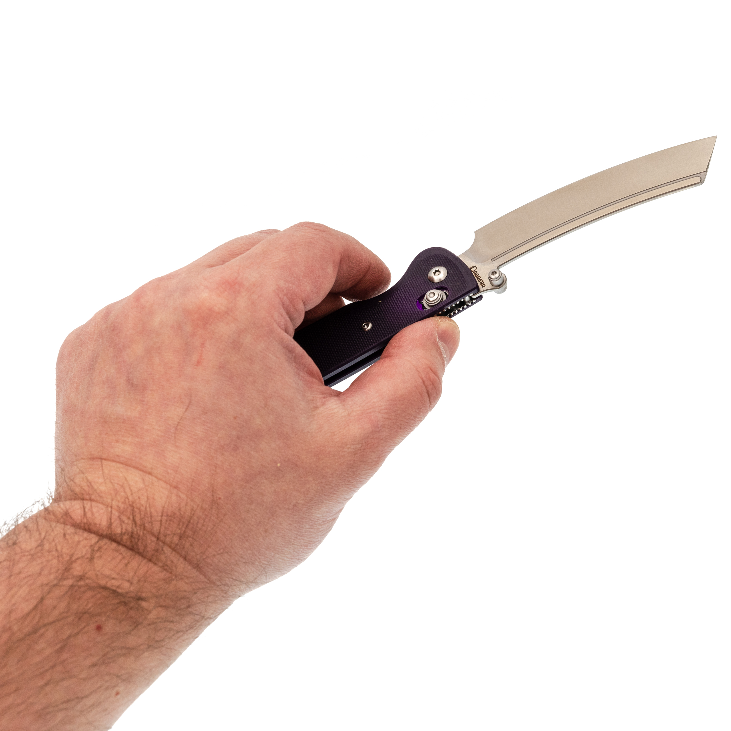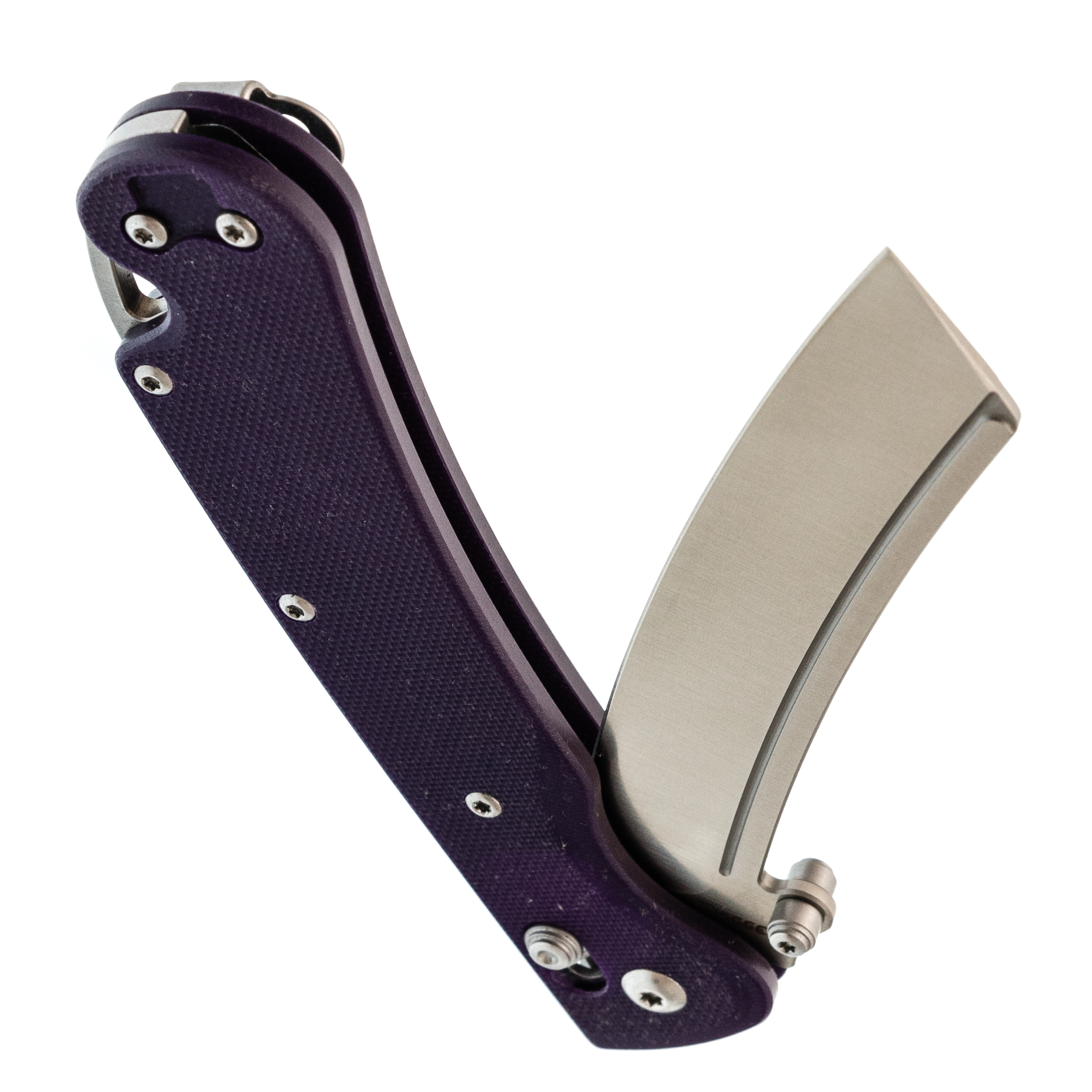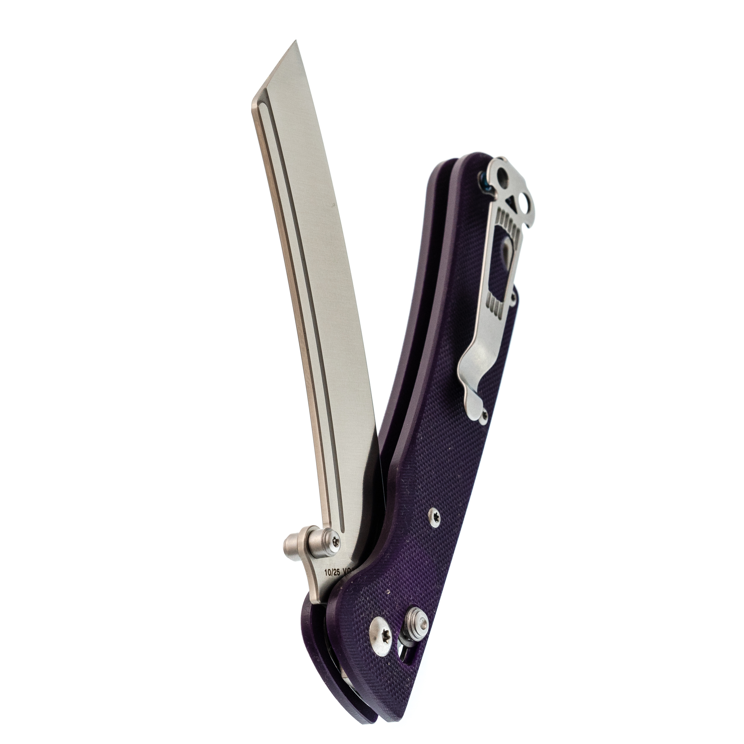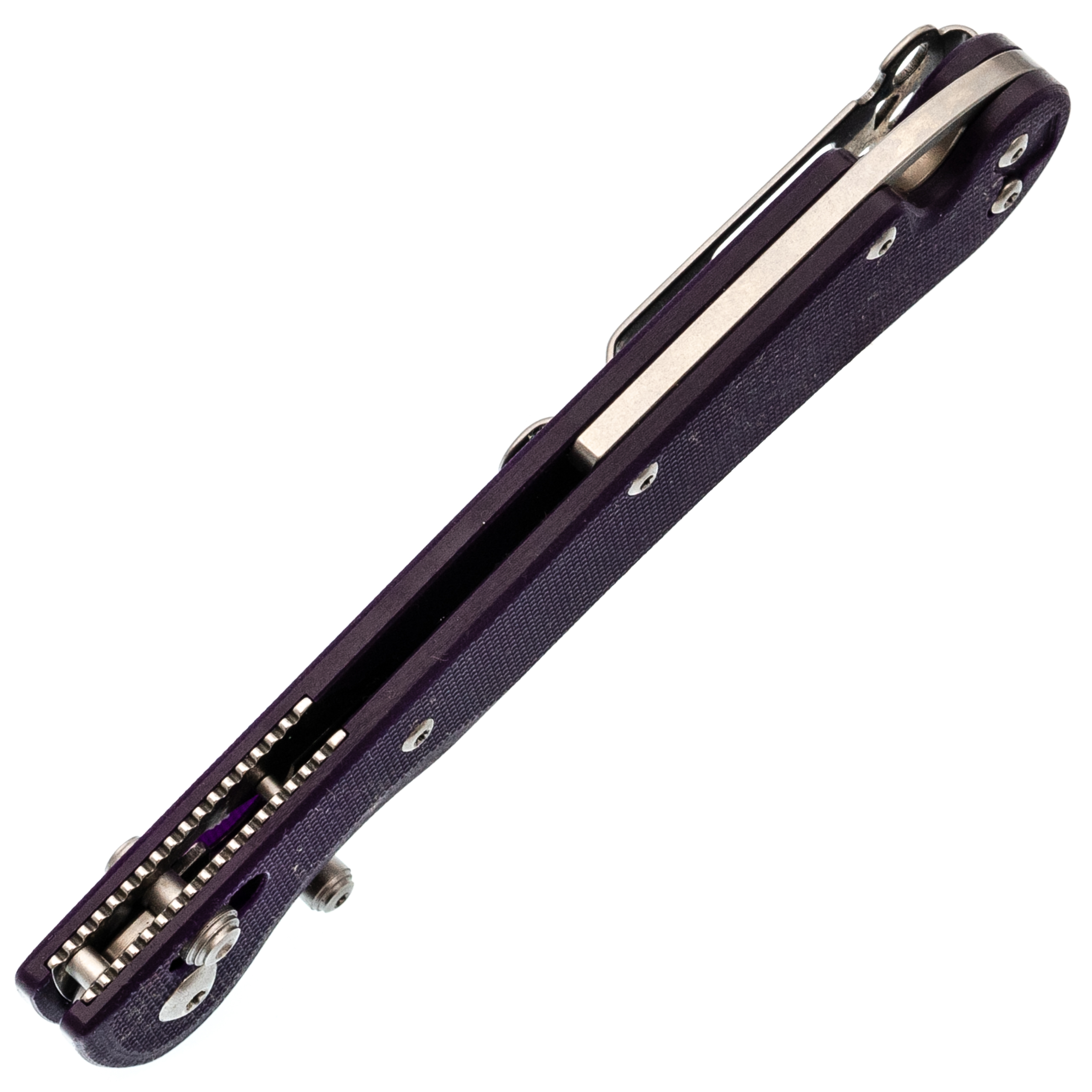 Рукоять из G10 выполнена в редком, изящном фиолетовом цвете, который выделяет Begemot среди других моделей. Изогнутая форма и подпальцевая выемка делают хват уверенным и комфортным. В бекспейсере предусмотрено темлячное отверстие для дополнительного удобства.