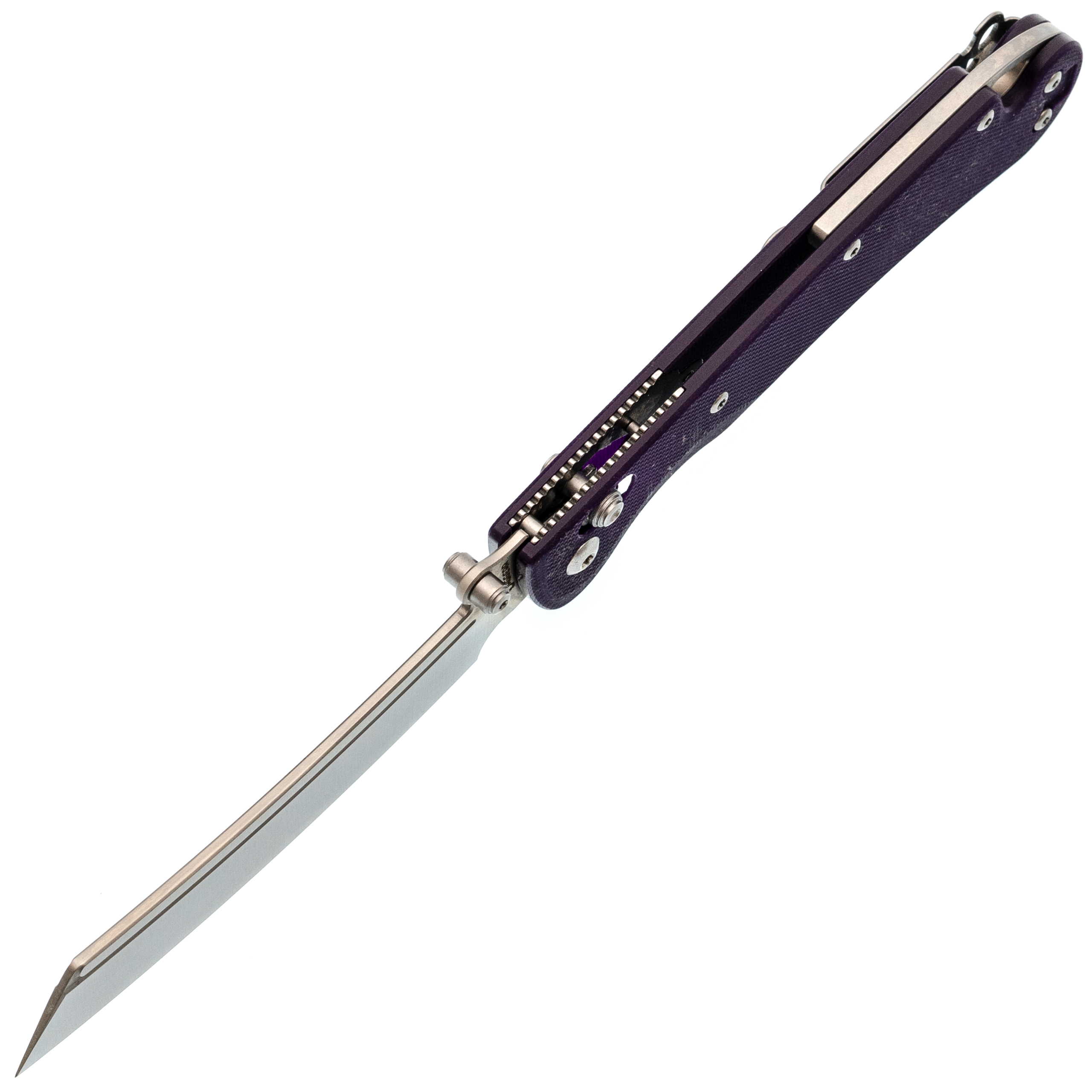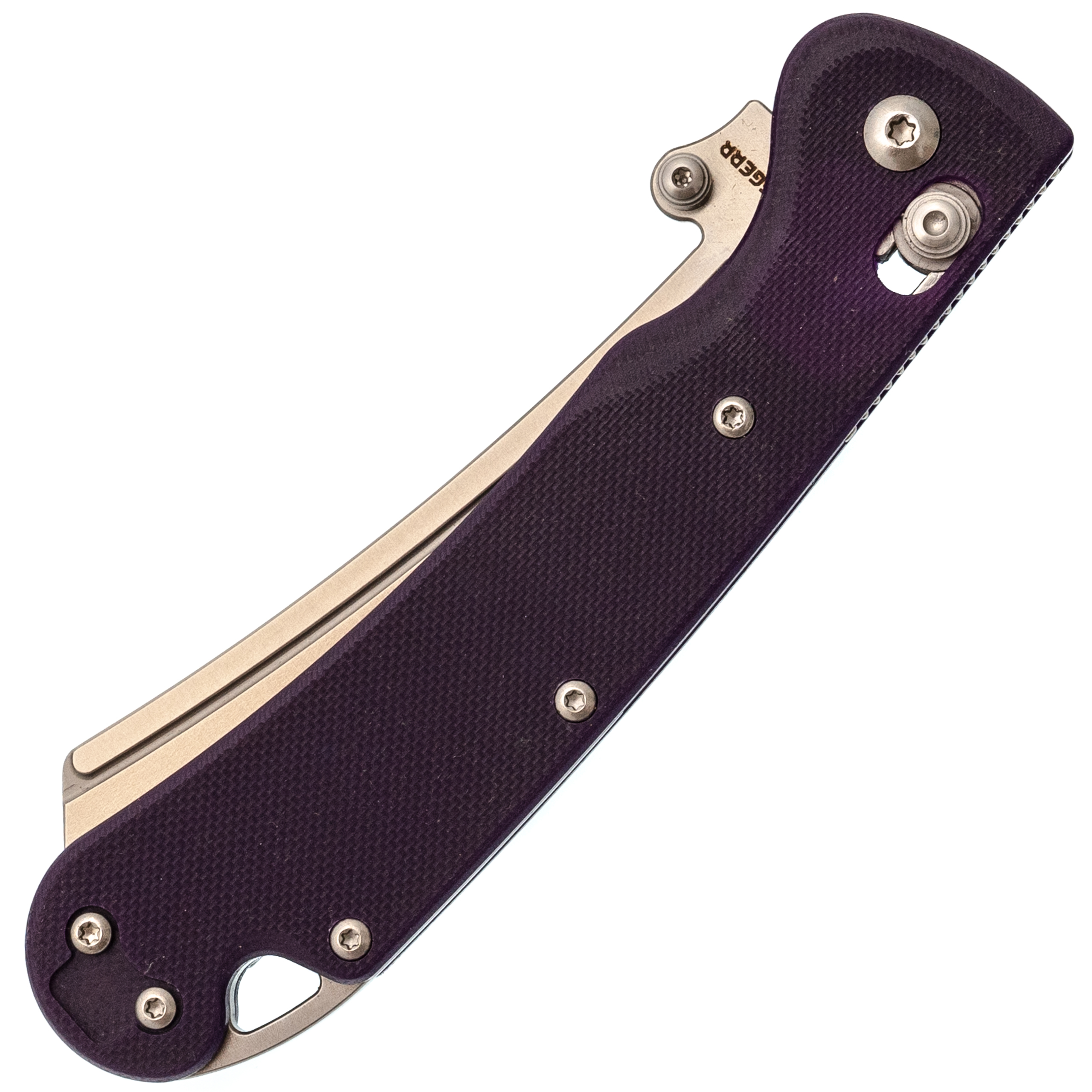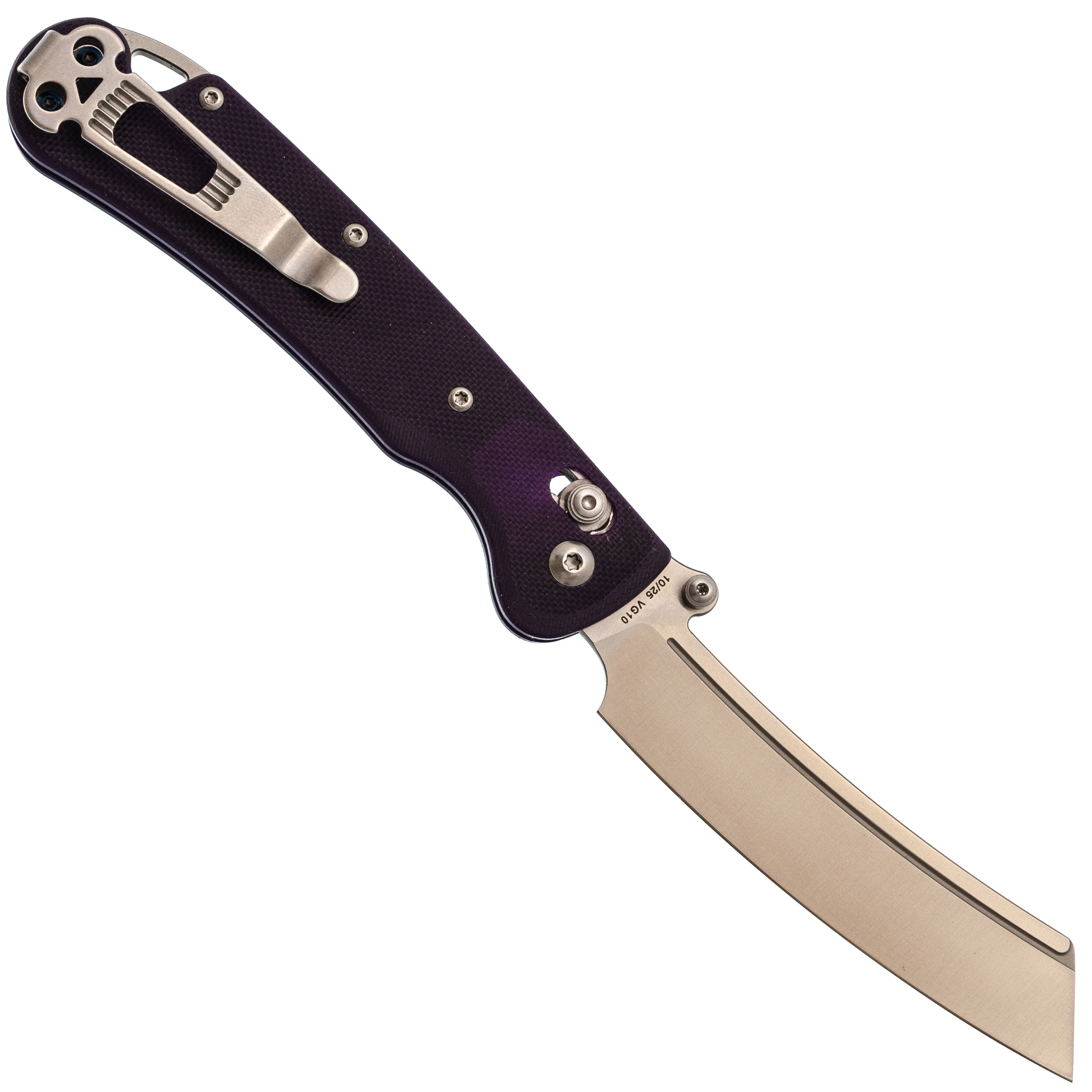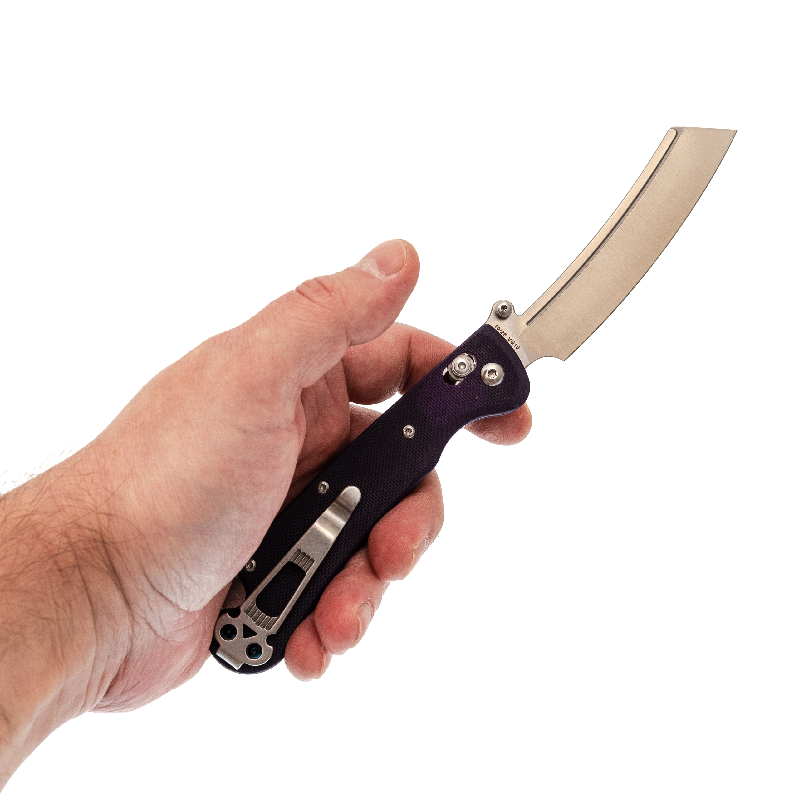 Рукоять из G10 выполнена в редком, изящном фиолетовом цвете, который выделяет Begemot среди других моделей. Изогнутая форма и подпальцевая выемка делают хват уверенным и комфортным. В бекспейсере предусмотрено темлячное отверстие для дополнительного удобства.
