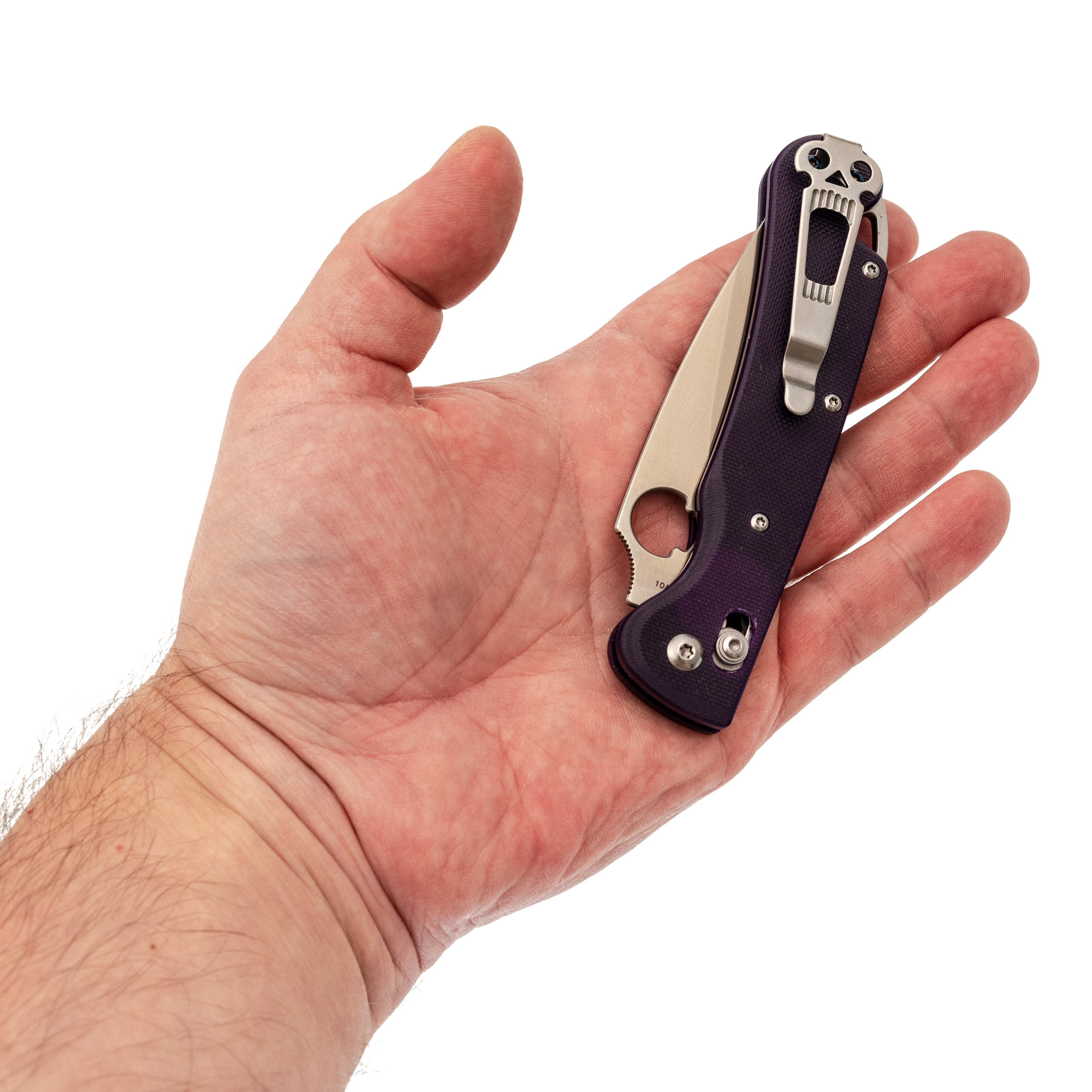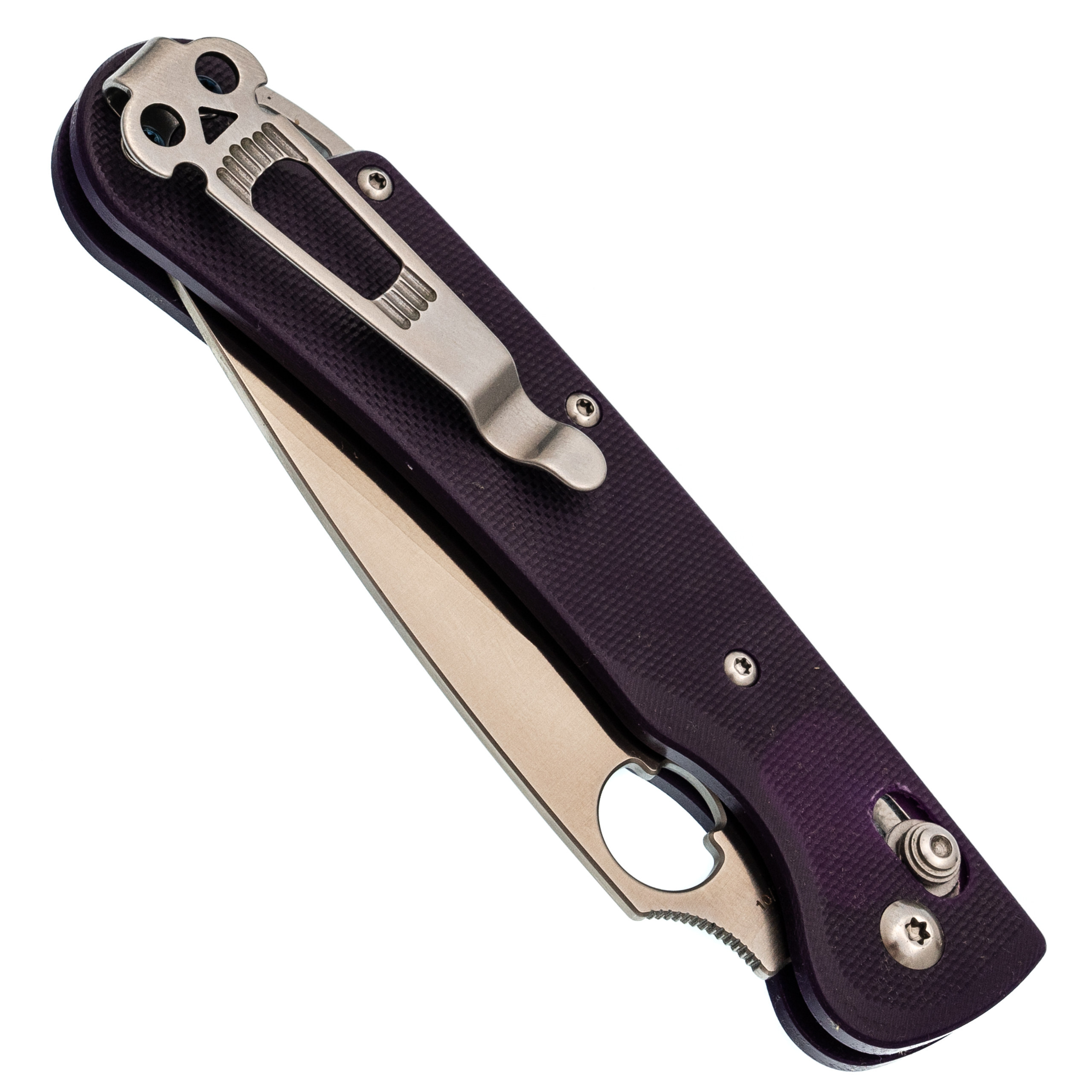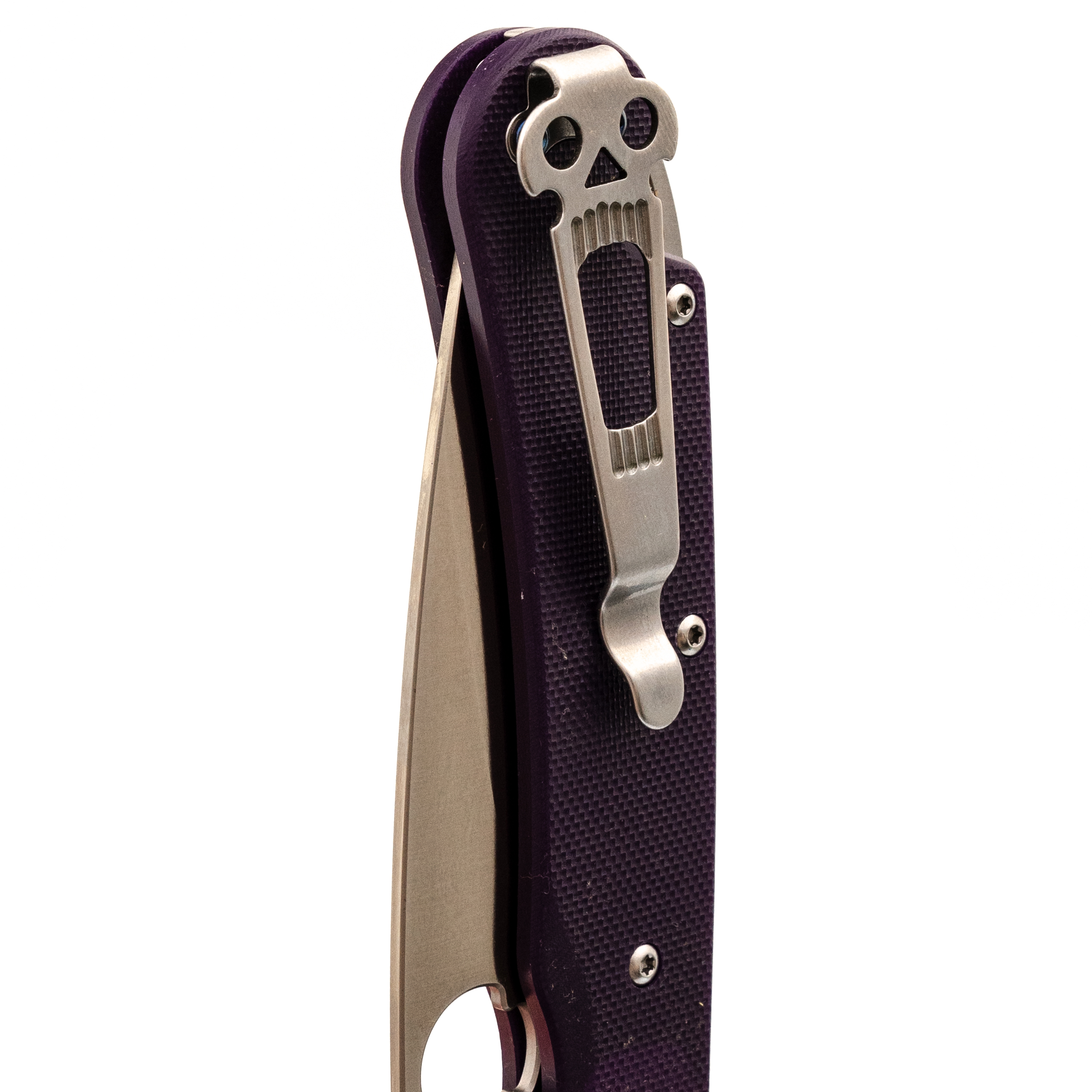 Рукоять имеет плавную изогнутую форму, благодаря чему нож уверенно лежит в ладони при разных вариантах хвата. Подпальцевая выемка помогает контролировать клинок при более плотной работе. Темлячное отверстие в бекспейсере и фирменная клипса с черепом делают ношение удобным и продуманным.