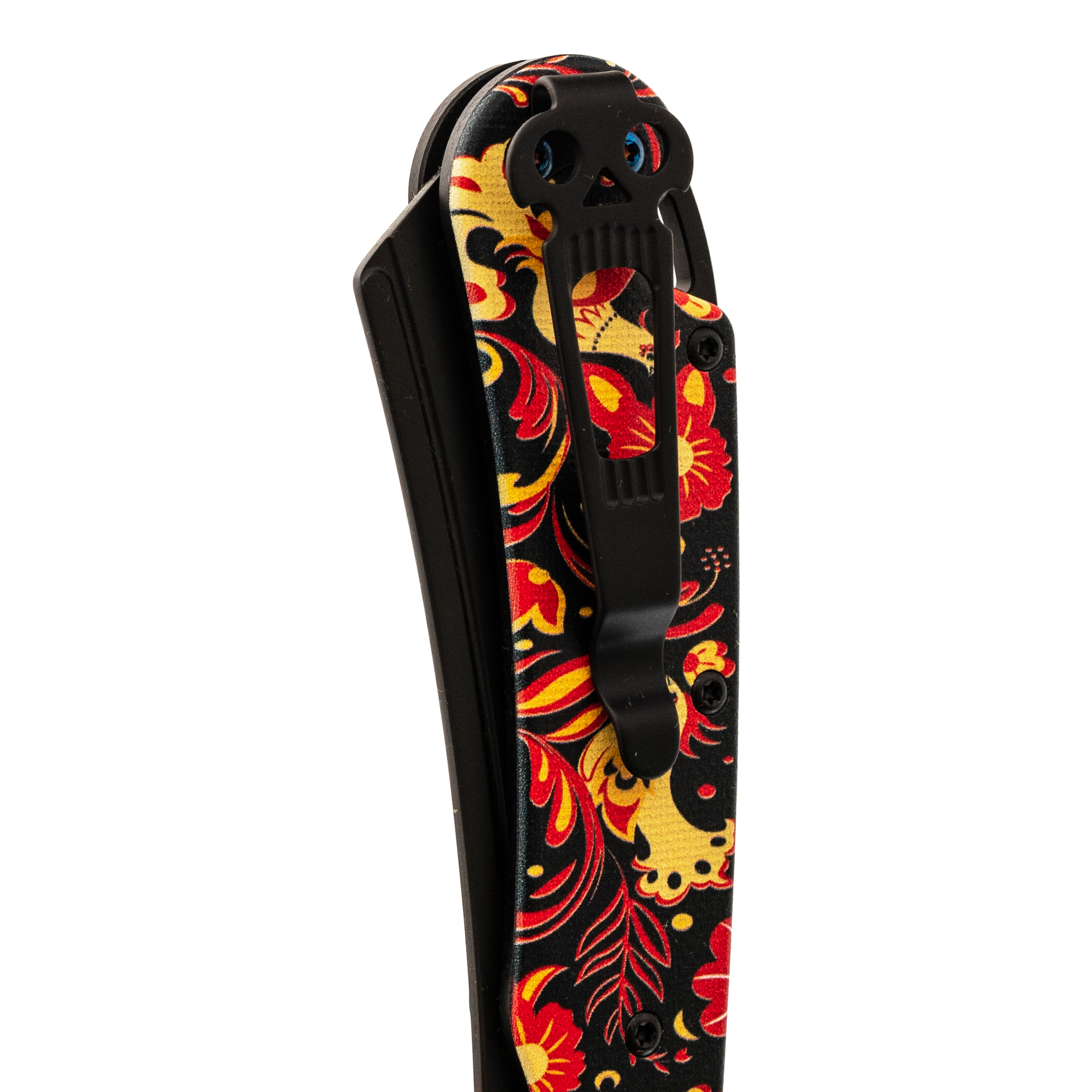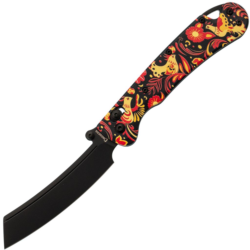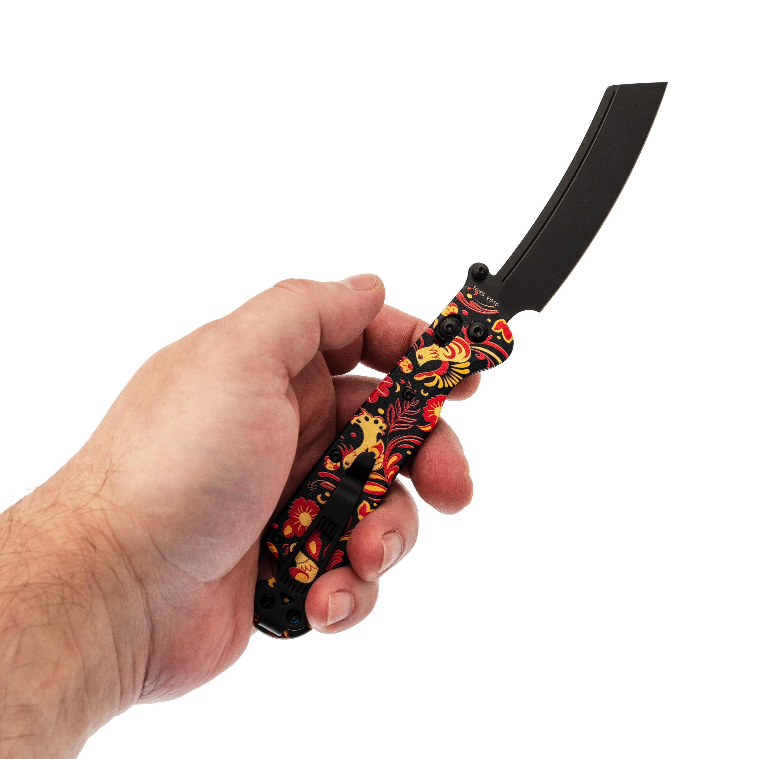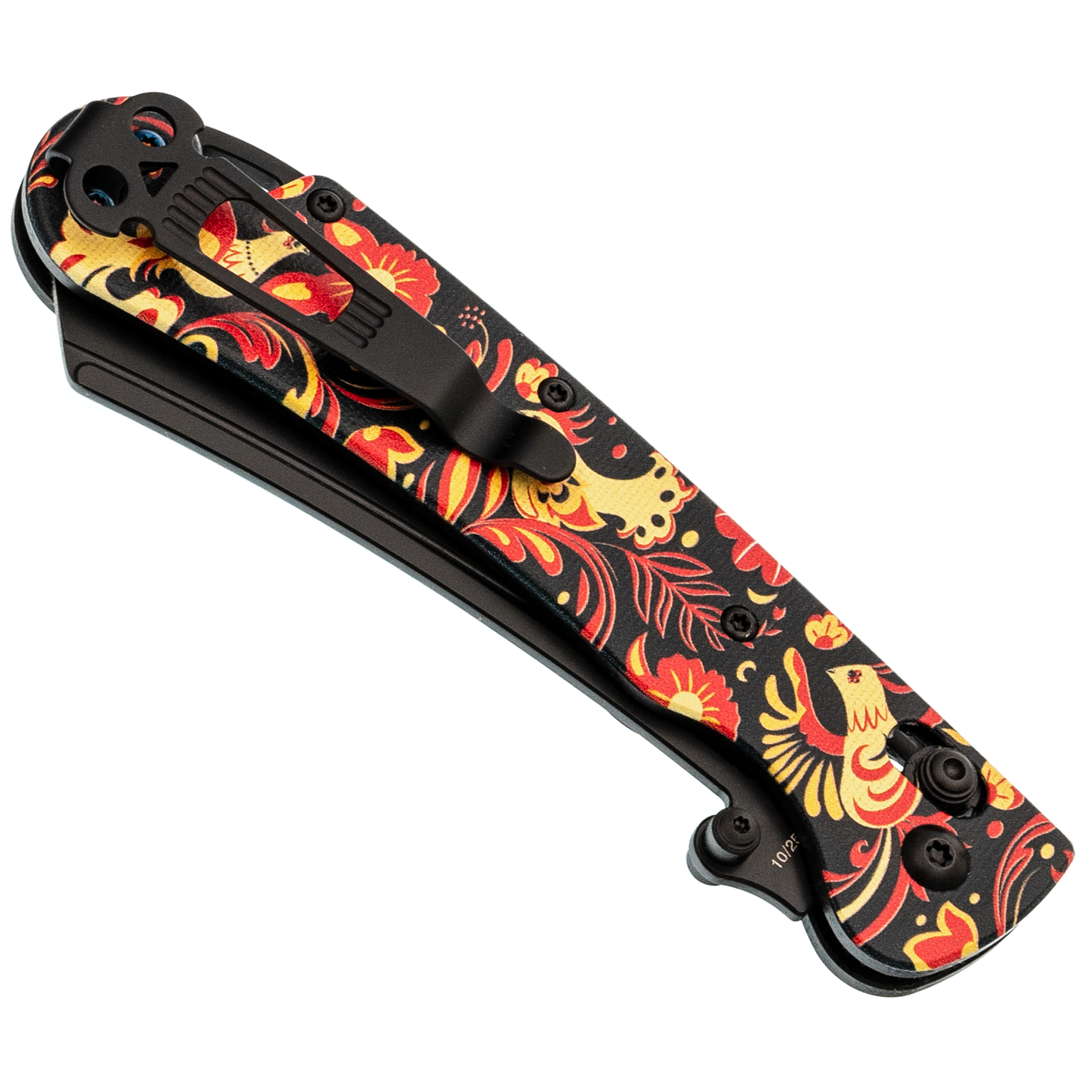 В этой версии Begemot выполнен в тематическом стиле хохлома, что делает модель заметной и необычной. При этом эргономика осталась прежней: изогнутая форма, подпальцевая выемка и уверенный хват. Темлячное отверстие аккуратно спрятано в бекспейсере.