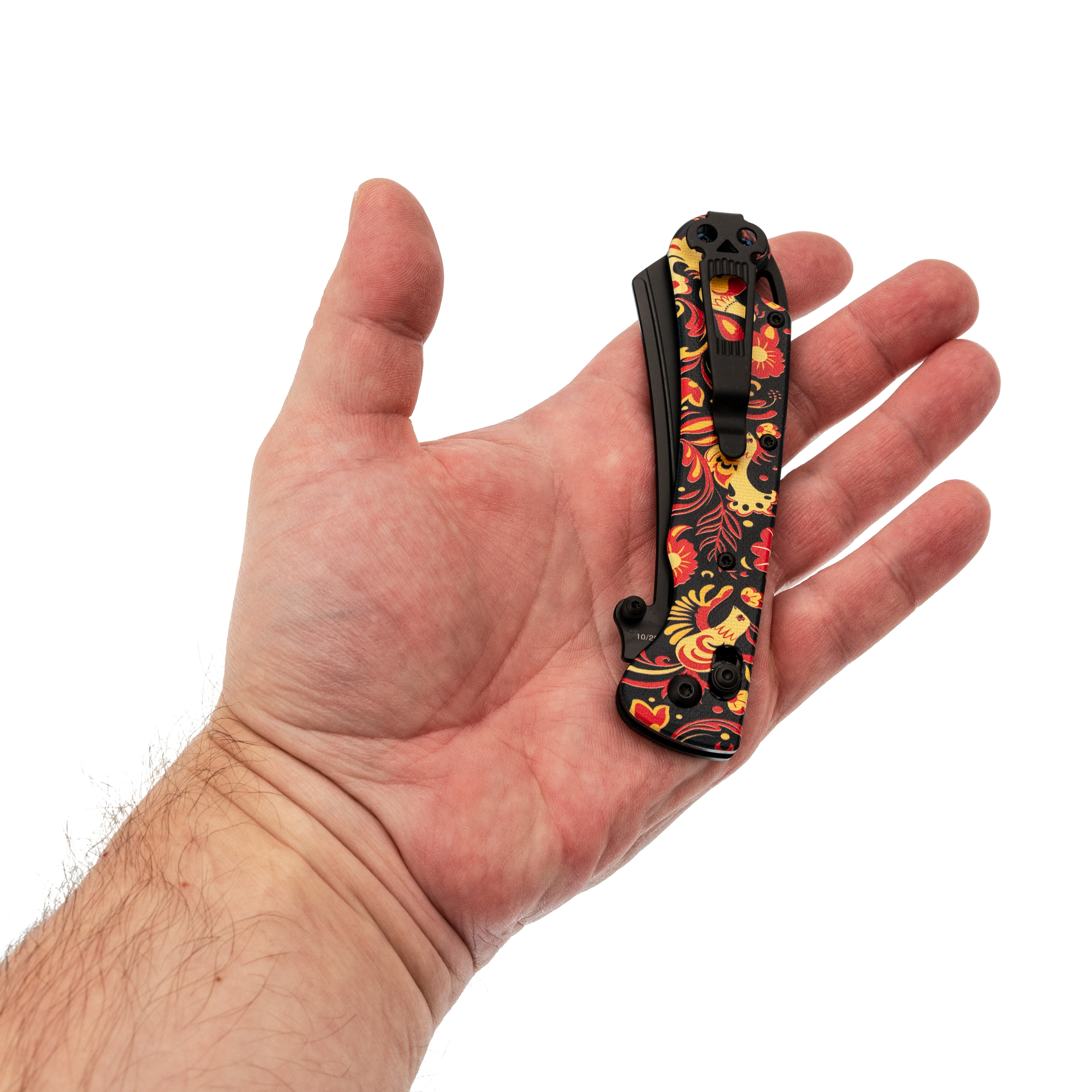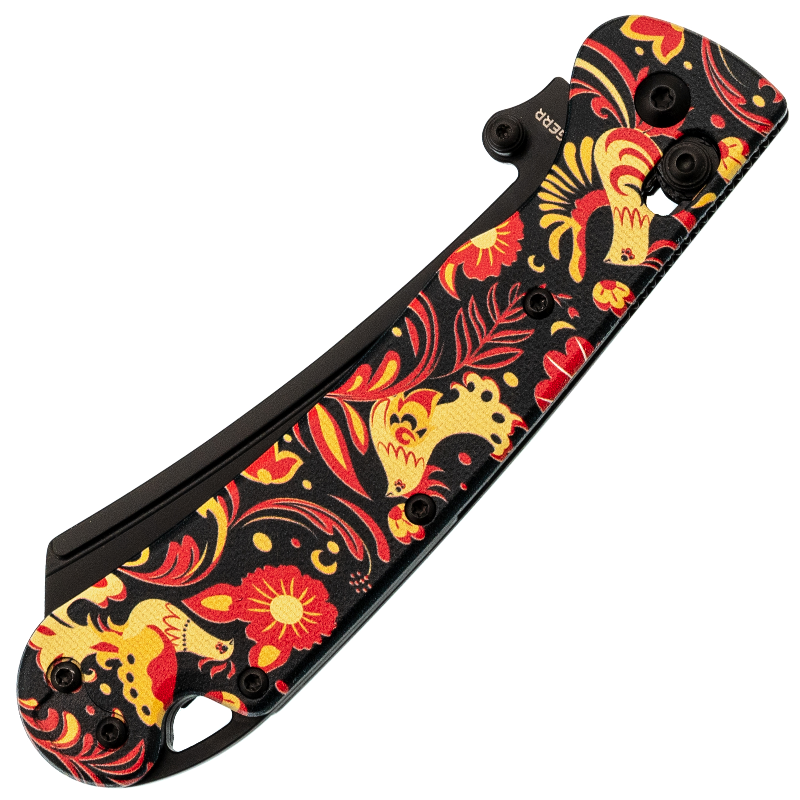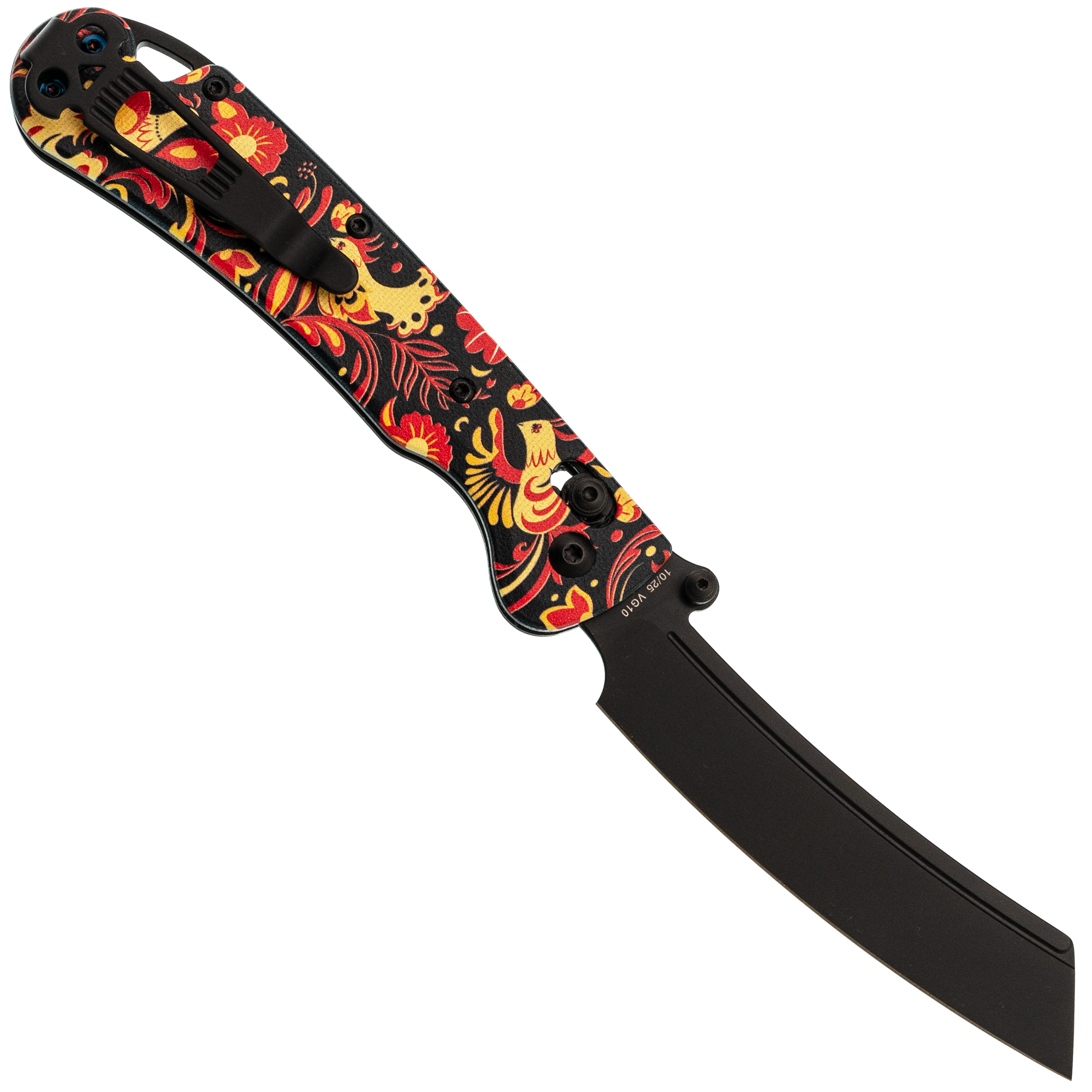 В этой версии Begemot выполнен в тематическом стиле хохлома, что делает модель заметной и необычной. При этом эргономика осталась прежней: изогнутая форма, подпальцевая выемка и уверенный хват. Темлячное отверстие аккуратно спрятано в бекспейсере.