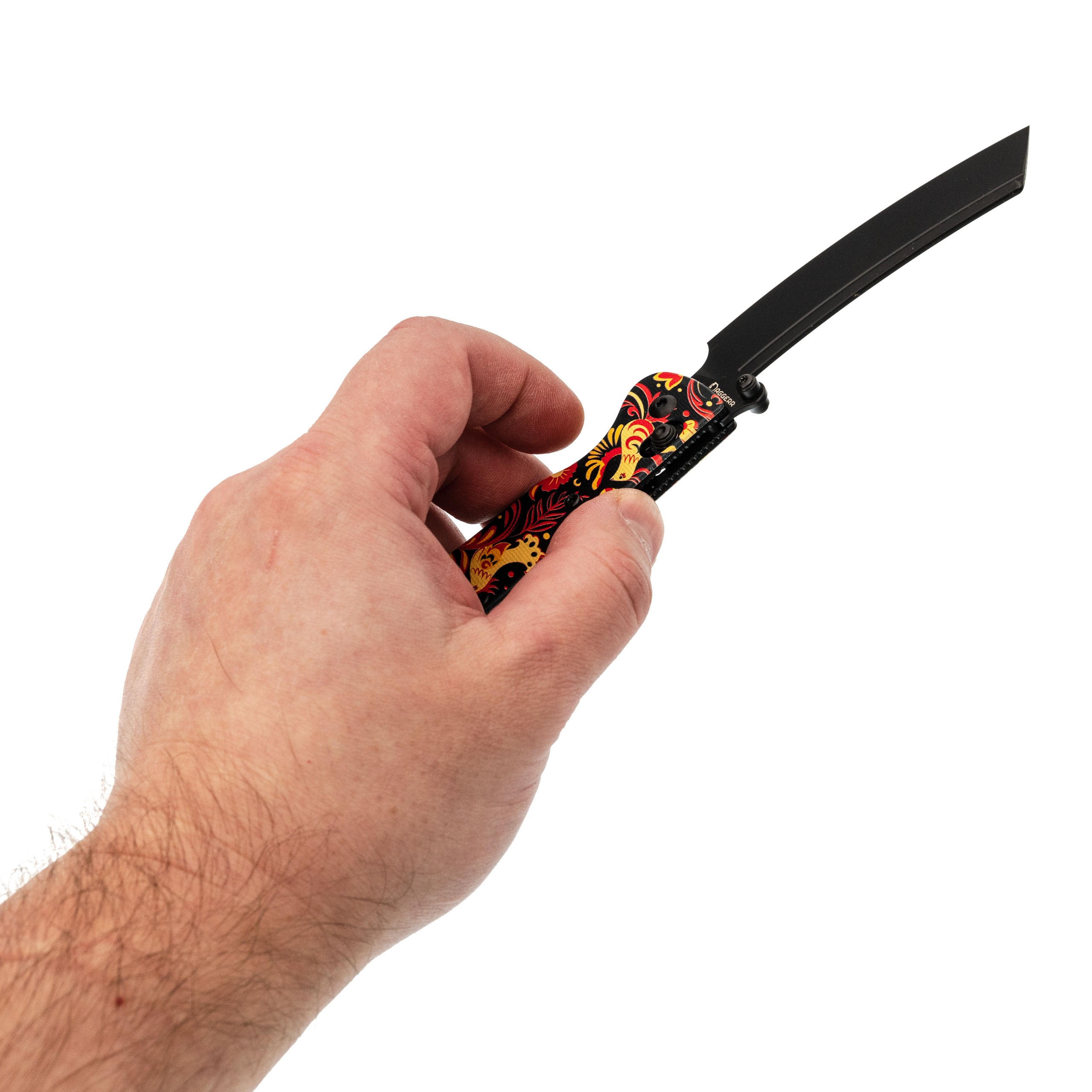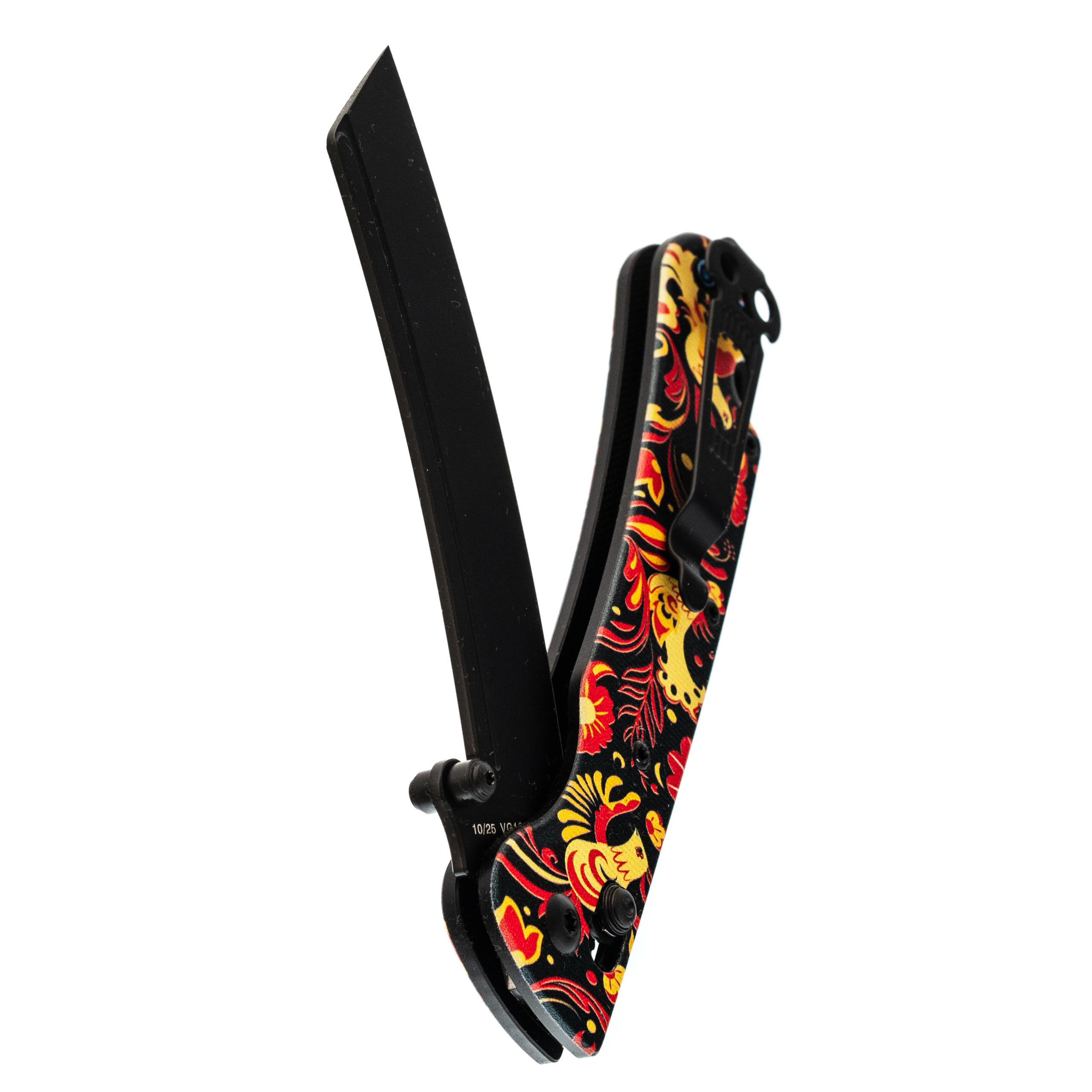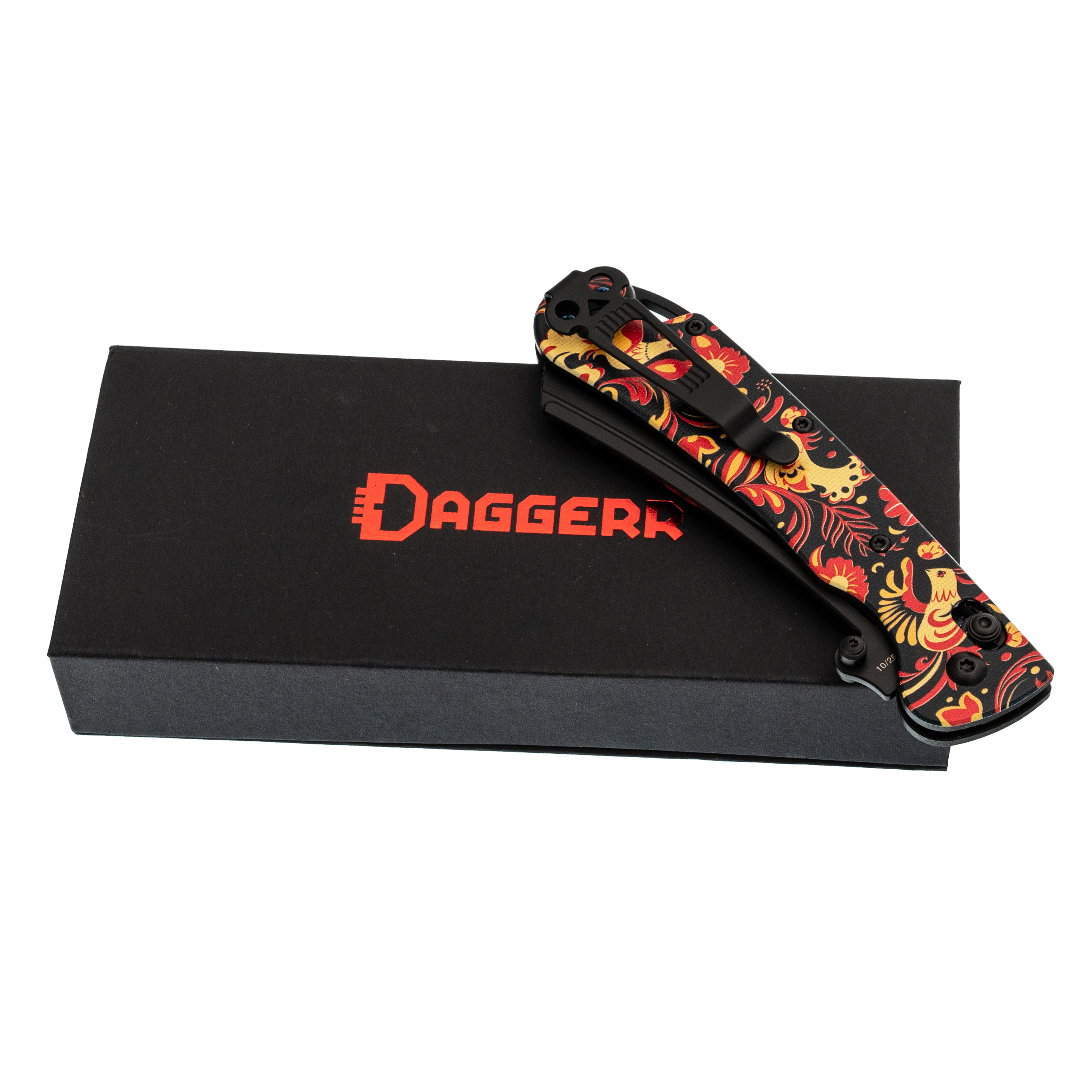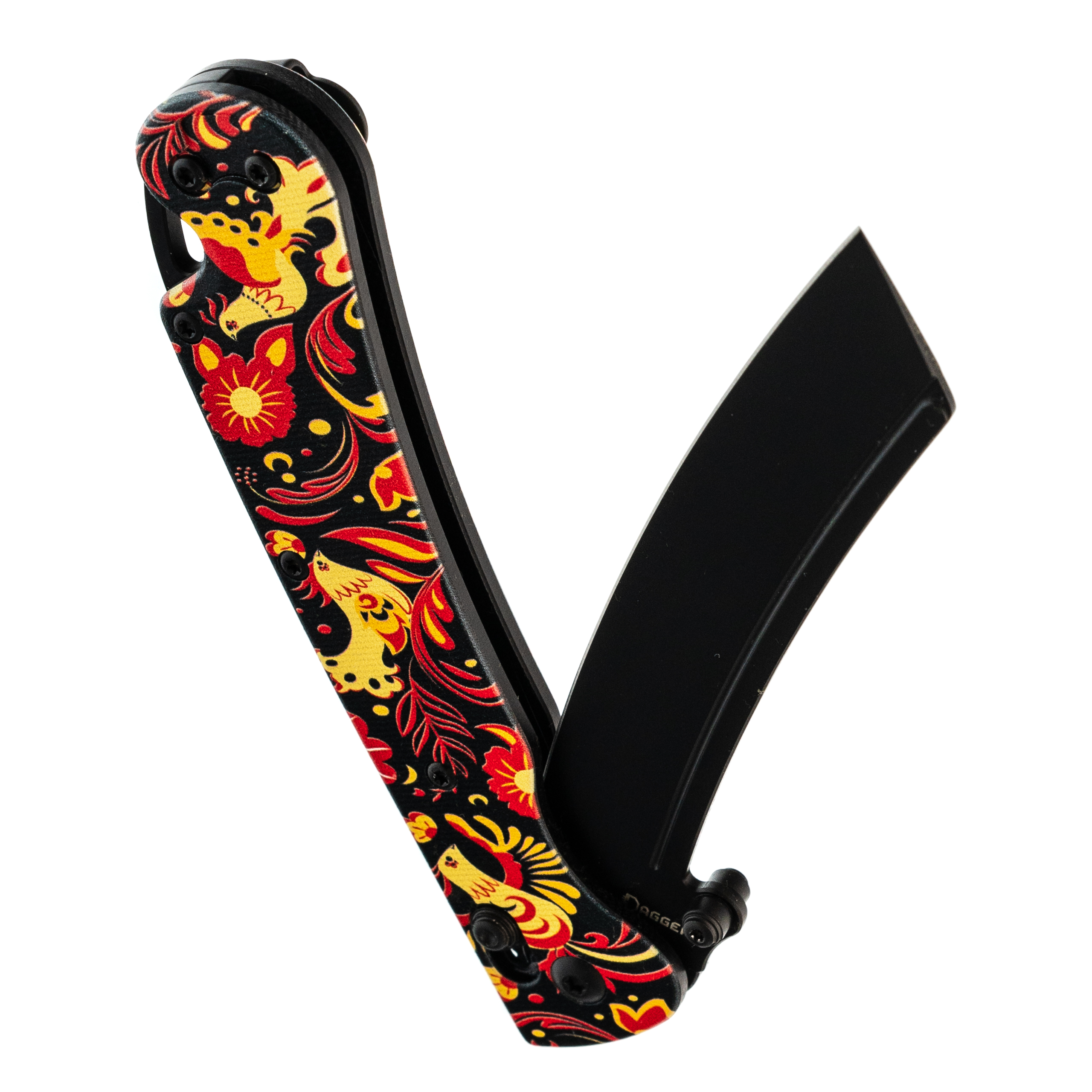В этой версии Begemot выполнен в тематическом стиле хохлома, что делает модель заметной и необычной. При этом эргономика осталась прежней: изогнутая форма, подпальцевая выемка и уверенный хват. Темлячное отверстие аккуратно спрятано в бекспейсере.