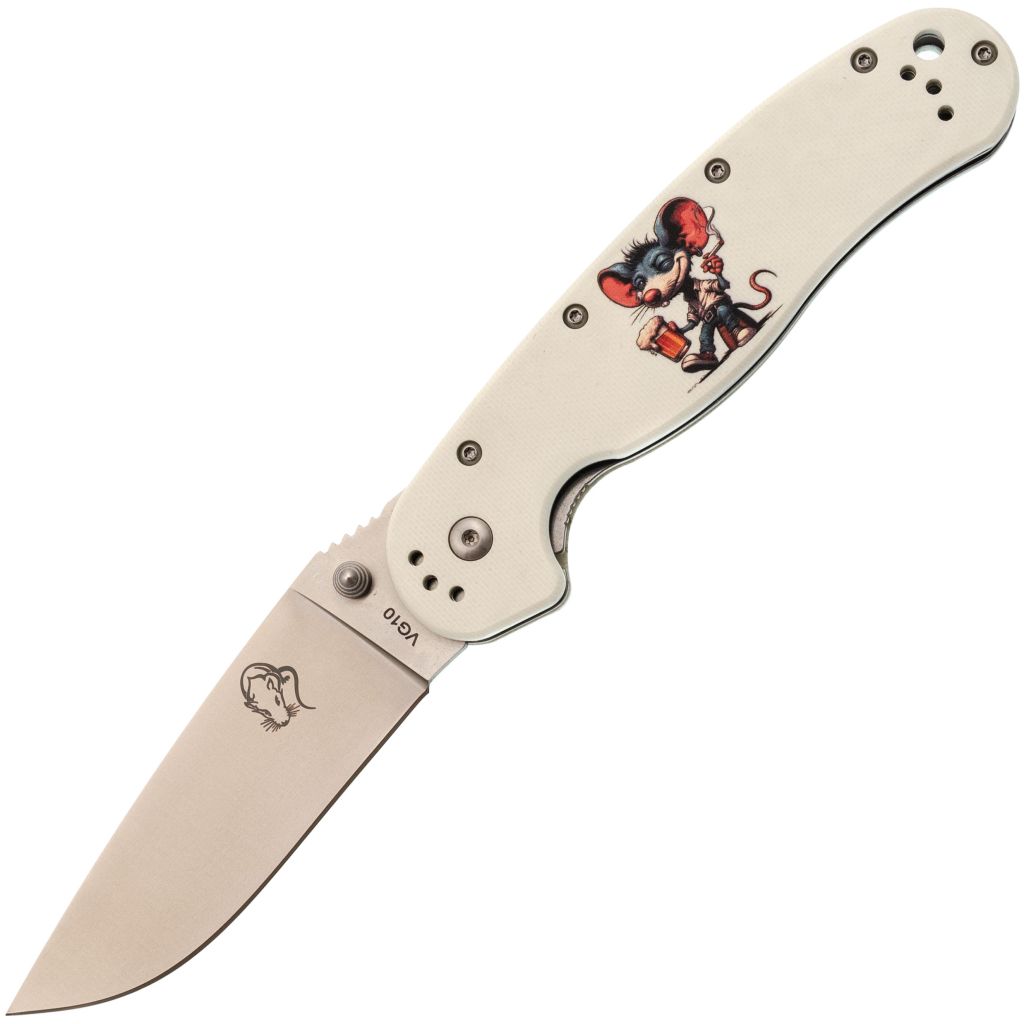 Форма рукояти удобная, с хорошим упором. На накладках - рисунок с крысой, радостно распивающей алкогольный напиток. Деталь неожиданная, но выполнена аккуратно и не мешает хвату. Клипса переставляемая, четыре варианта установки.