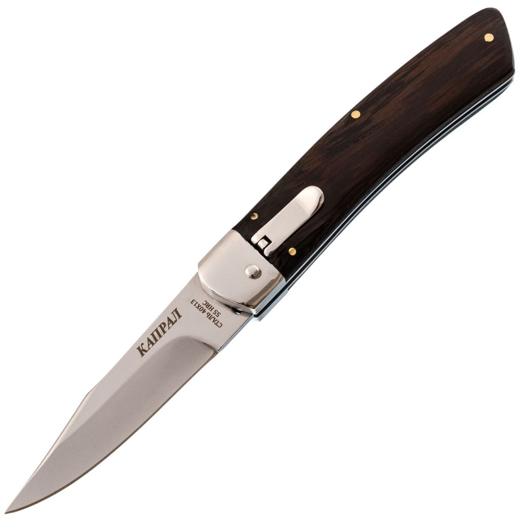 Представляем в продаже нож выкидной Капрал. Это компактная модель с коротким клинком длиной до 90 мм. Презентабельно выглядит и обладает прочной конструкцией, но использовать в качестве метательного не рекомендуется. Эргономичная рукоятка хорошо укладывается в ладони. Для ношения на одежде имеется откидная подпружиненная клипса. Клинок на каждый день с компактными габаритами из прочных материалов.