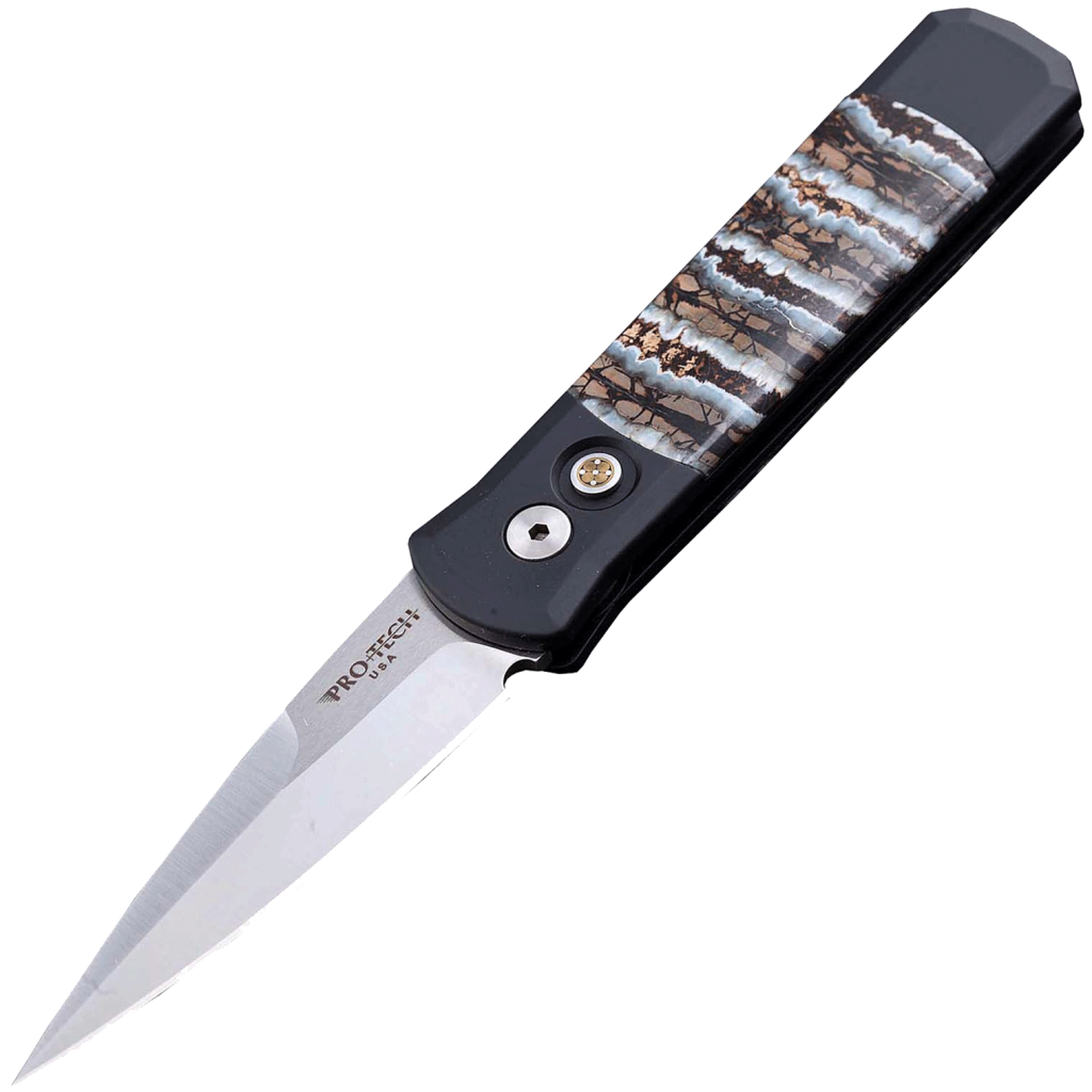 Автоматический складной нож Pro-Tech Santa Fe Stoneworks Godson Customized, сталь 154CM, рукоять алюминий, накладки зуб мамонта с поперечными коричневыми полосами