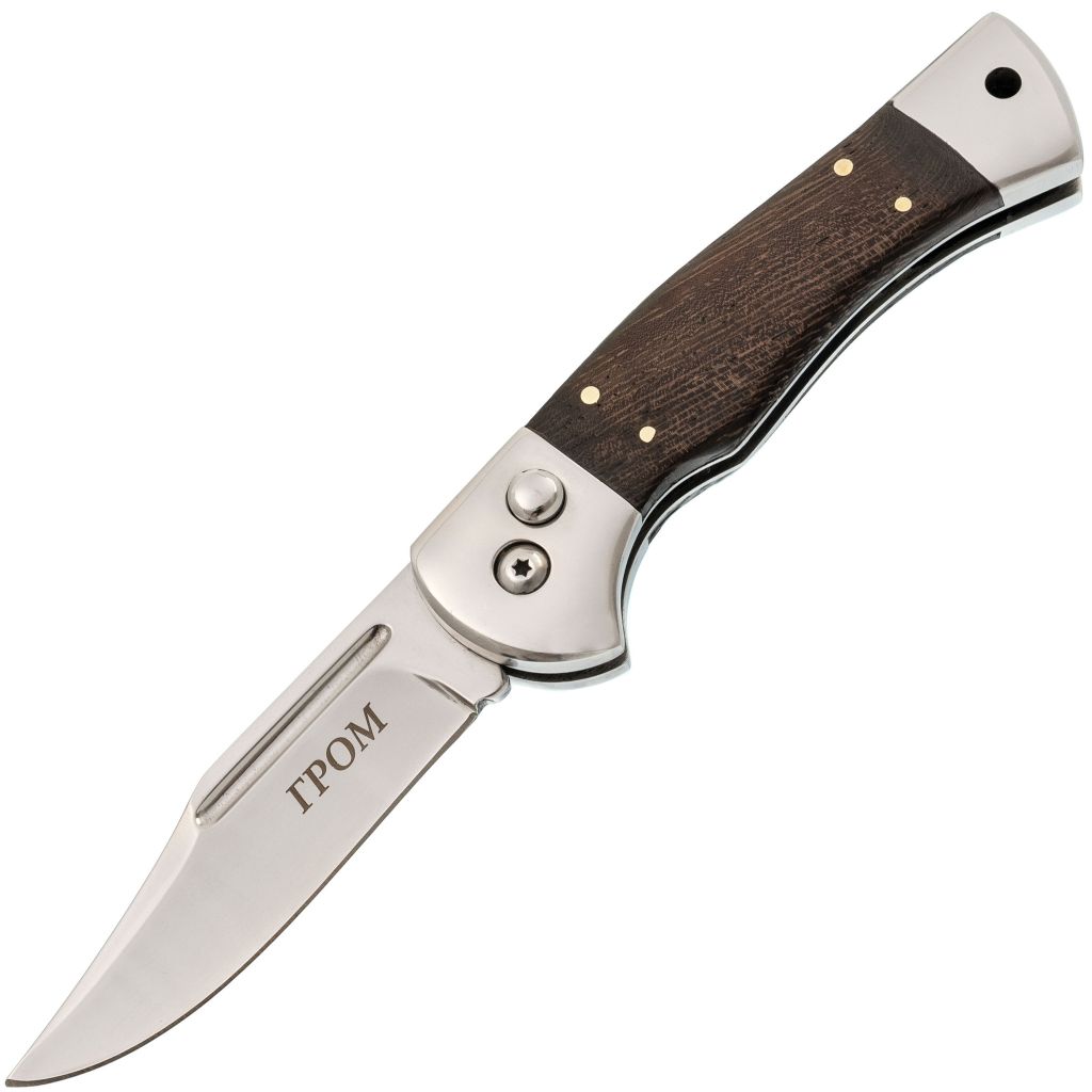 Достигайте впечатляющей скорости и эффективности работы с автоматическим ножом 'Гром'.Этот надежный и стильный инструмент был создан как классический рабочий нож с автоматическим открыванием благодаря которому вы сможете быстро извлечь клинок. Нержавеющая сталь 65х13 легко точится и имеет высокую ударную вязкость, а форма клинка Clip-Point не имеет высокую проникающую способность, но и максимально универсальна и справится с любыми задачами.Эргономичная рукоять из дерева со стальными больстерами и навершиями обеспечивает комфортное удержание ножа даже при длительной работе, а старомодный дизайн придаст вашему образу неповторимый шарм.Почувствуйте мощь и уверенность с ножом 'Гром' - надежным помощником в повседневных и экстремальных ситуациях.