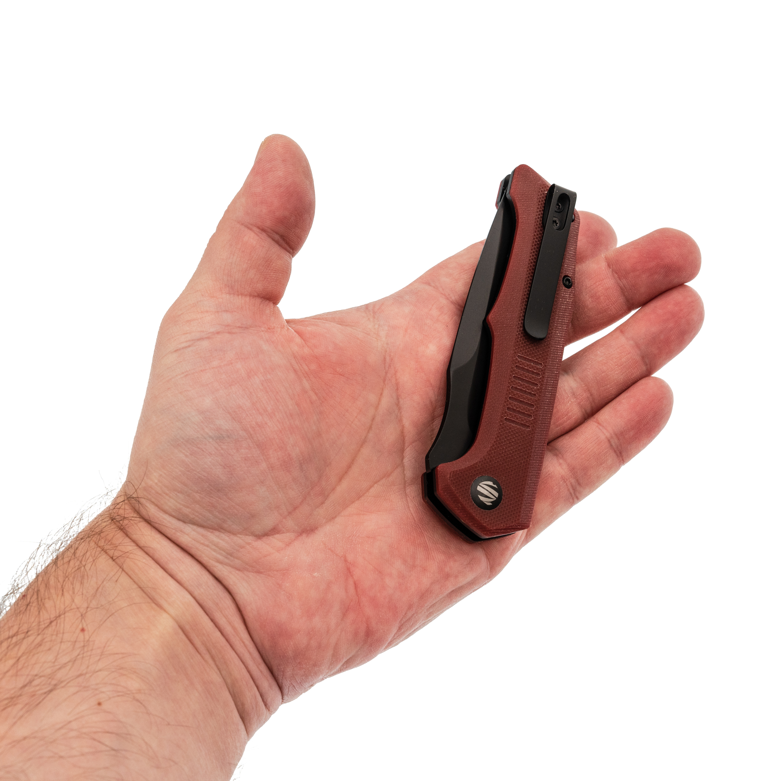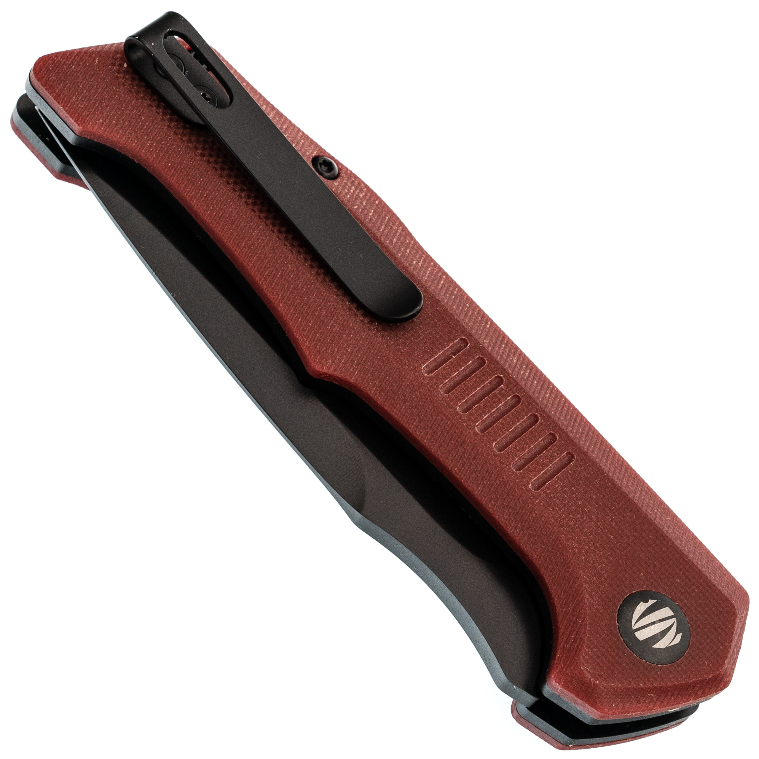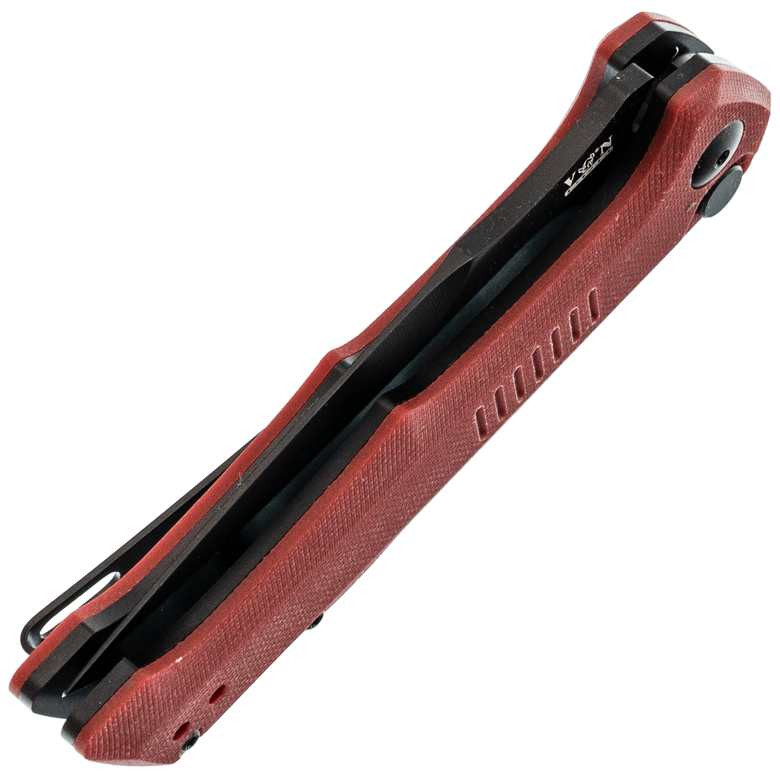 Изогнутый профиль и подпальцевые выемки сконструированы так, чтобы нож сидел в руке без смещения при нажатии на кнопку. Кнопка вынесена в расширенную часть рукояти - палец на ней не устает даже при многократном открывании. Форма исключает точки давления, которые обычно натирают при длительной работе.