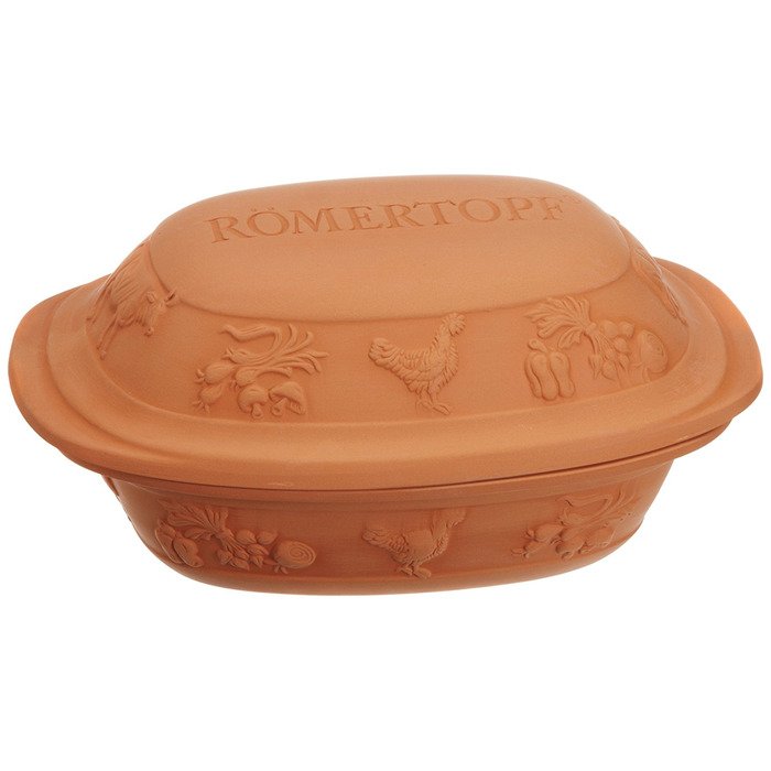 Жаровня подойдет для приготовления десертов, овощей, рыбы и мяса. Посуда выполнена в римском стиле с рустикальными мотивами. Отсылка к римскому дизайну обусловлена происхождением материала изделия - глины Вестервальда. Это пористая глина, которая хорошо впитывает влагу, отдавая ее в виде пара. Емкость рассчитана на блюдо на 4 человек. Изделие требует особого ухода: перед первым использованием его стоит замочить на сутки. Мыть жаровню стоит щетками из натуральных материалов без моющих средств. Чтобы отмыть загрязнения, достаточно замочить емкость и подождать, пока грязь отойдет. Основными преимуществами жаровни Römertopf являются: