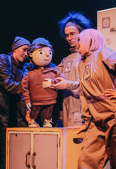 В спектакле задействованы как актеры в костюмах в живом плане, так и куклы разных система: планшетные, мимические, теневые.