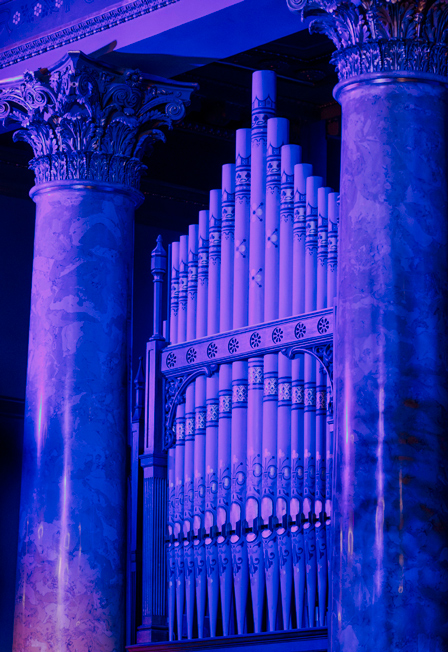 Концертный зал на Английской набережной Музыкального театра имени Ф.И. Шаляпина располагается в здании бывшей Англиканской церкви Иисуса Христа – архитектурном памятнике с более чем двухвековой историей, созданном Джакомо Кваренги – одним из архитекторов рубежа XVIII-XIX веков, определивших облик столичного Санкт-Петербурга. В последней четверти XIX века здание было перестроено архитектором Федором Болтенгагеном: самым значительным изменениям подверглось внутреннее убранство церковного зала, где на смену строгому классицизму пришли цвет, богатая роспись и разнообразие материалов. Завершили новый облик римские мозаики и уникальный ансамбль из 15 витражей, созданных английской мастерской «Heaton, Butler & Bayne» – сегодня это единственный в России образец английского витражного искусства конца XIX века. Орган фирмы «Brindley and Foster», выполненный в романтическом духе, был доставлен в Петербург в 1877 году. Органный механизм инструмента по звучанию и конструкции превосходил все существовавшие тогда в Европе: с ручным качанием и тремя клавиатурами на двадцать три голоса. Сегодня это единственный сохранившейся на территории России британский орган, восстановленный по самым современным технологиям.