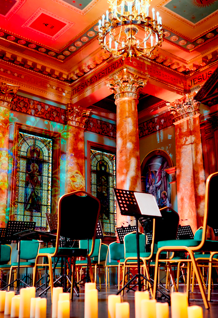 Концертный зал на Английской набережной Музыкального театра имени Ф.И. Шаляпина располагается в здании бывшей Англиканской церкви Иисуса Христа – архитектурном памятнике с более чем двухвековой историей, созданном Джакомо Кваренги – одним из архитекторов рубежа XVIII-XIX веков, определивших облик столичного Санкт-Петербурга. В последней четверти XIX века здание было перестроено архитектором Федором Болтенгагеном: самым значительным изменениям подверглось внутреннее убранство церковного зала, где на смену строгому классицизму пришли цвет, богатая роспись и разнообразие материалов. Завершили новый облик римские мозаики и уникальный ансамбль из 15 витражей, созданных английской мастерской «Heaton, Butler & Bayne» – сегодня это единственный в России образец английского витражного искусства конца XIX века. Орган фирмы «Brindley and Foster», выполненный в романтическом духе, был доставлен в Петербург в 1877 году. Органный механизм инструмента по звучанию и конструкции превосходил все существовавшие тогда в Европе: с ручным качанием и тремя клавиатурами на двадцать три голоса. Сегодня это единственный сохранившейся на территории России британский орган, восстановленный по самым современным технологиям.