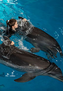 Это специально организованная программа, когда вы не просто находитесь в воде рядом с дельфинами, а плаваете с ними. Вы опуститесь в воду, а дельфины подставят вам свой плавничок и провезут по кругу бассейна. Чувство счастья от знакомства и единения с морским миром будет одним из самых ярких в вашей жизни. Температура воды в бассейне: +25 градуса в любое время