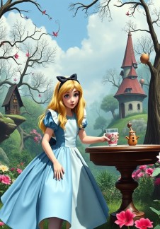 Сквозь зеркальные двери, то появляющиеся, то исчезающие, она попадает то в абсурдное чаепитие, где время застыло на 17:00, то в сад, где цветы обсуждают её наряд с язвительной вежливостью.