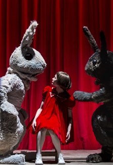 «Беги, Алиса, беги» - это настоящий экшн в самых масштабных декорациях Театра на Таганке, с огромными младенцами, гигантскими советскими чашками, ростовыми куклами, мультимедийными проекциями и стихами Владимира Высоцкого из радиопьесы «Алиса в стране чудес» на музыку современного композитора Ивана Кушнира.