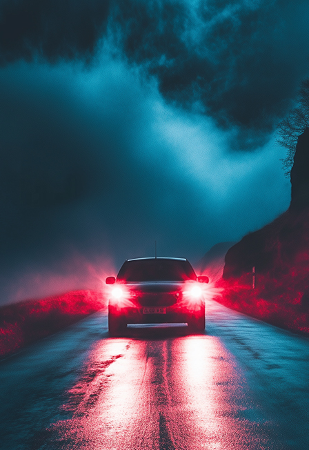 Действие происходит на шоссе в темное время суток.