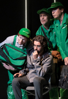 Дмитрий ДаниловБытовой абсурдРежиссёр — Алексей Кузмин-ТарасовСценография и костюмы — Ольга БогатищеваСвет — Владислав ФроловSound design — Анна ЗобоваОператор — Максим КлёновМонтаж видео — Анна Зобова, Екатерина БурлаковаПедагог по вокалу — Оксана ГлобаПомощник режиссёра — Мария КозярМолодой режиссер Алексей Кузмин-Тарасов поставил спектакль с интригующим названием «Сережа очень тупой». Так же называется и пьеса Дмитрия Данилова, которая легла в основу спектакля. Произведение Данилова можно в какой-то мере причислить к корпусу драматургии театра абсурда. В типовую московскую однушку, где живут тридцатилетние супруги Сережа и Маша, заявляются три курьера из таинственной Службы Доставки с посылкой от неизвестного отправителя. Перед этим они, конечно же, позвонили хозяину дома и предупредили, что будут в течение часа. К ужасу Сережи, «в течение часа» в этой Службе подразумевают не дорогу, а нахождение у клиента в течение часа. И вот эти странные люди в зеленой униформе высиживают положенное время, отвлекая программиста Сережу от работы и заставляя играть в города…Действующие лица и исполнители:Сергей — Денис АврамовМаша — Елизавета БойкоПервый курьер — Василий ФирсовВторой курьер — Тагир РахимовТретий курьер — Николай Орловский, Вениамин КраснянскийПродолжительность: 1 час 30 минут (без