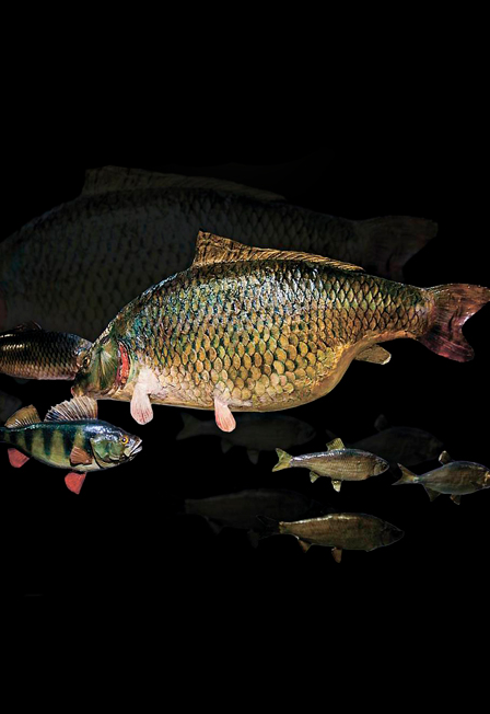 В зале располагается сухой аквариум с представителями местной ихтиофауны.