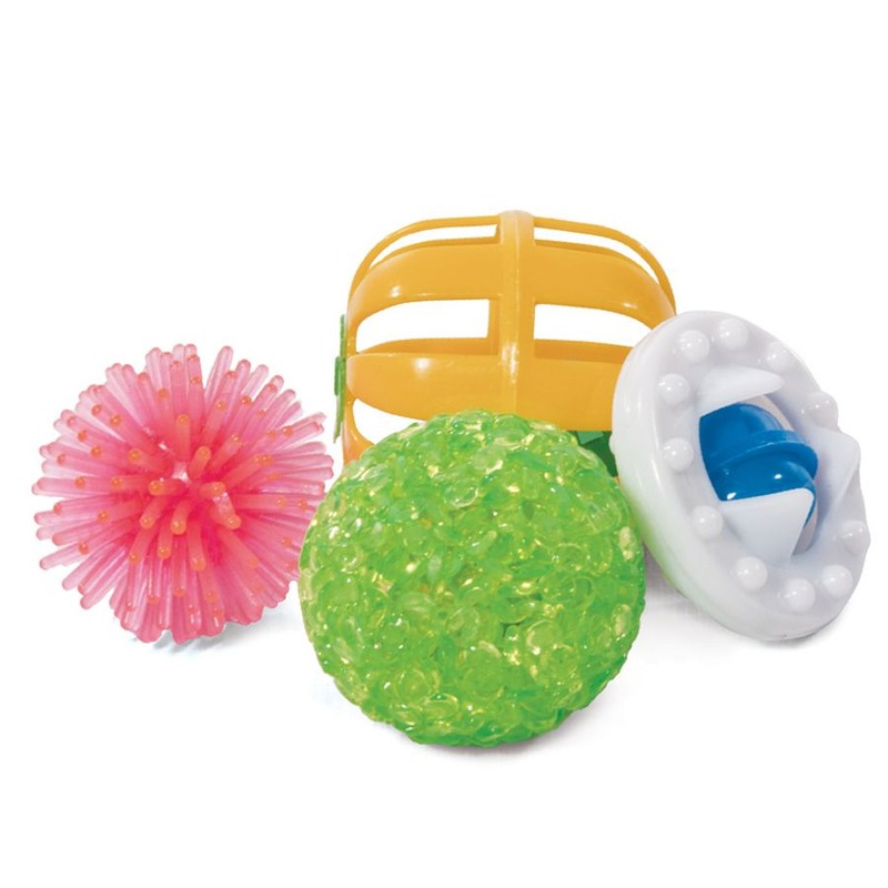 Этот набор из четырех ярких игрушек - отличный вариант для активной и разнообразной игры с пушистыми питомцами. В комплект входят: погремушка, диаметром 40 мм; мяч-эллипс с колокольчиком внутри (d45мм); мяч зернистый (d40мм), мяч шуршик 35 мм . С такими игрушками маленькие котята хорошо развиваются, а взрослые животные - держат себя в тонусе и оттачивают охотничьи навыки. Набор упакован в блистер.