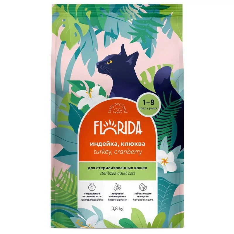 Florida Turkey & Cranberries - сухой корм супер-премиум класса с индейкой и клюквой для стерилизованных кошек в возрасте от 1 до 8 лет. Сбалансированное полнорационное питание заботится о коже и шерсти и способствует здоровому пищеварению. В рационе кормов Florida используется только белок животного происхождения.