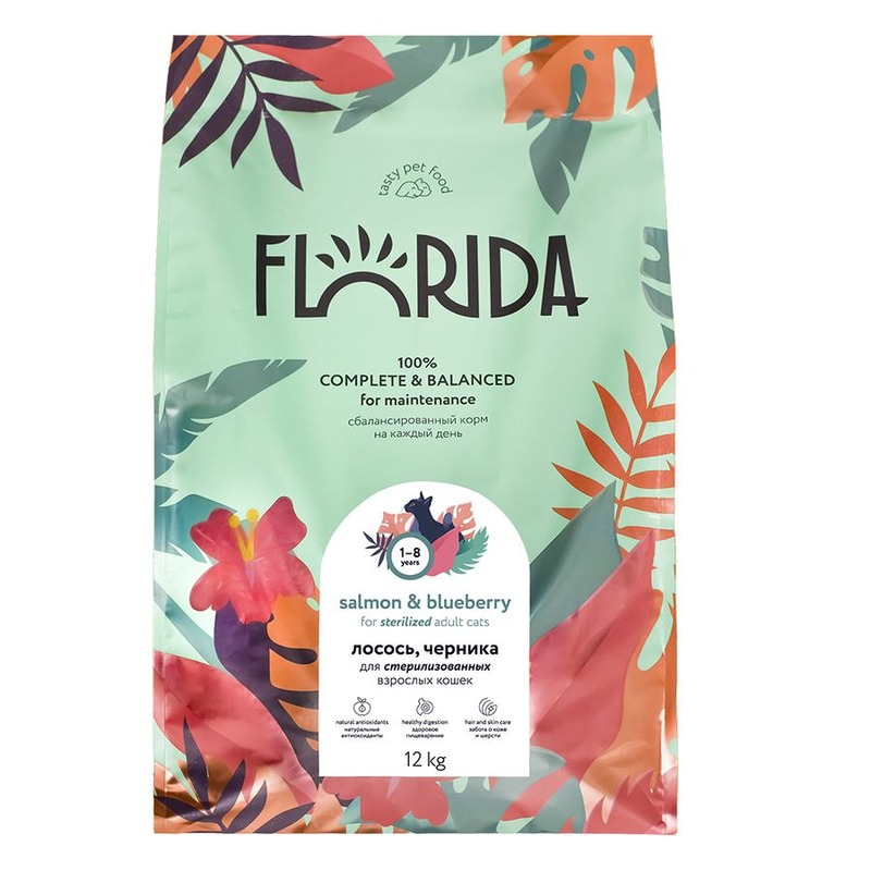 Florida Salmon & Blueberry представляет собой сухой корм суперпремиум класса с лососем и черникой, разработанный специально для стерилизованных кошек в возрасте от 1 до 8 лет. Это сбалансированное полнорационное питание, которое способствует здоровью кожи и шерсти вашего питомца, а также здоровому пищеварению. Все корма Florida содержат только животный белок, что делает их особенно полезными.