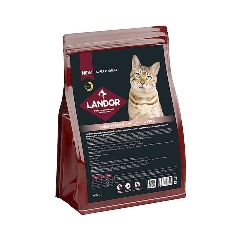 Сухой корм Landor Sensitive Adult 0,4 кг - полнорационный сухой корм для кошек с индейкой и уткой 0,4 кг, предназначен для животных с чувствительным пищеварением: