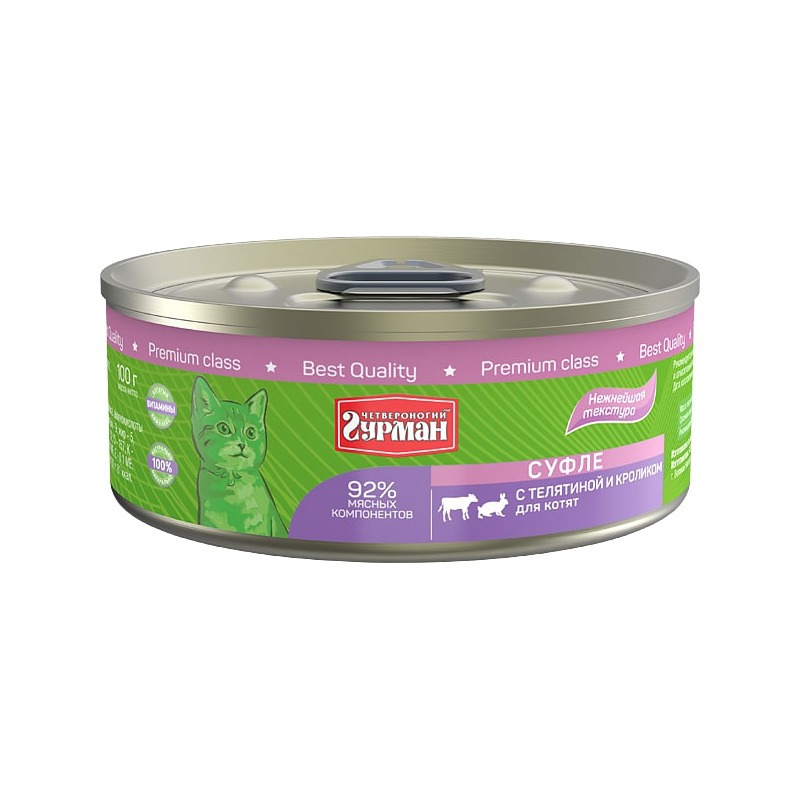 Четвероногий гурман “Суфле” для котят – это влажный корм премиум класса, приготовленный по уникальной рецептуре из самых привлекательных для котят видов мяса и субпродуктов. Главная отличительная особенность данной линейки – нежнейшая воздушная текстура, которая придется по вкусу самым привередливым котятам. Корм полностью натуральный – в его составе нет искусственных красителей, ароматизаторов, усилителей вкуса и ГМО. Подходит для котят всех пород с 6 месяцев.