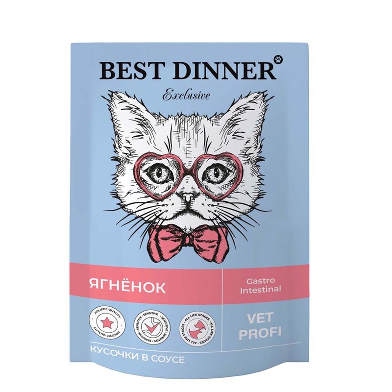 Best Dinner Exclusive Vet Profi Gastro Intestinal полнорационный влажный корм для кошек, для профилактики заболеваний ЖКТ, с ЯГНЕНКОМ, кусочки в соусе, в паучах - 85 г ветеринарный супер премиум для всех возрастов с ягненком для всех пород паучи Российски