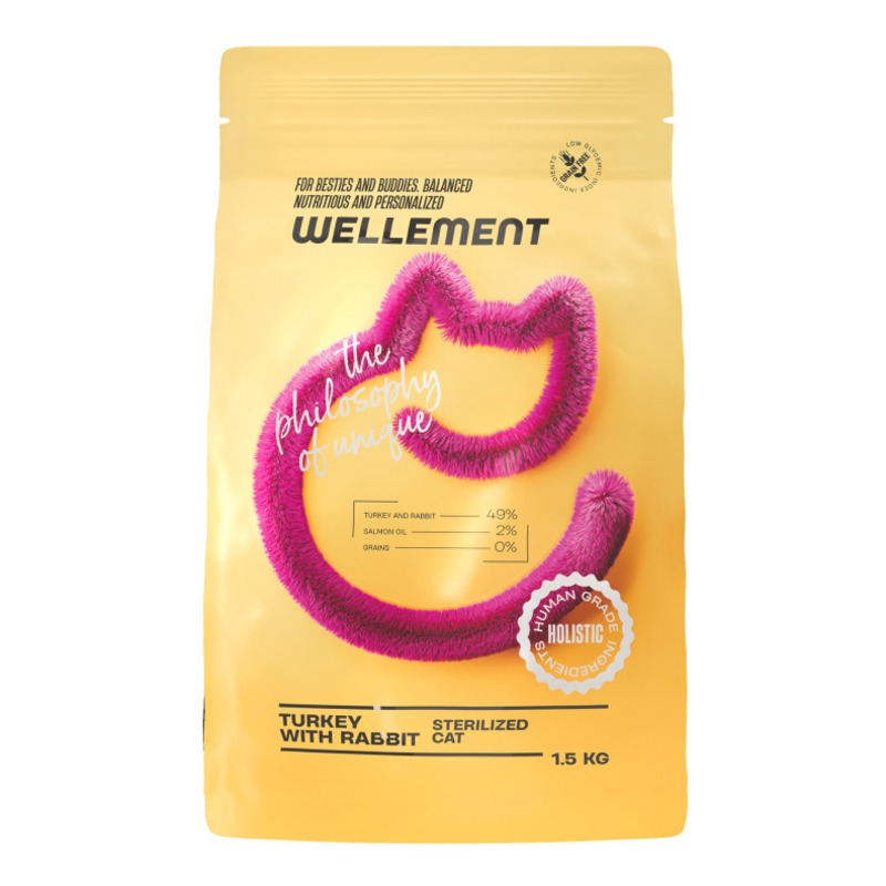 Wellement для стерилизованных кошек с индейкой и кроликом содержит высокое содержание протеина, при этом имеет низкий уровень углеводов и жиров, что позволяет кошке получить необходимую энергию, не набирая лишний вес. А если ваш котик или кошечка мало пьет, то вы можете комбинировать сухой корм
