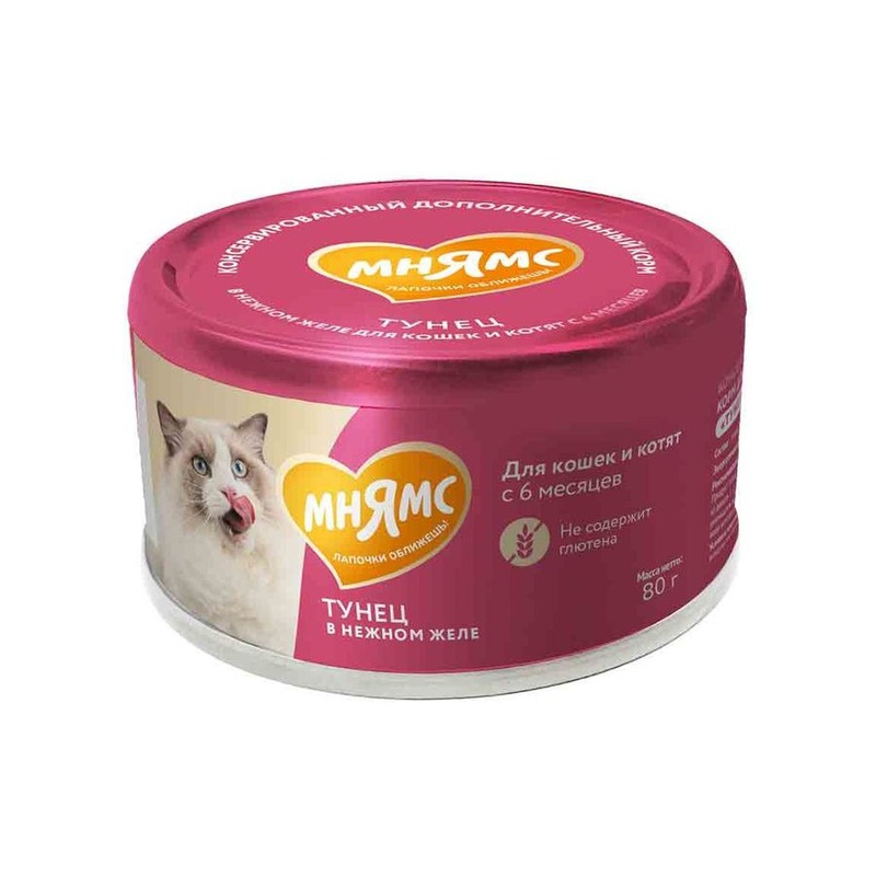 Консервированный дополнительный корм для кошек и котят старше 6 месяцев "Тунец в нежном желе" 80 г. Содержит в составе натуральное мясо стейковой части тунца, которое хорошо усваиваются организмом и имеет высокую питательную ценность и вкусовую привлекательность. Корм "Тунец в нежном желе" рекомендуется использовать в качестве дополнительного источника питания к основному рациону вашей кошки. При этом важно учитывать индивидуальные потребности животного, включая его вес, возраст и уровень активности. Кошкам весом 1-3 кг рекомендуется давать 1 банку в день, кошкам весом 4 кг и выше - 2-4 банки. Свежая вода всегда должна быть доступна вашему питомцу. Прекрасно подходит привередливым кошкам, а также питомцам со сниженным потреблением воды. «Мнямс» консервированный дополнительный корм для для кошек и котят старше 6 месяцев "Тунец в нежном желе" гарантирует, что ваш питомец получит только качественный и вкусный продукт, который прекрасно разнообразит его рацион, поддержит здоровье и обеспечит энергией.