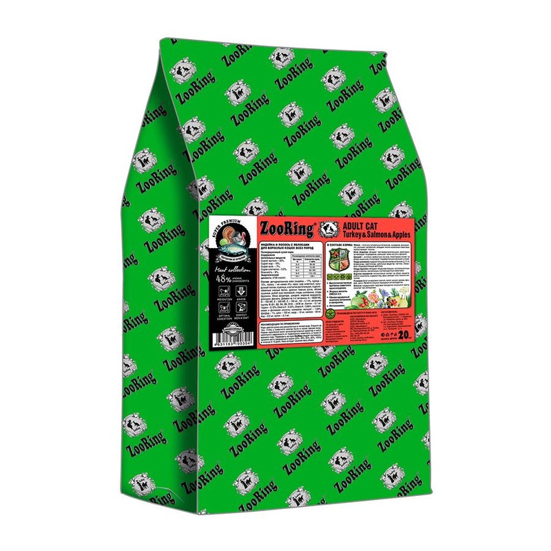 Zooring Adalt Cat сухой корм для кошек, с ИНДЕЙКОЙ, ЛОСОСЕМ и яблоком - 20 кг повседневный супер премиум низкозерновые для взрослых с индейкой мешок Российский корм 1 уп. х 1 шт. х 20 кг