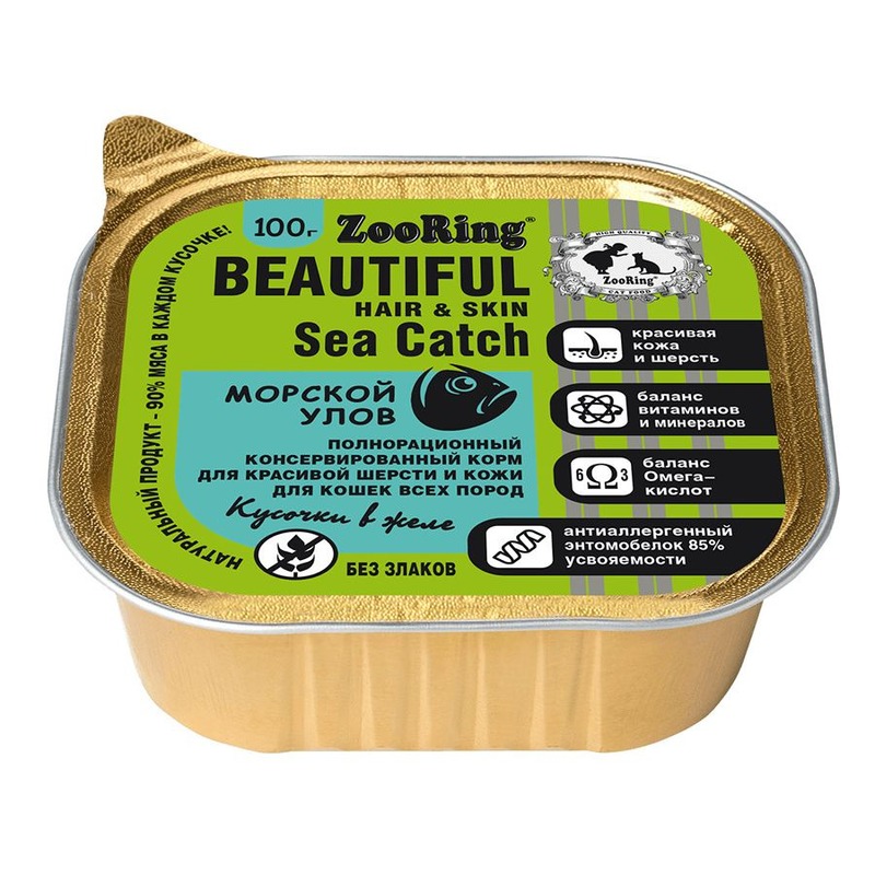 ZooRing Морской Улов влажный корм для кошек, для здоровья шерсти, с львинкой, в желе, в консервах - 100 г