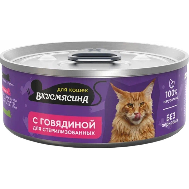ВКУСМЯСИНА - это корм, приготовленный с учетом потребностей и предпочтений животных. В его рецептуре самые вкусные и лакомые для кошек мясные компоненты. Корм полностью натуральный. Он подходит для стерилизованых кошек и кастрированных котов и обеспечивает питомцам необходимые жизненные силы и энергию! Не содержит зерновых, сои, искусственных красителей, ароматизаторов, генномодифицированных ингредиентов.