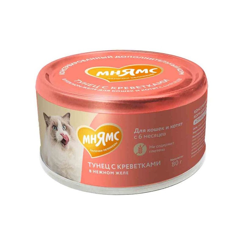 Консервированный дополнительный корм для кошек и котят старше 6 месяцев "Тунец с креветками в нежном желе" 80 г. Содержит в составе натуральное мясо стейковой части тунца и очищенные креветки, которые хорошо усваиваются организмом и имеют высокую питательную ценность и вкусовую привлекательность. Корм "Тунец с креветками в нежном желе" рекомендуется использовать в качестве дополнительного источника питания к основному рациону вашей кошки. При этом важно учитывать индивидуальные потребности животного, включая его вес, возраст и уровень активности. Кошкам весом 1-3 кг рекомендуется давать 1 банку в день, кошкам весом 4 кг и выше - 2-4 банки. Свежая вода всегда должна быть доступна вашему питомцу. Прекрасно подходит привередливым кошкам, а также питомцам со сниженным потреблением воды. «Мнямс» консервированный дополнительный корм для для кошек и котят старше 6 месяцев "Тунец с креветками в нежном желе" гарантирует, что ваш питомец получит только качественный и вкусный продукт, который прекрасно разнообразит его рацион, поддержит здоровье и обеспечит энергией.