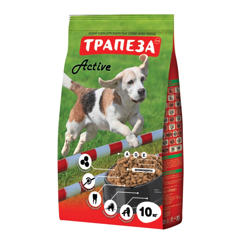 Сухой корм для собак "Трапеза ACTIVE” — специально разработан для повседневного кормления активных собак средних пород с повышенными физическими нагрузками.. Рекомендуется использовать в качестве основного рациона активных, спортивных, служебных и охотничьих собак, а также кормления взрослых собак вольерного содержания, собак в периоды активной дрессуры и восстановления после больших физических нагрузок
